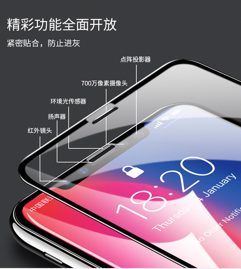 9D新工艺,全屏覆盖更耐用,使用寿命增强更耐磨,告别频繁换膜,一体式全覆盖不翘边,不顶膜,高清透,滴水成珠,强抗指纹,匠心之作,抗蓝光,防爆防摔,无缝贴合!
