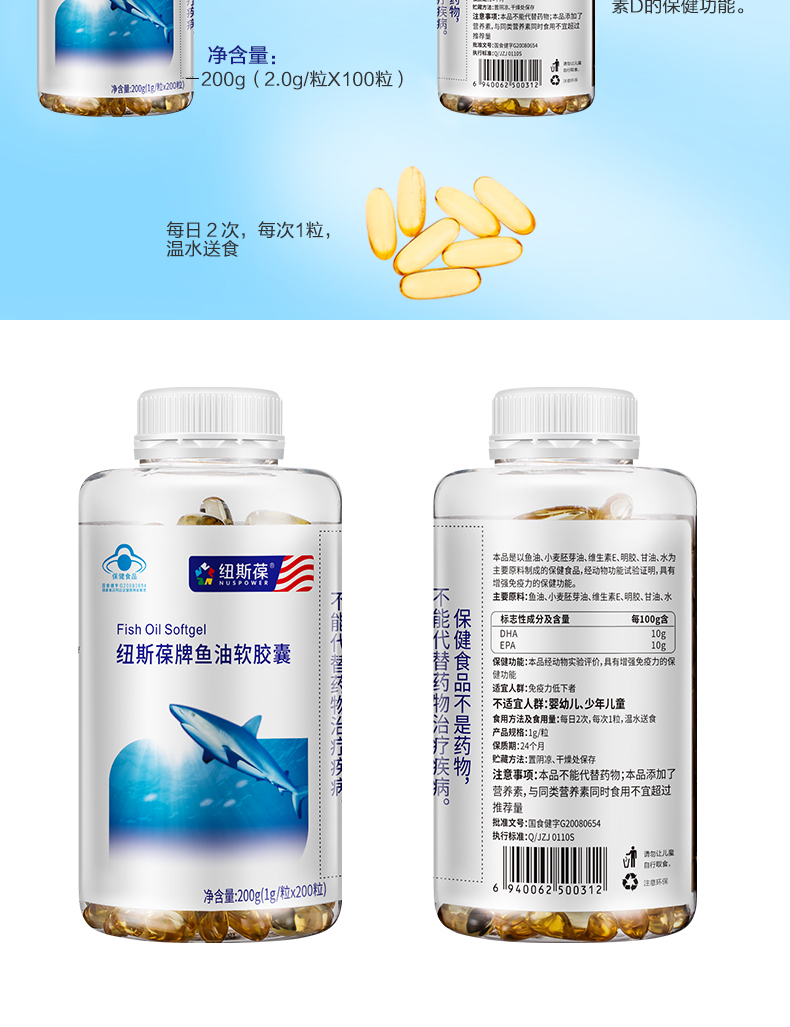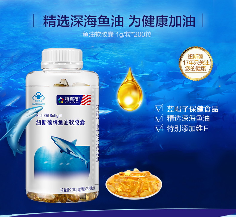 全店满200返200】纽斯葆牌鱼油软胶囊200粒深海搭配鱼肝油中老年
