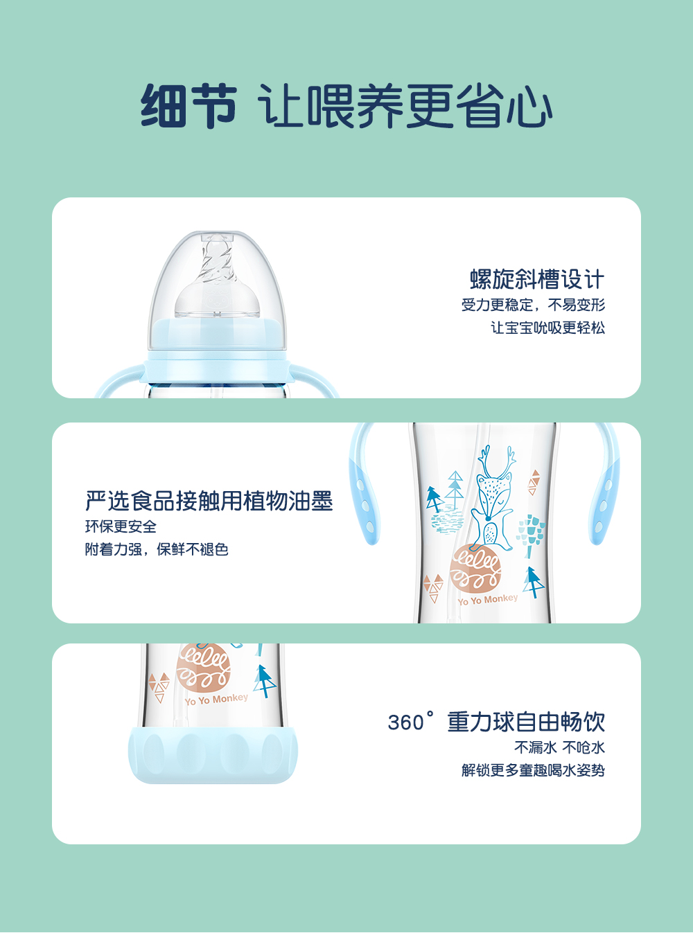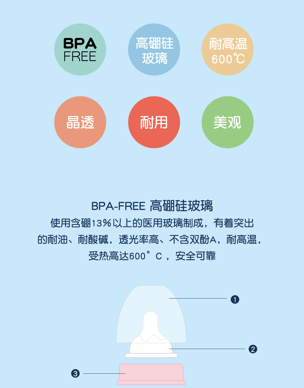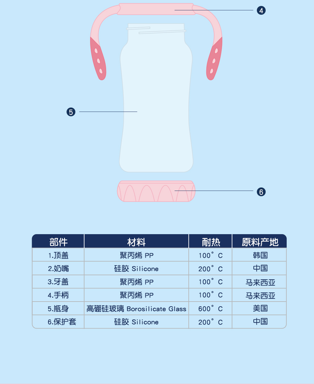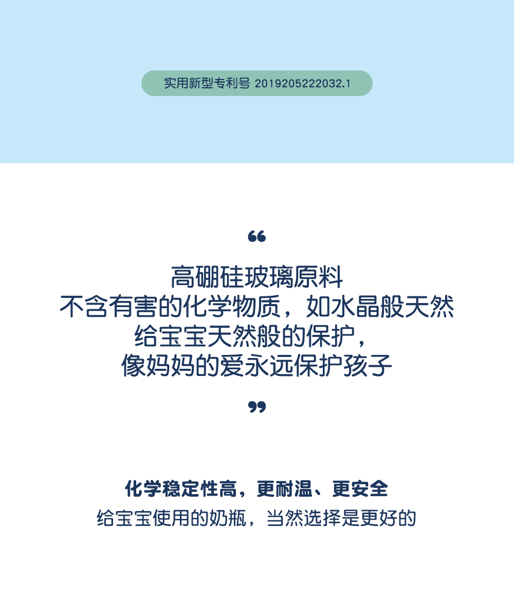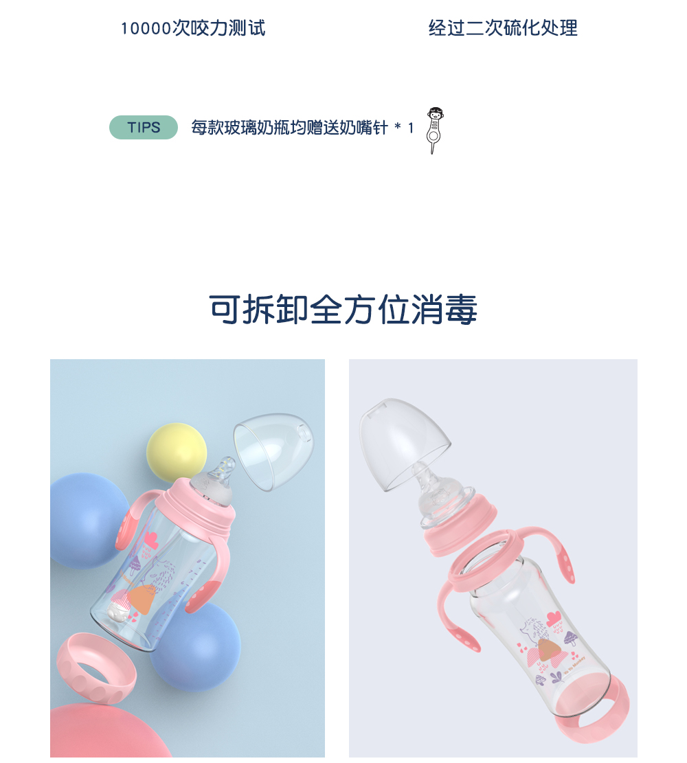 20年出口婴儿用品制造经验,进口玻璃,二次硫化天然硅胶奶嘴,欧盟标准,宝宝入嘴安全放心。