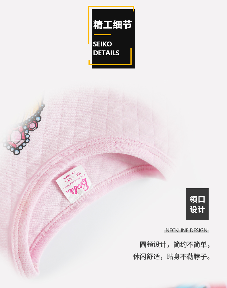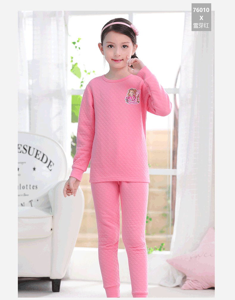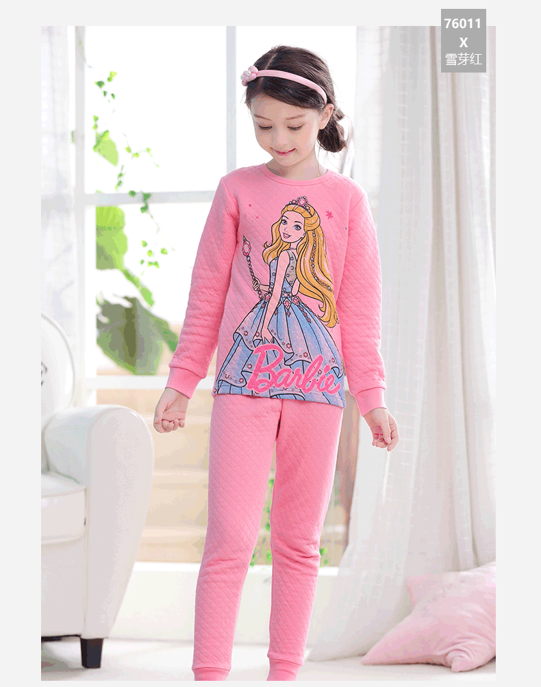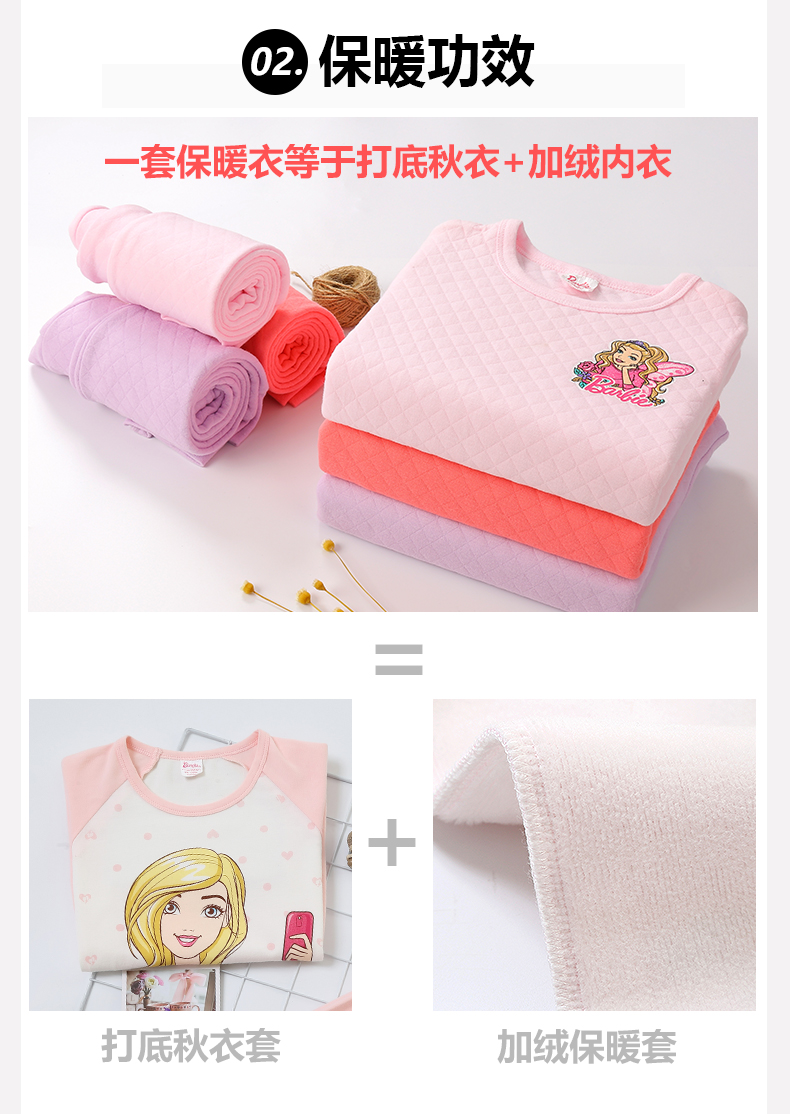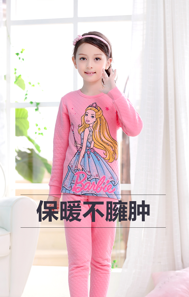 芭比三层保暖内衣,采用健康面料,里层/表面层采用纯棉,圆领设计,方便穿脱,健康印染技术,图案清晰美观,螺纹袖口,有弹力,防风保暖,柔软,舒适,保暖,贴身呵护你的宝贝!赠运费险