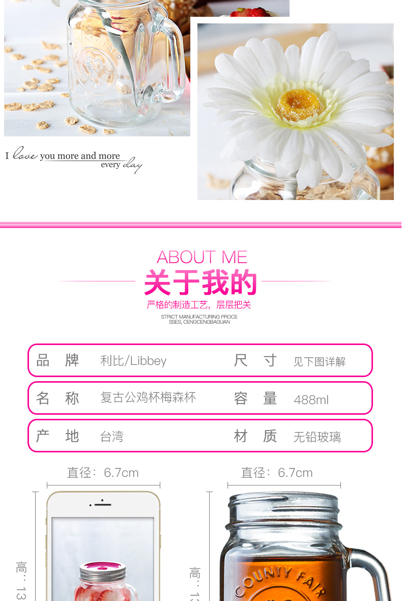 Libbey利比玻璃水杯子公鸡杯梅森杯果汁茶杯咖啡杯奶茶牛奶家用