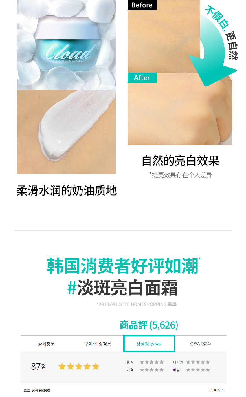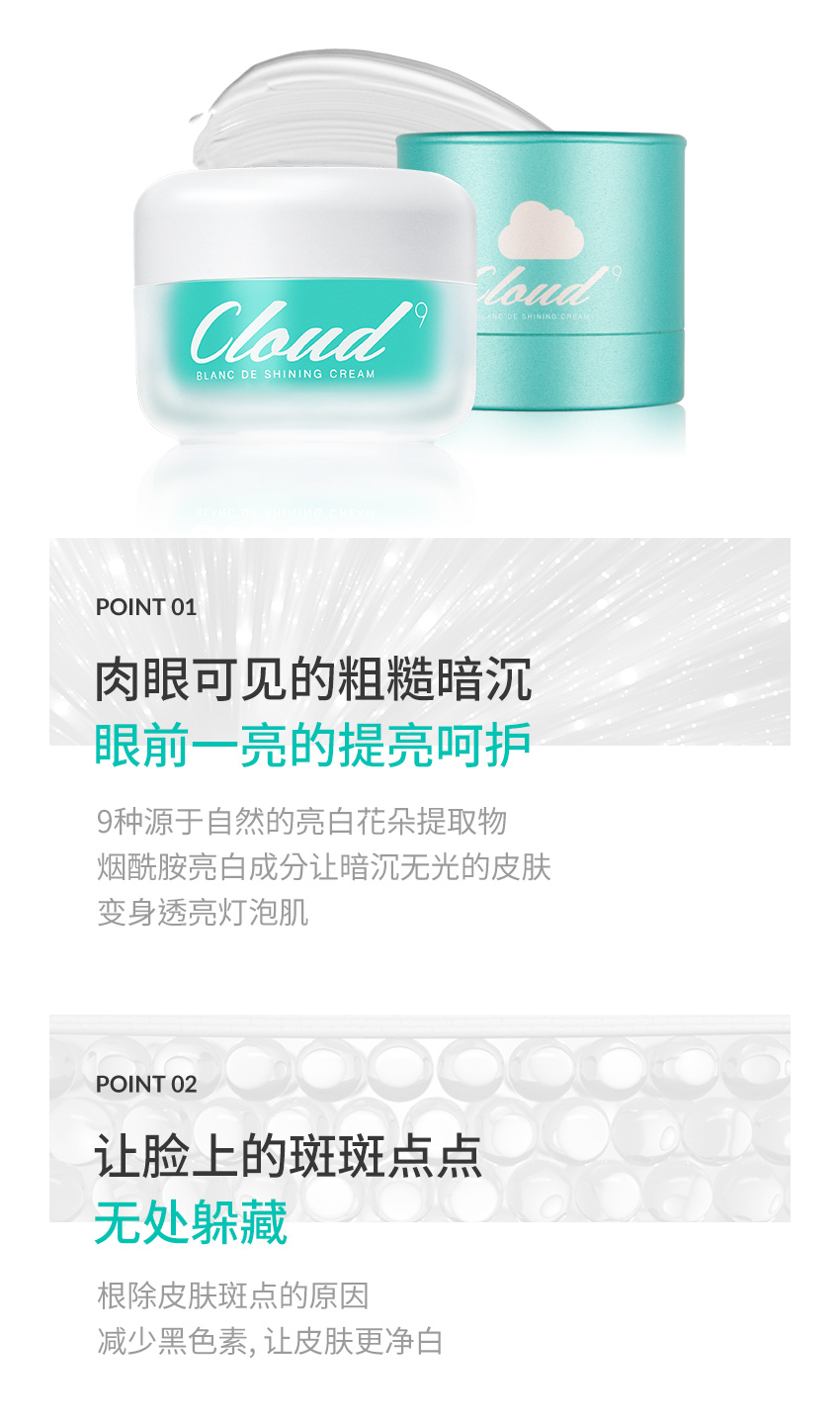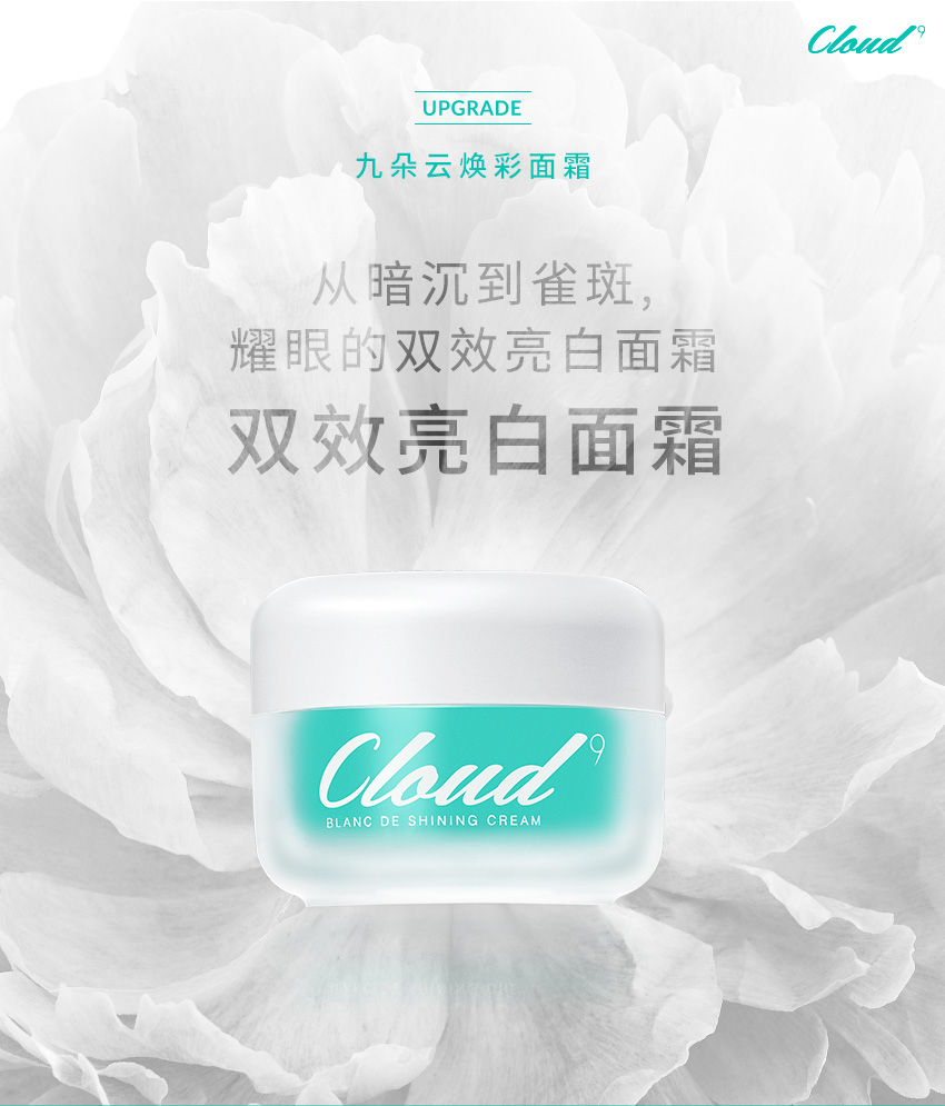 韩国电视购物三大化妆品之一,九朵云焕彩面霜,一瓶解决多种肌肤问题,提亮肤色、持久保湿、焕白淡斑,多种植物精粹,绽现晶透无暇肌。一触及化,清醒怡人。你值得拥有