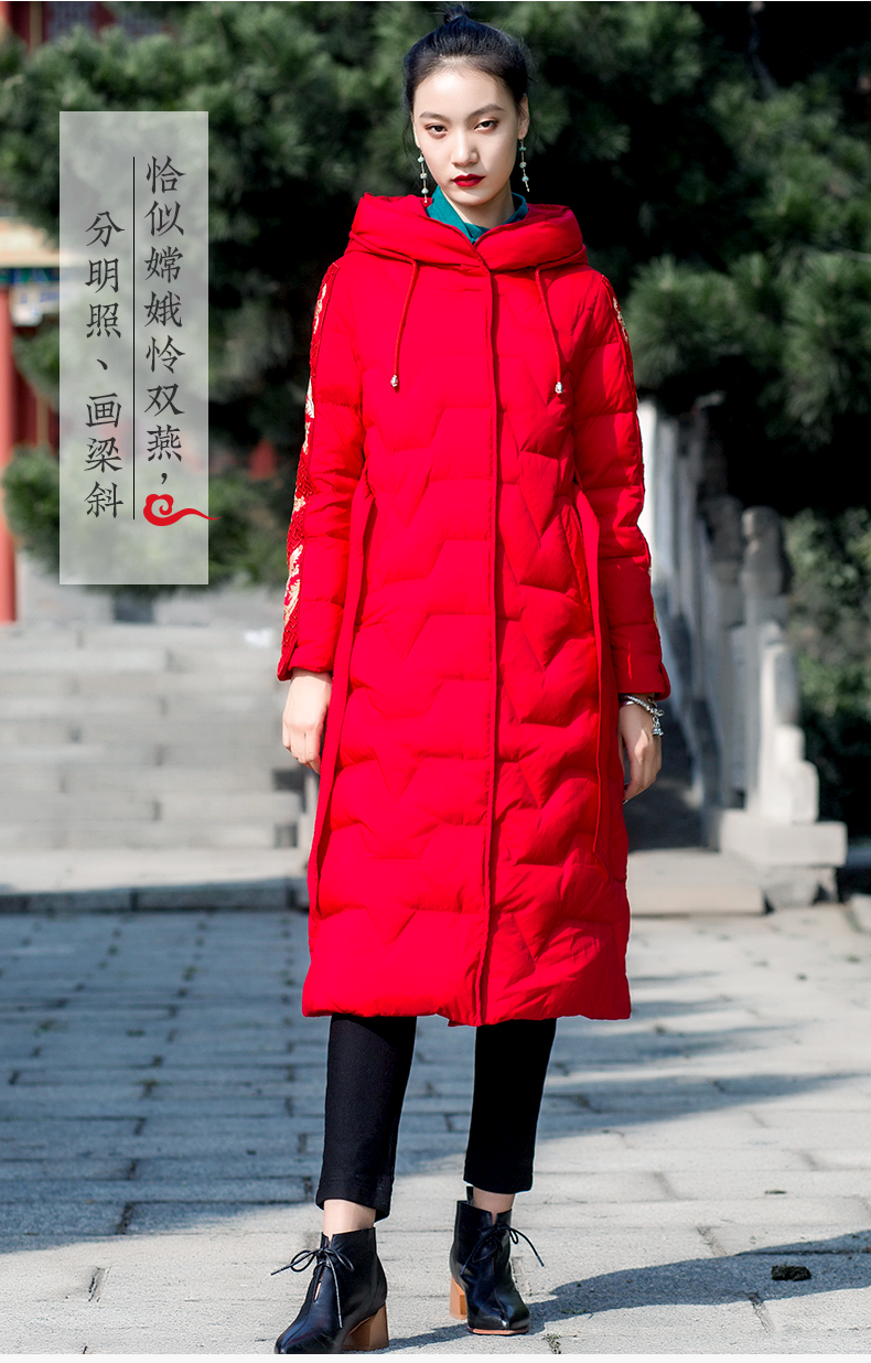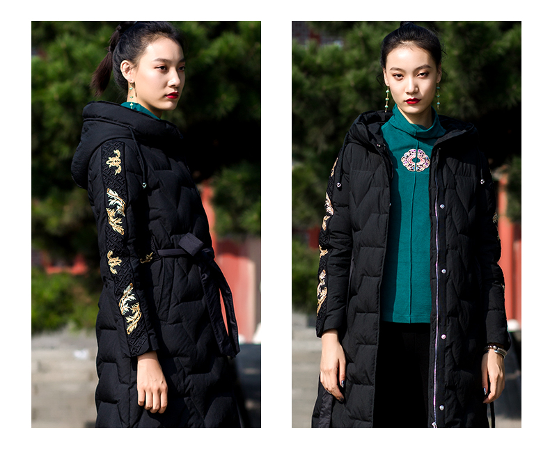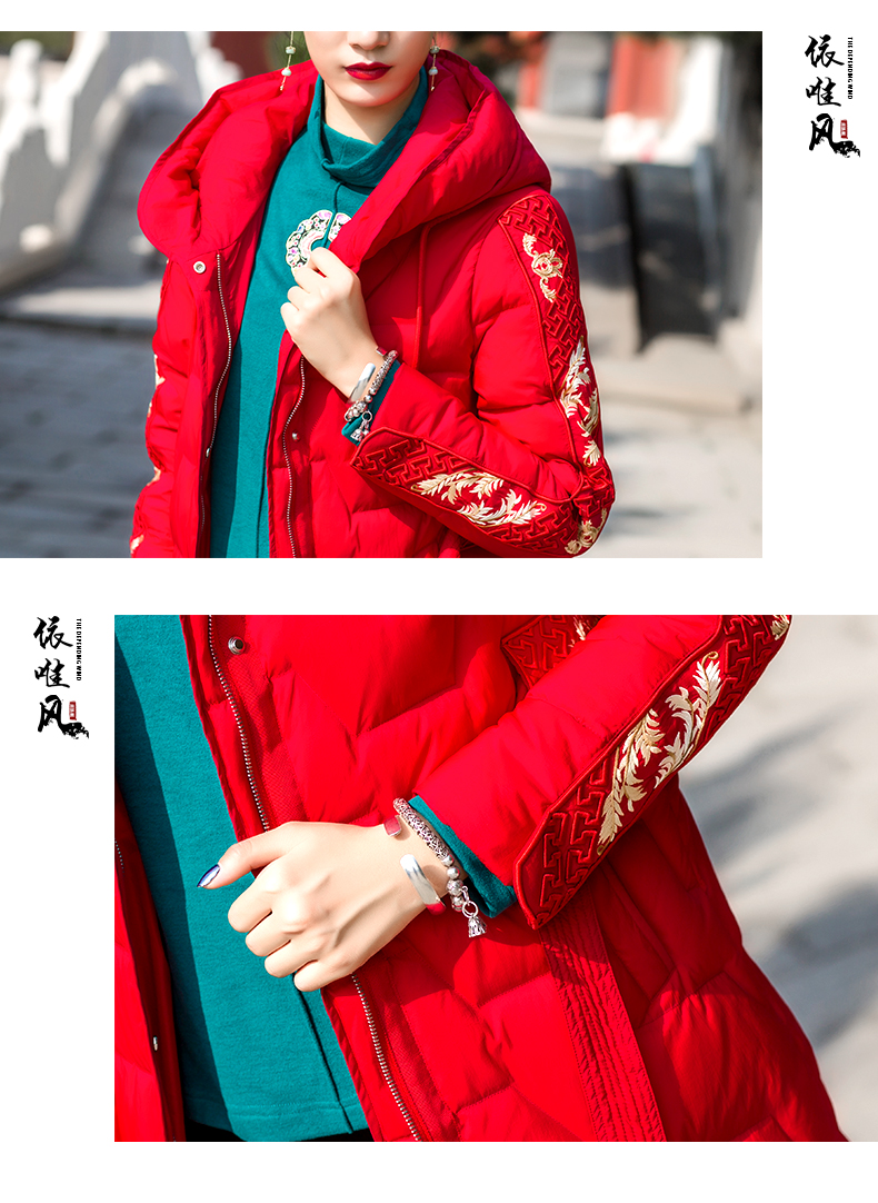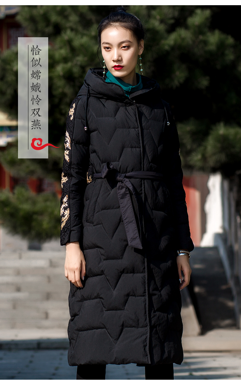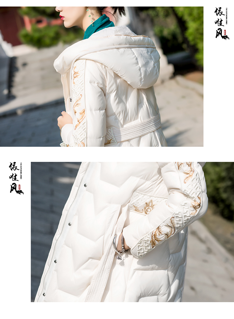 依唯风中国风刺绣白鸭绒过膝轻奢正品连帽民族风绣花羽绒服女长款