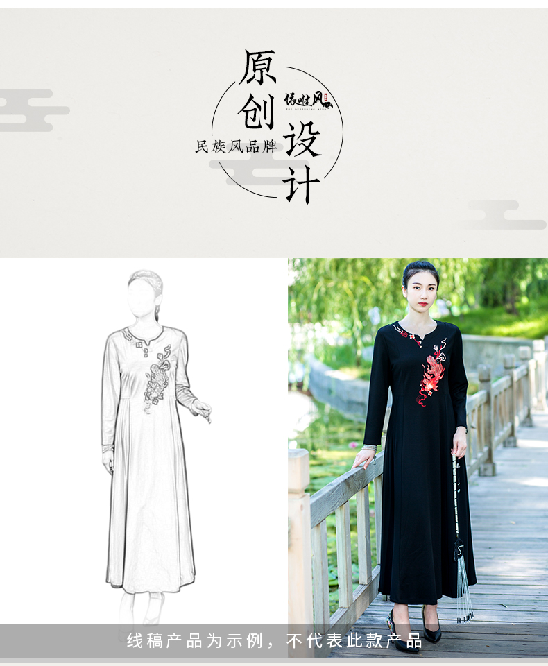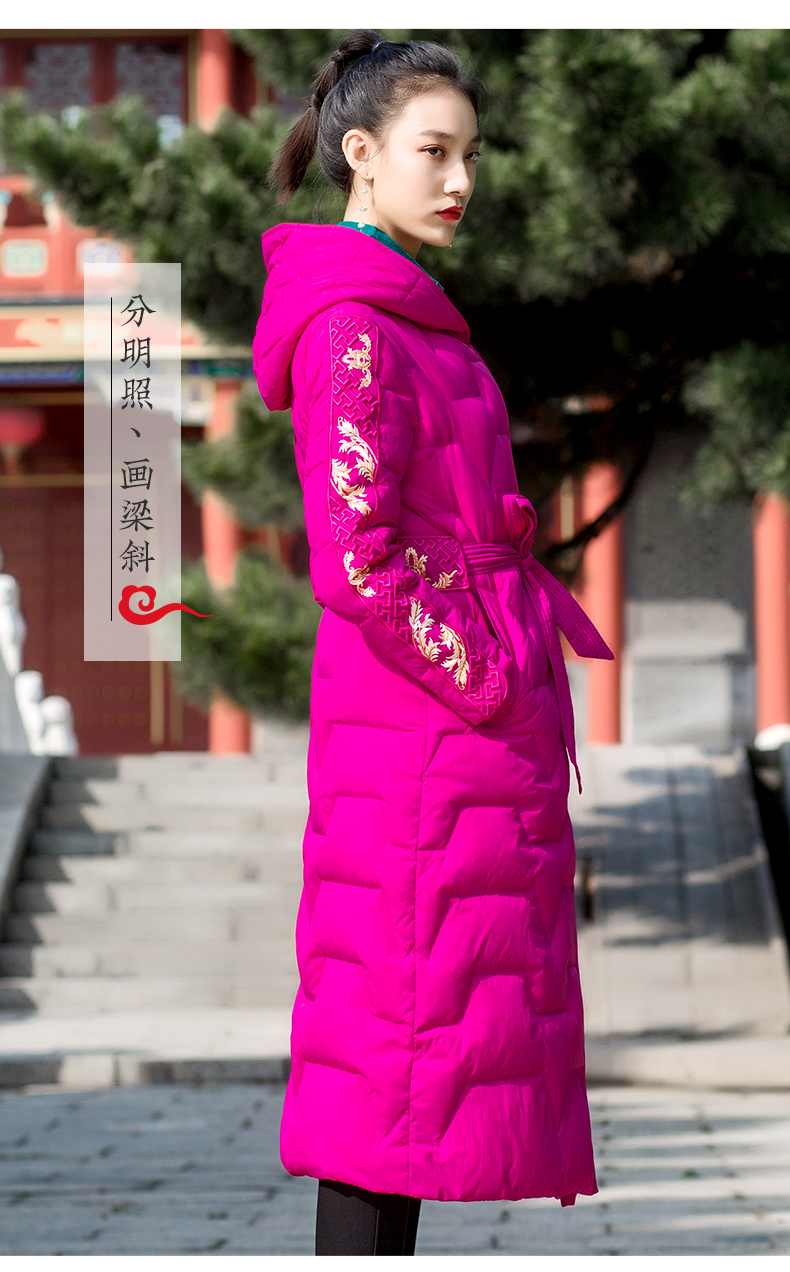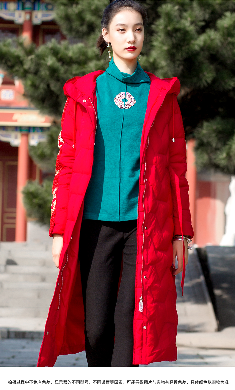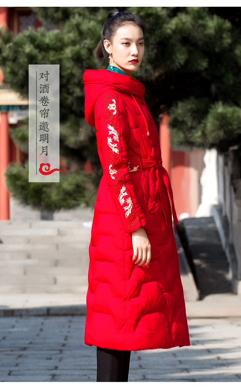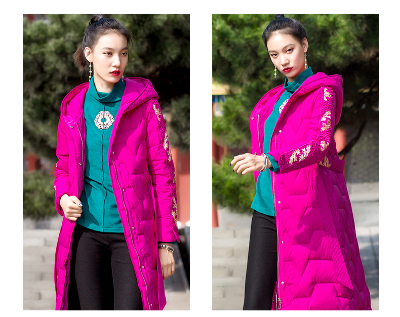 依唯风中国风刺绣白鸭绒过膝轻奢正品连帽民族风绣花羽绒服女长款