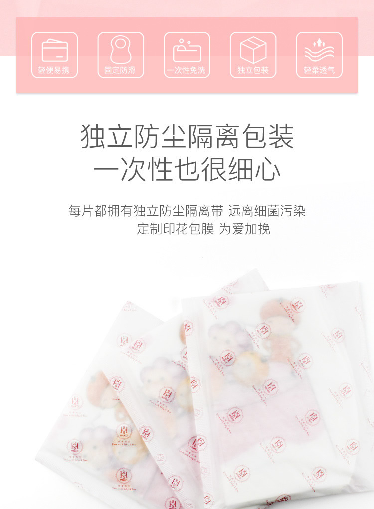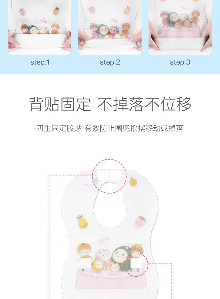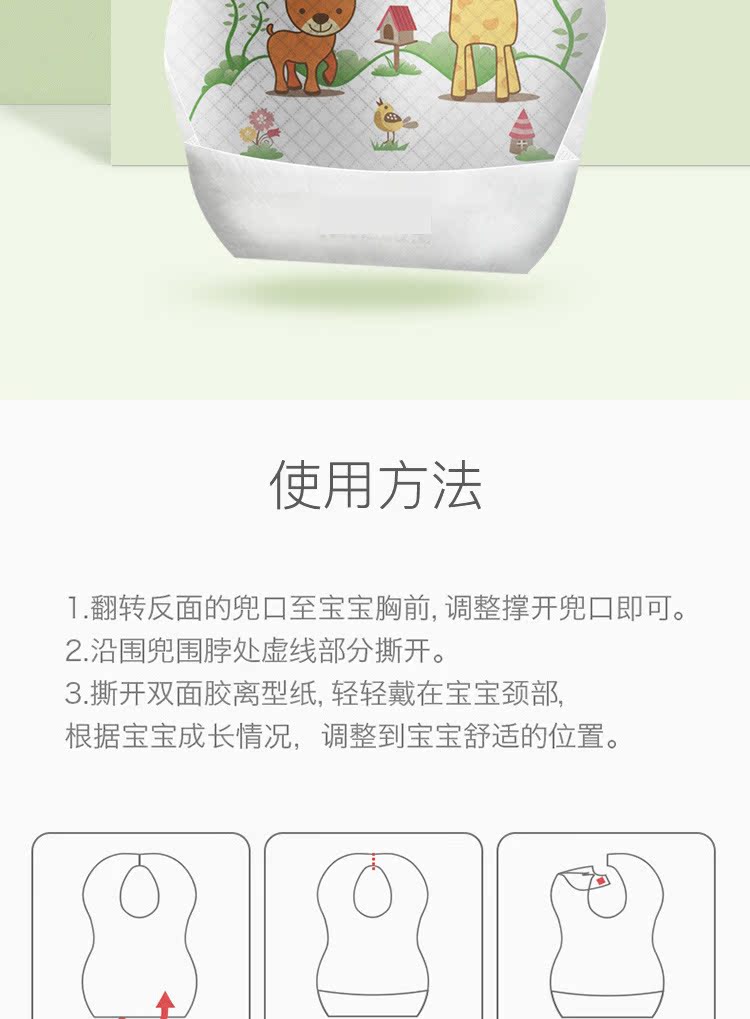 【宝妈必备】独立包装,一次性围兜,即用即抛,免去妈妈换洗烦恼,适合外出携带。使用翻兜设计,轻松穿戴。带有双重固定帖普安,不易掉落移位。便携卫生,适合外出携带,多种用途、饭兜,经济实用。