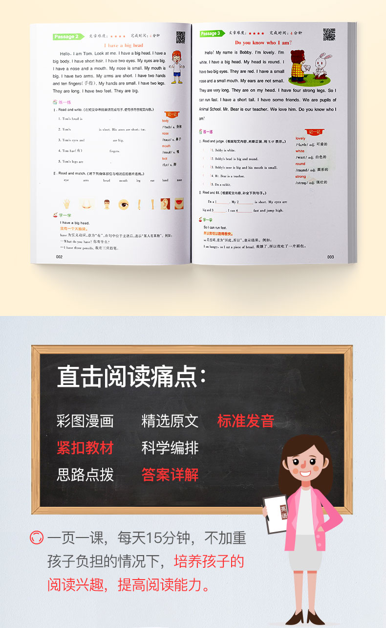 【扫码听原文】全国百所重点小学名师推荐,漫画解读,三年级阅读训练100篇,阶梯强化训练同步,每天5分钟,强化训练,提高孩子英语阅读能力!!