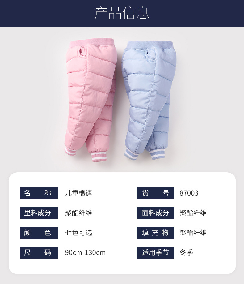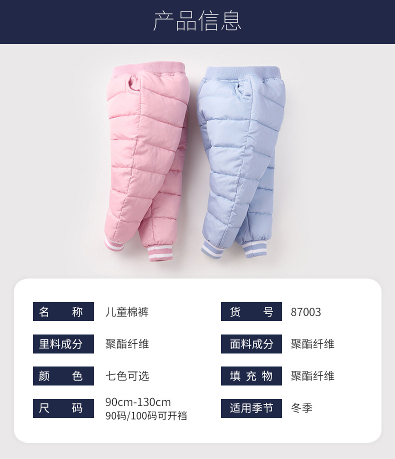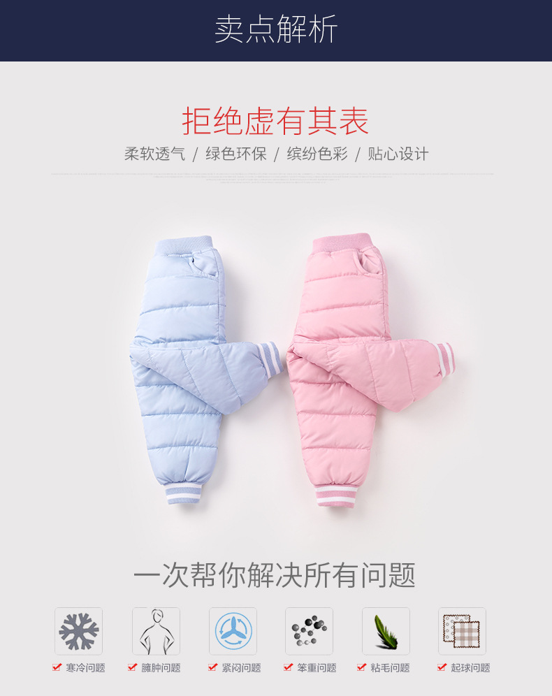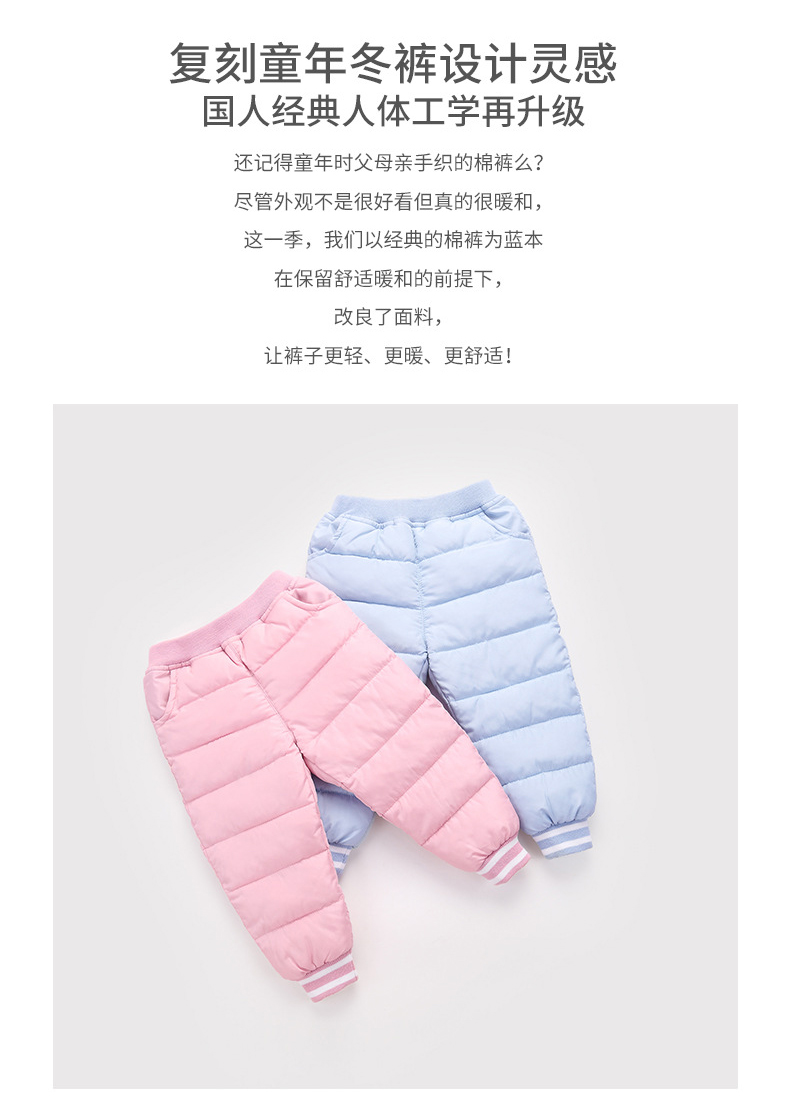 时尚儿童轻型羽绒裤,清爽透气好面料,呵护宝贝宝贝的娇嫩肌肤,精选优质棉花,里料加绒更保暖,安全面料,麻麻放心的选择!