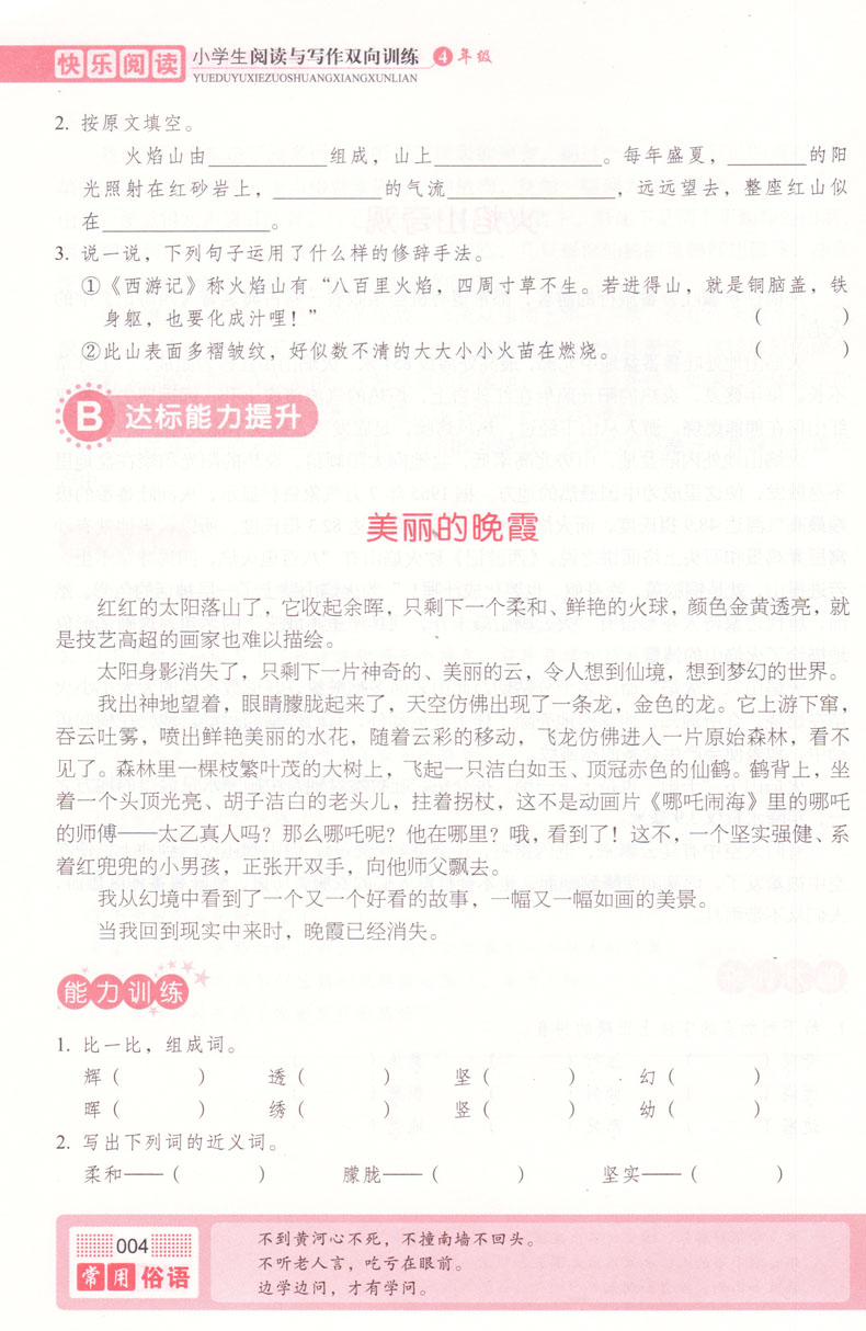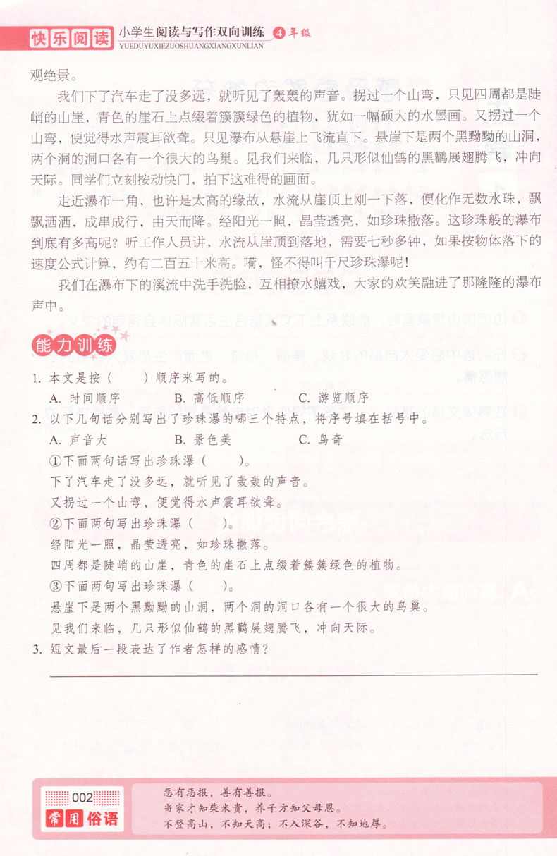2019快乐阅读 小学语文阅读与写作双向训练四年级通用版 4四年级语文阅读短文训练语文阅读理解题专项训练四年级上下册课外阅读