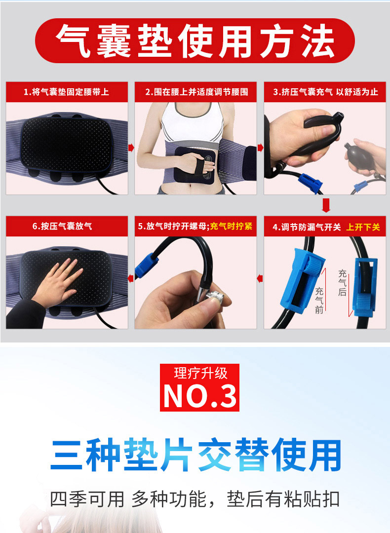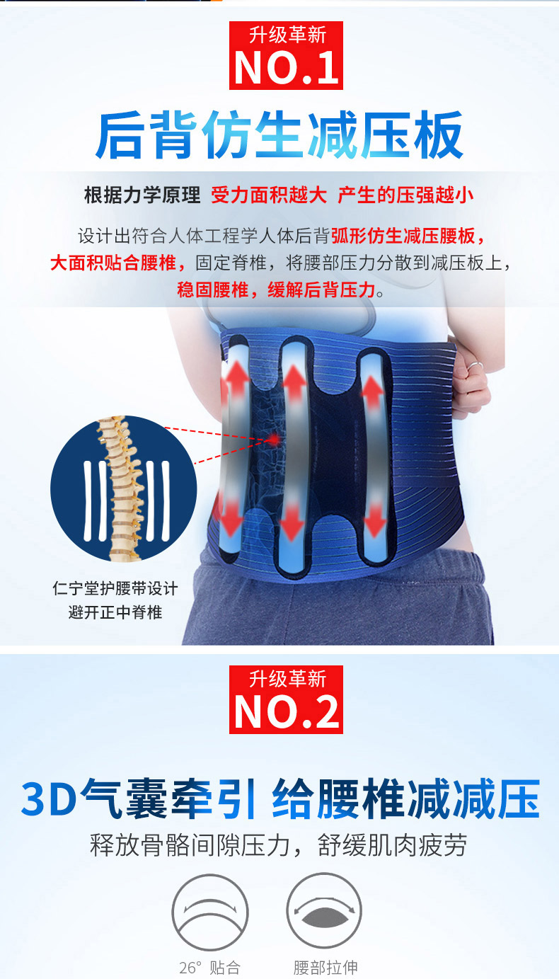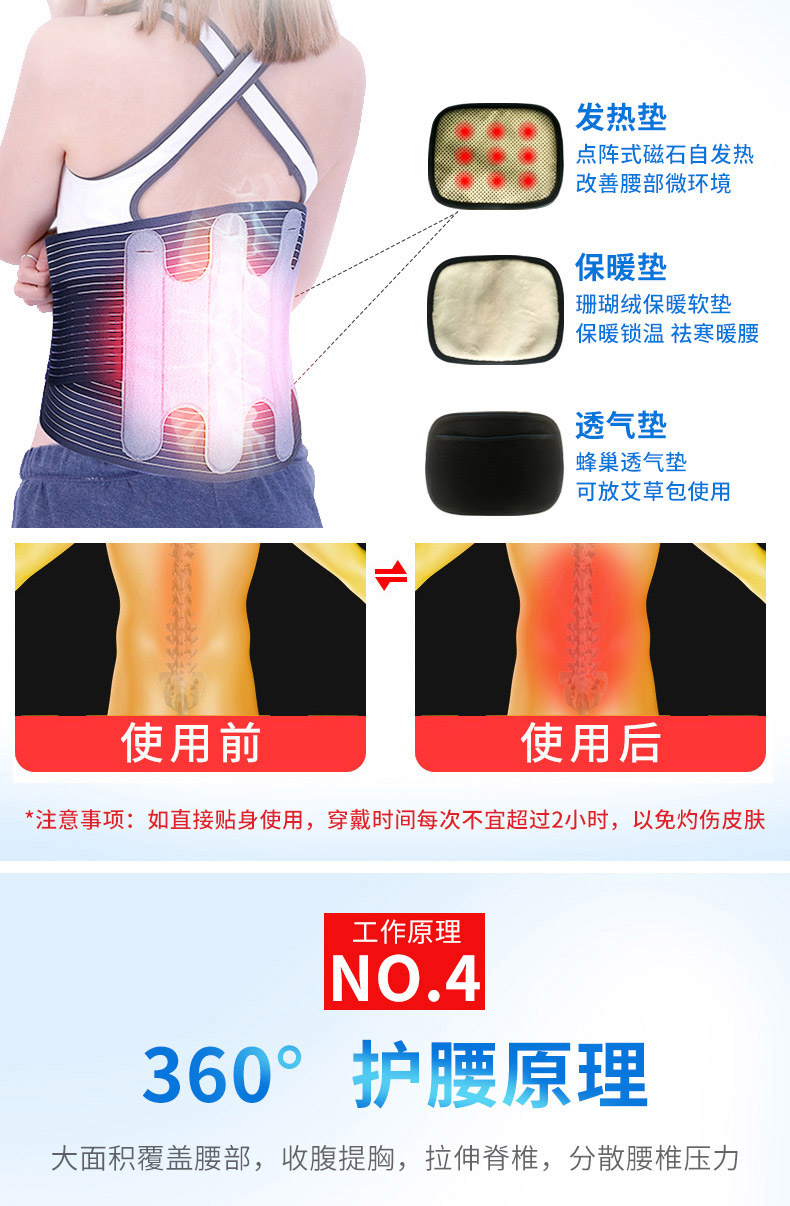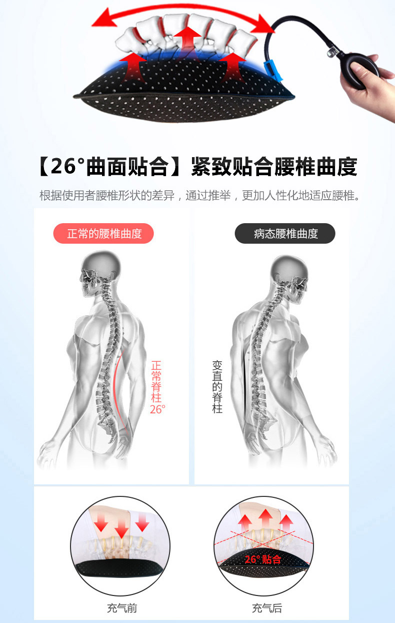 自发热,保暖,透气,三重垫片,3D气囊牵引,恢复健康腰椎26°后背仿生减压板,大面积贴合腰椎,固定脊椎,将腰部压力分散到减压板上,稳固腰椎,缓解后背压力。给予腰部支撑,感觉更加轻松。