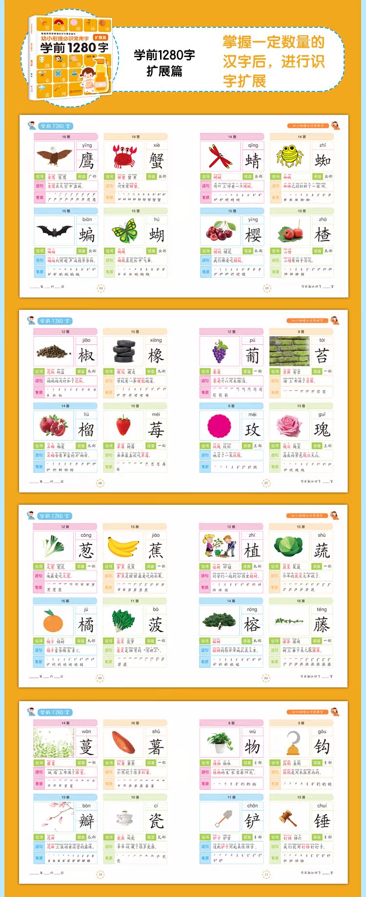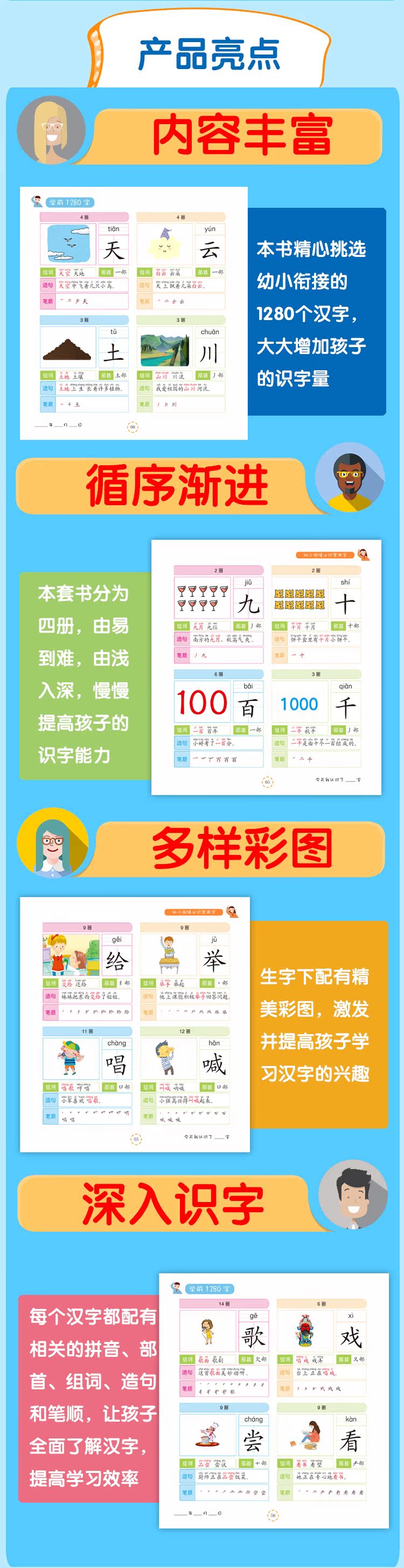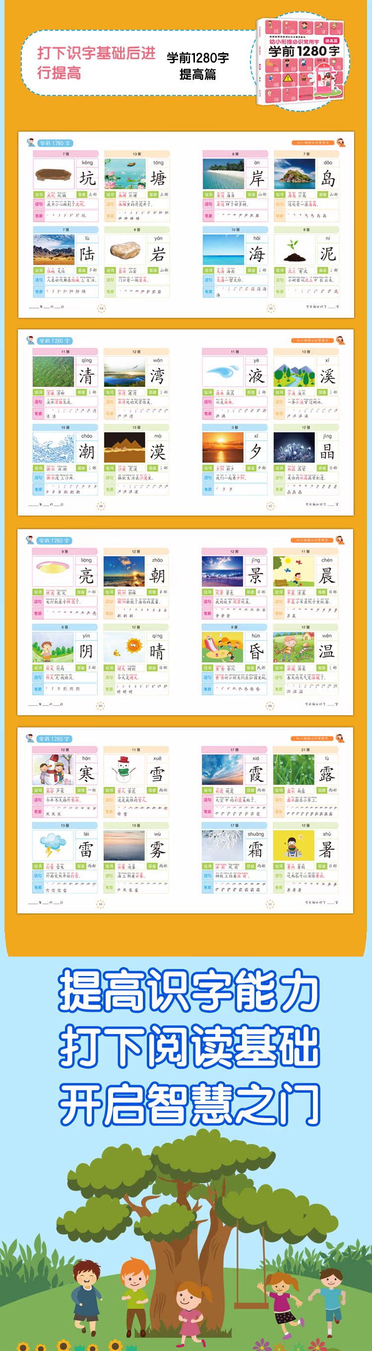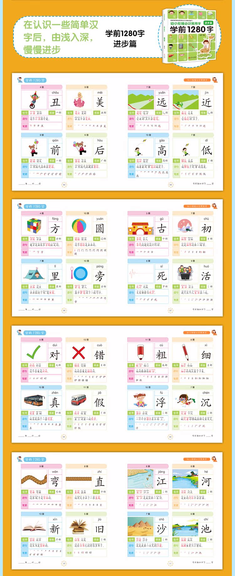 学前1280字4册识字卡片,3-6岁学龄前儿童书籍,幼小衔接幼儿园小班教材用书初学者全套,大班升一年级幼儿早教书有图识字大王宝宝认字书!