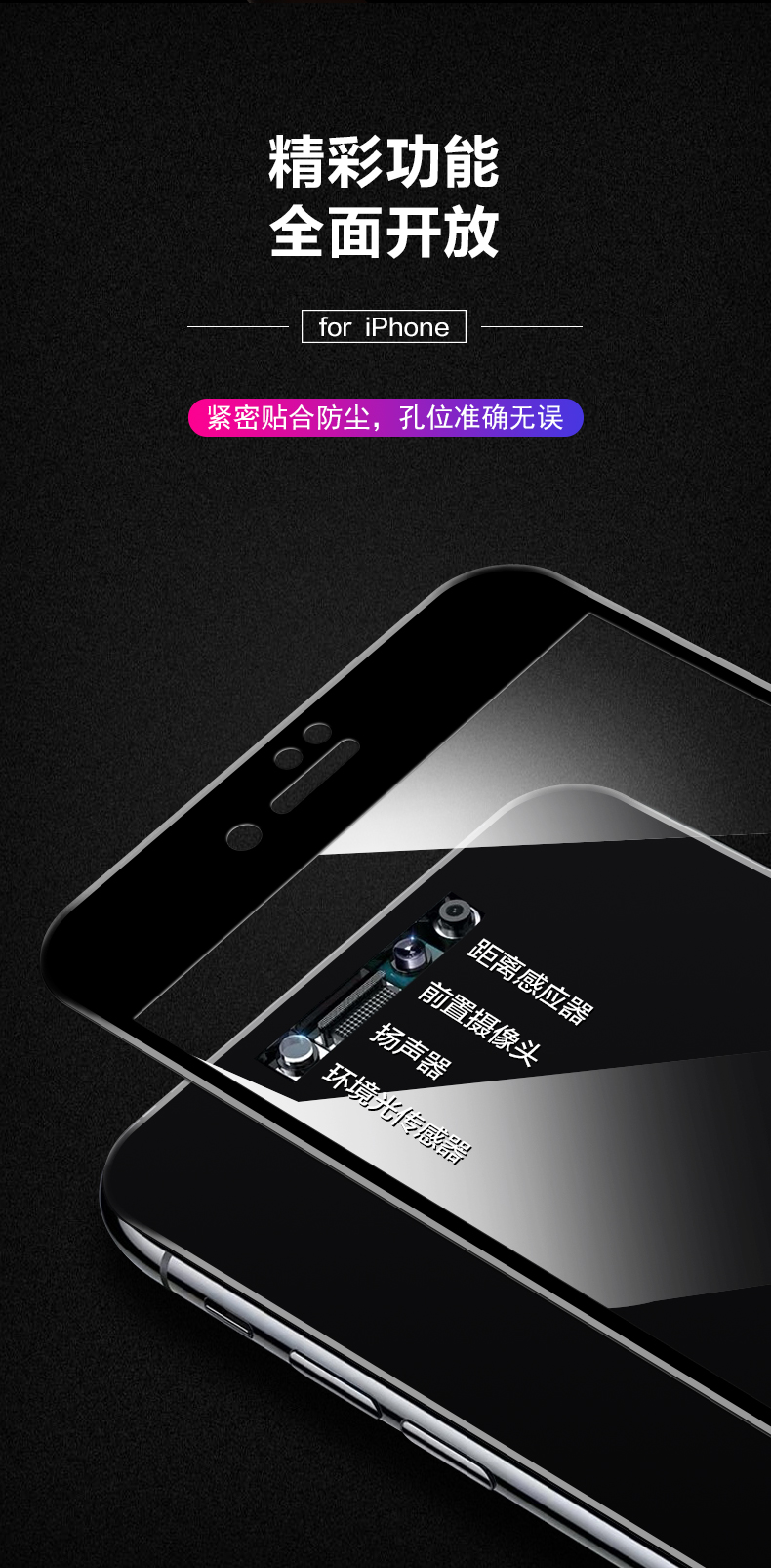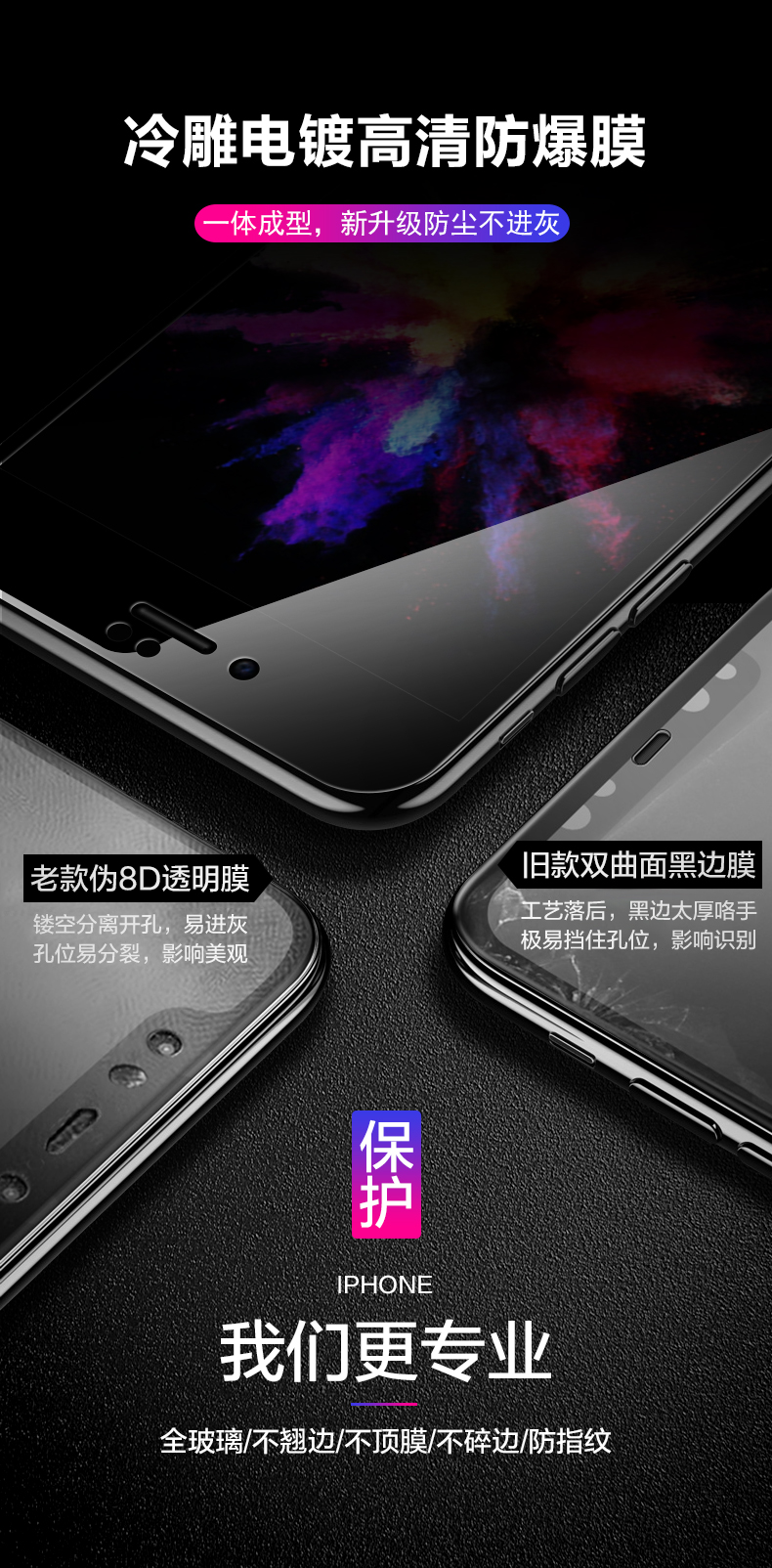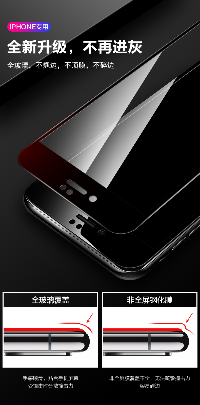 苹果系列钢化膜,真机实测,1:1开模,全屏覆盖,9倍增强硬度,增强不碎边,弧面工艺,触控更灵敏,滴水成珠,易拖动,不沾指纹,防刮耐磨!