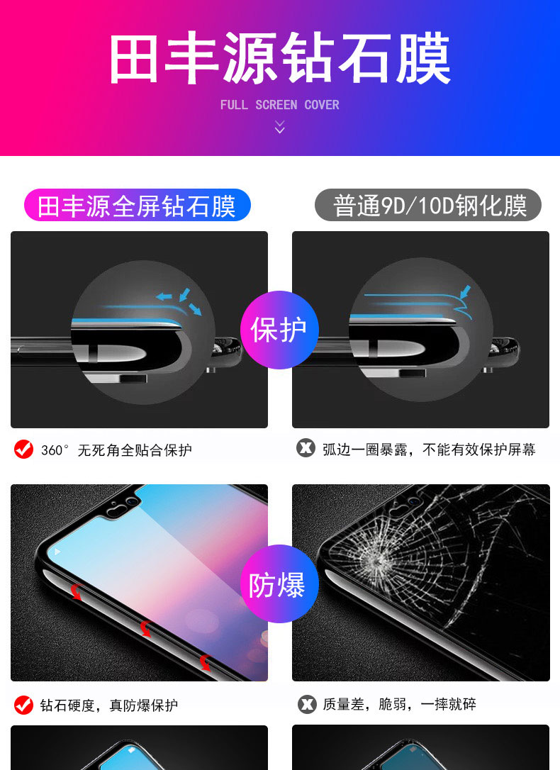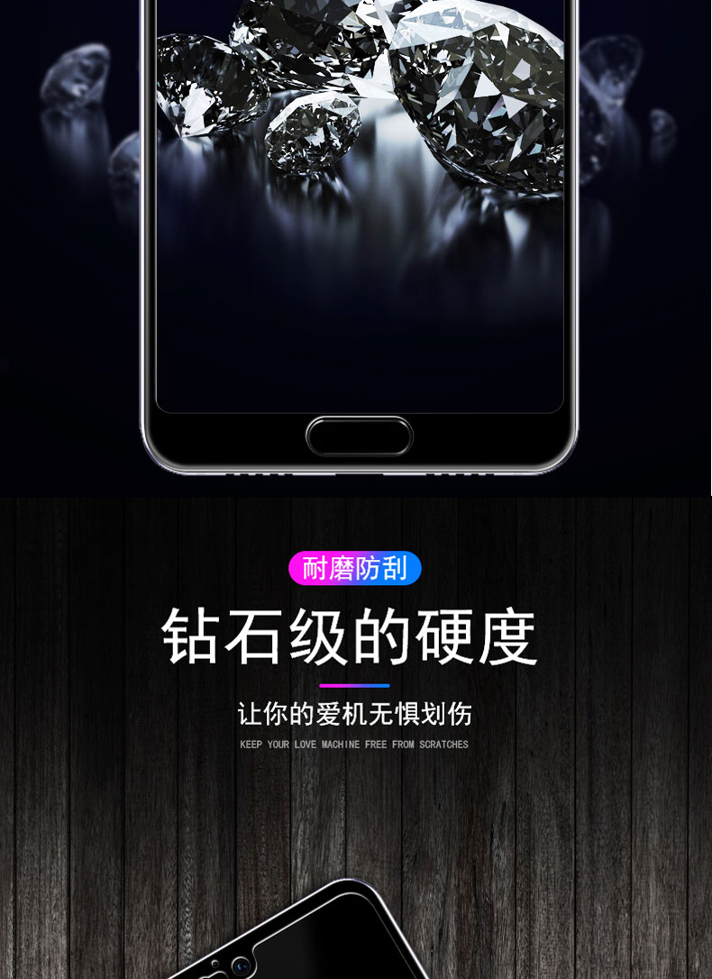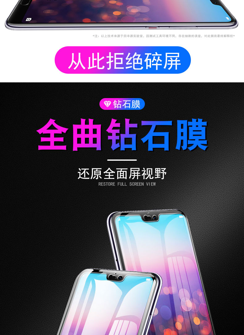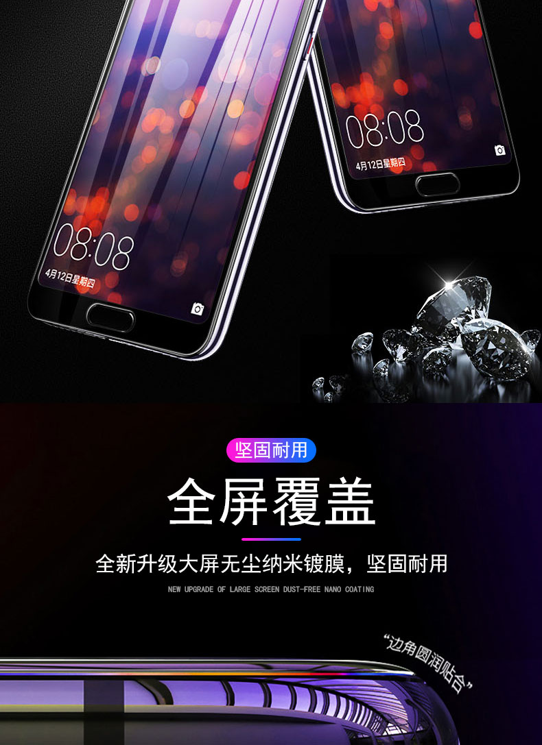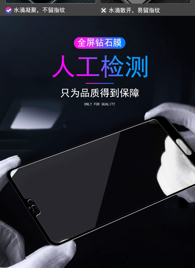 高品质,真9D膜,全屏玻璃全覆盖钢化膜,9倍增强硬度,增强不碎边,弧面工艺,触控更灵敏,滴水成珠