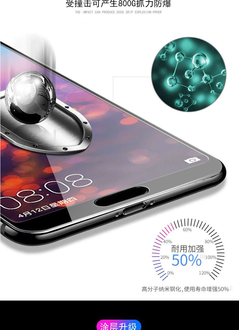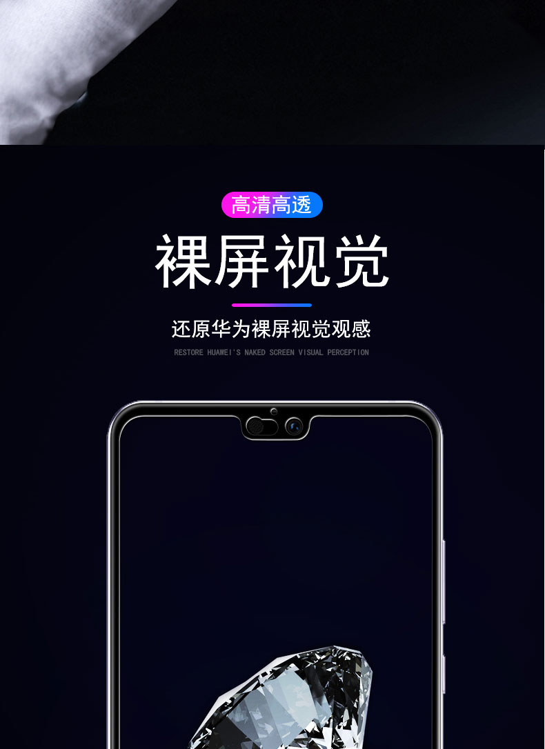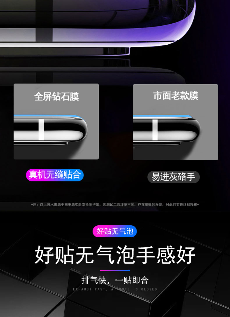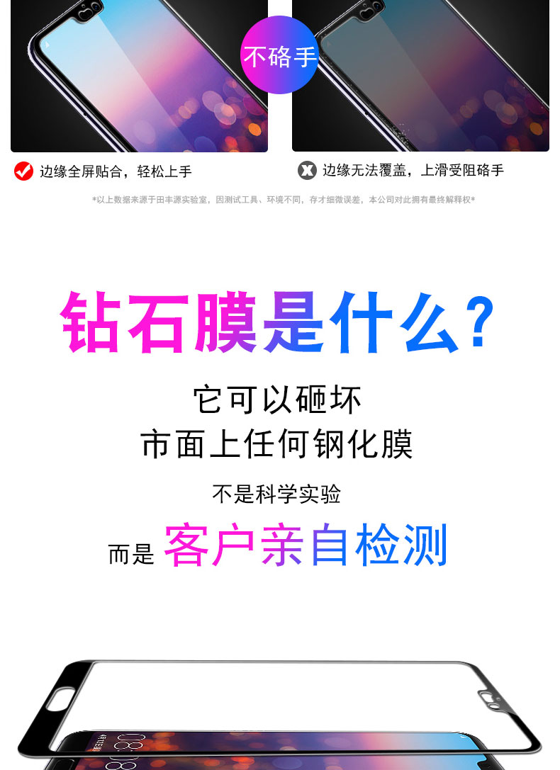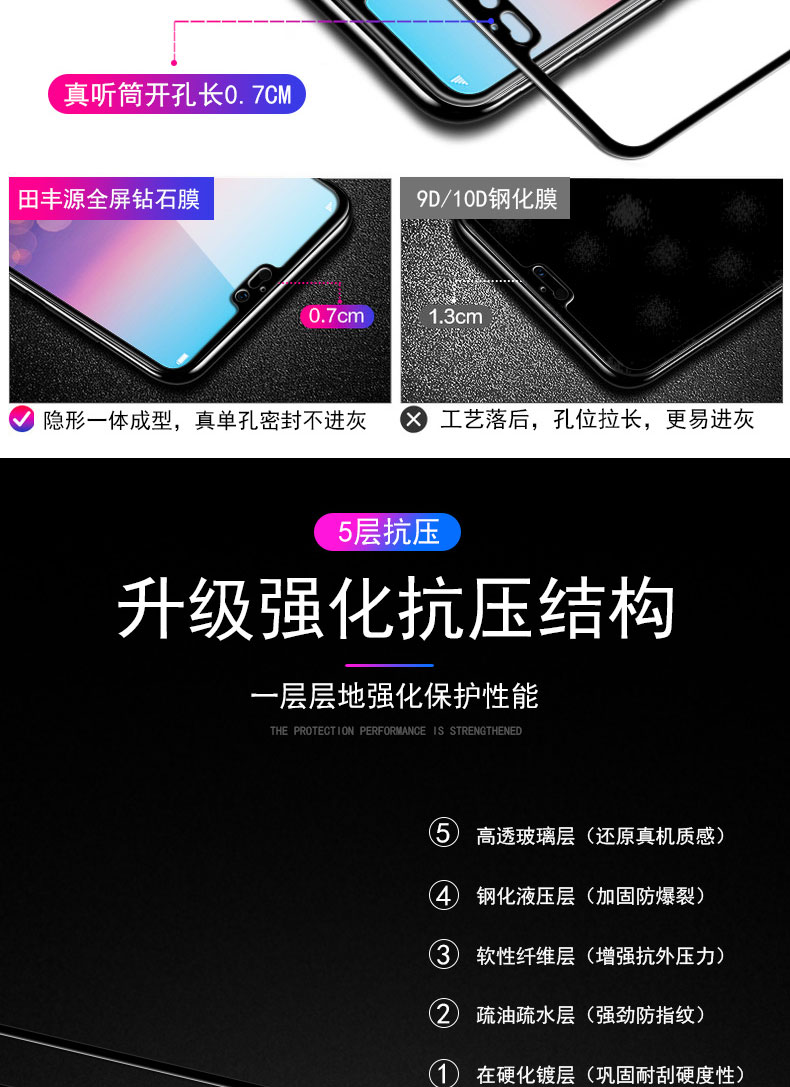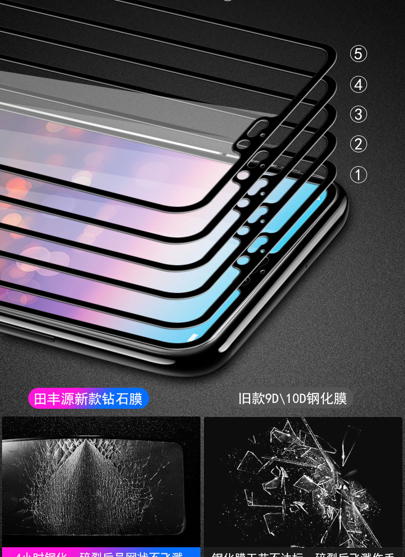 高品质,真9D膜,全屏玻璃全覆盖钢化膜,9倍增强硬度,增强不碎边,弧面工艺,触控更灵敏,滴水成珠