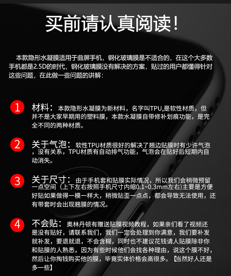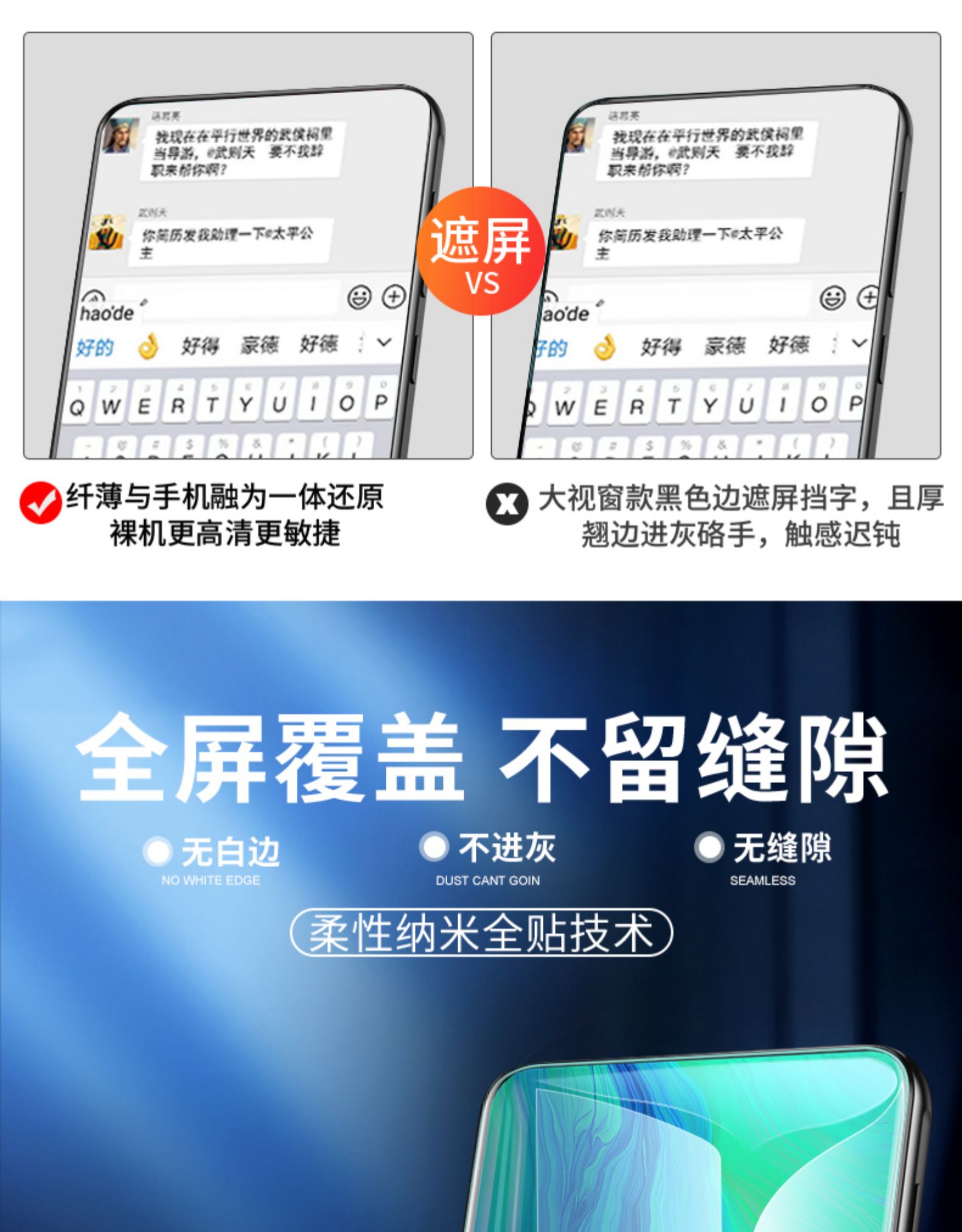 送神器+后膜!真9D水凝膜。全屏覆盖,告别碎屏,采用纳米融合技术,24小时内划痕自动修复完整!抗蓝光,保护眼睛,无白边,无气泡,无需喷水!还原裸机手感!!
