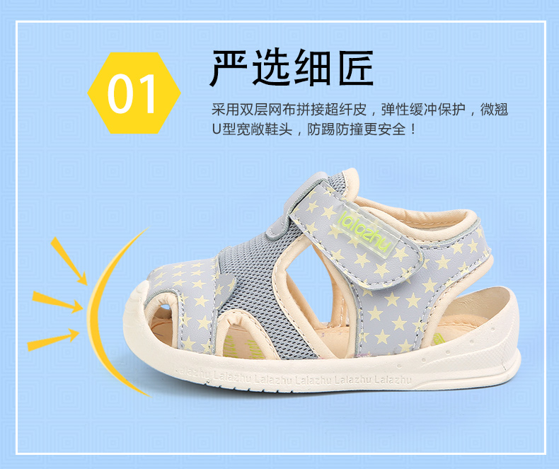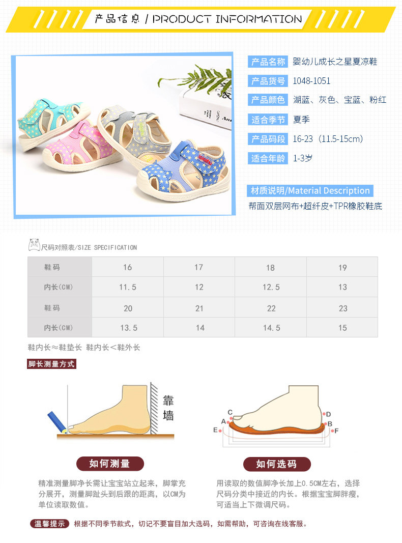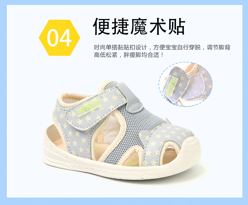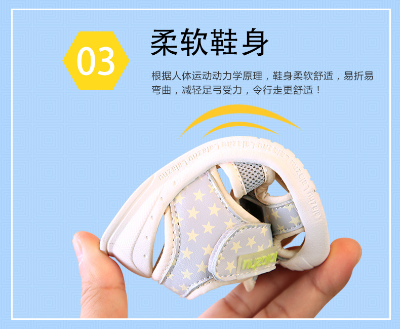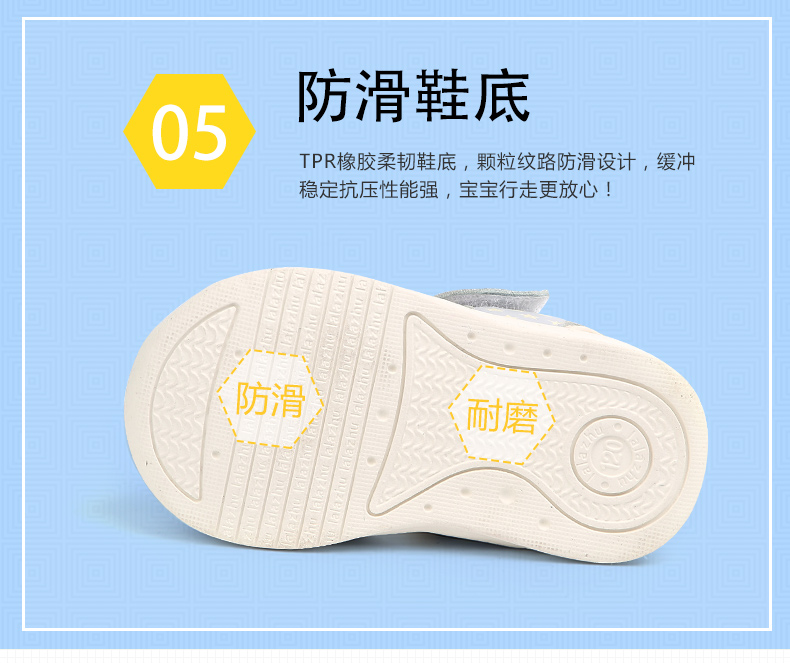 PU材质,精致做工,干爽透气易排汗,柔软亲肤,穿着舒服,便捷魔术贴,穿脱方便,橡胶鞋底,防滑耐磨,经久耐穿,萌萌可爱,棒棒哒~