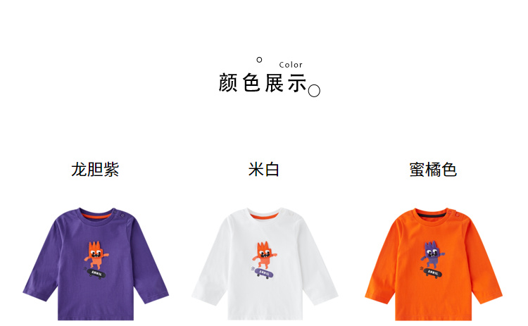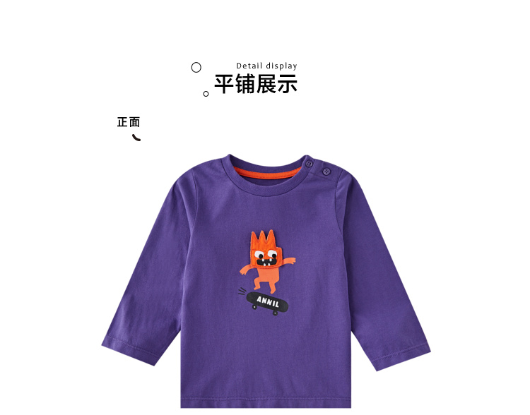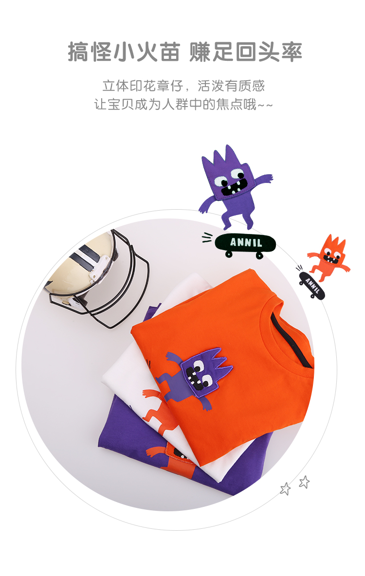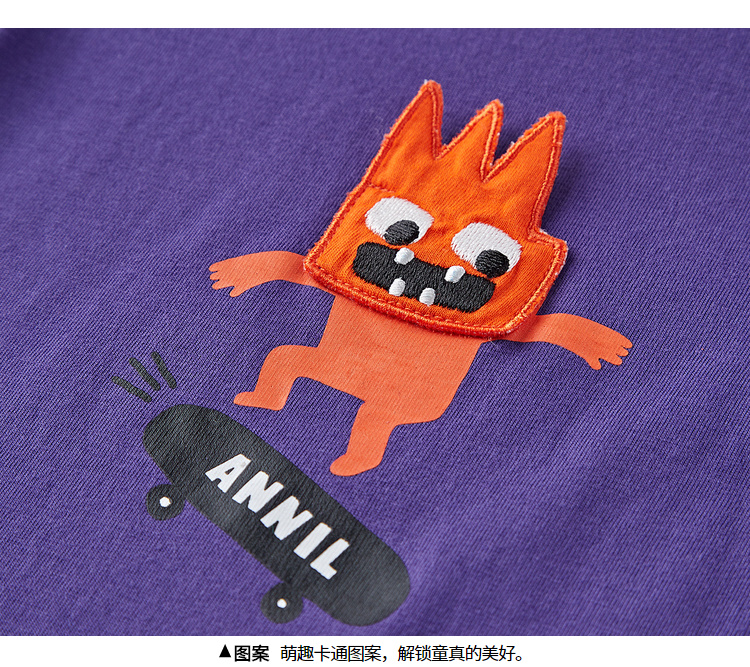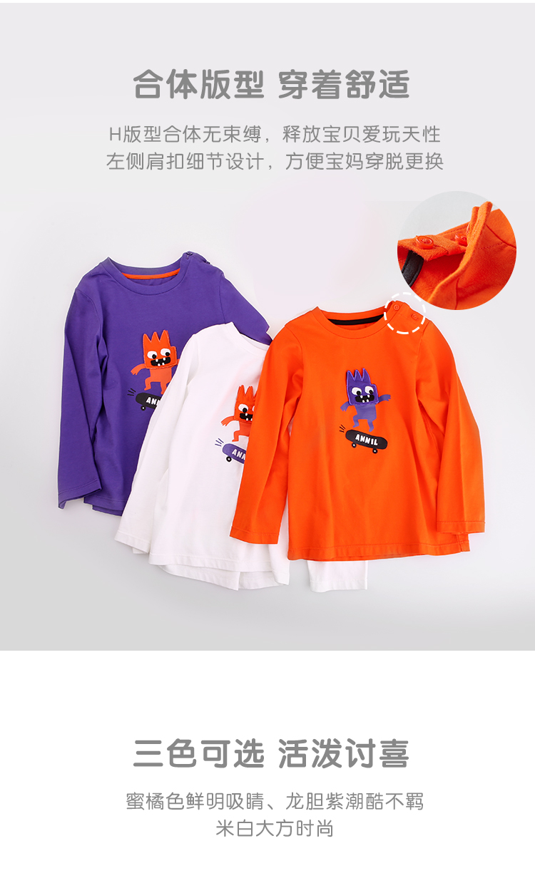 【安奈儿,业界销售过十亿的龙头型童装品牌,A股童装第1股,股票代码:002875】舒适A类纯棉,左侧肩扣细节,方便穿脱,三色可选,立体印花章仔,活泼可爱,赚足回头率