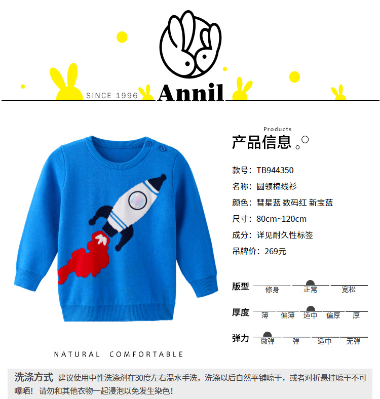 【安奈儿,业界销售过十亿的龙头型童装品牌,A股童装第1股,股票代码:002875】加软棉纱,柔软舒适,精致章仔,亲肤透气,耐洗耐穿,不易变形,趣味提花,活泼可爱,十分讨喜【赠运费险】