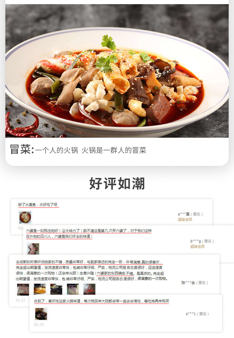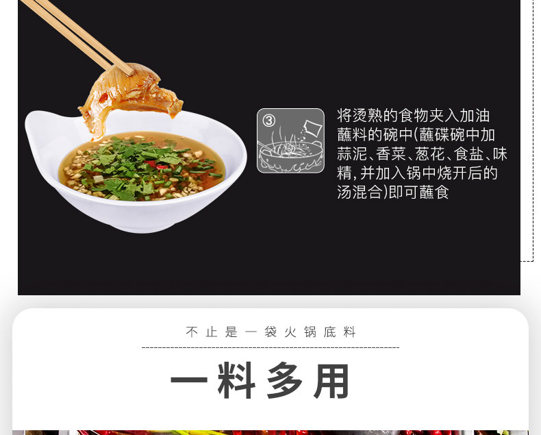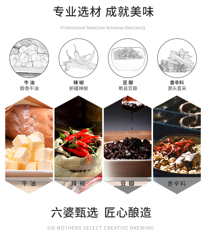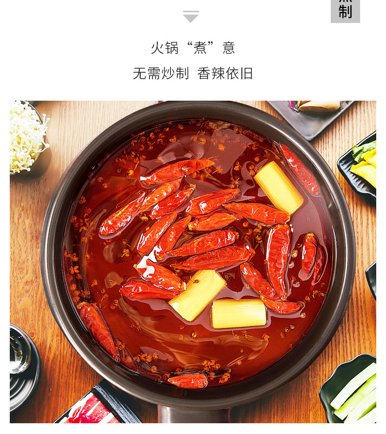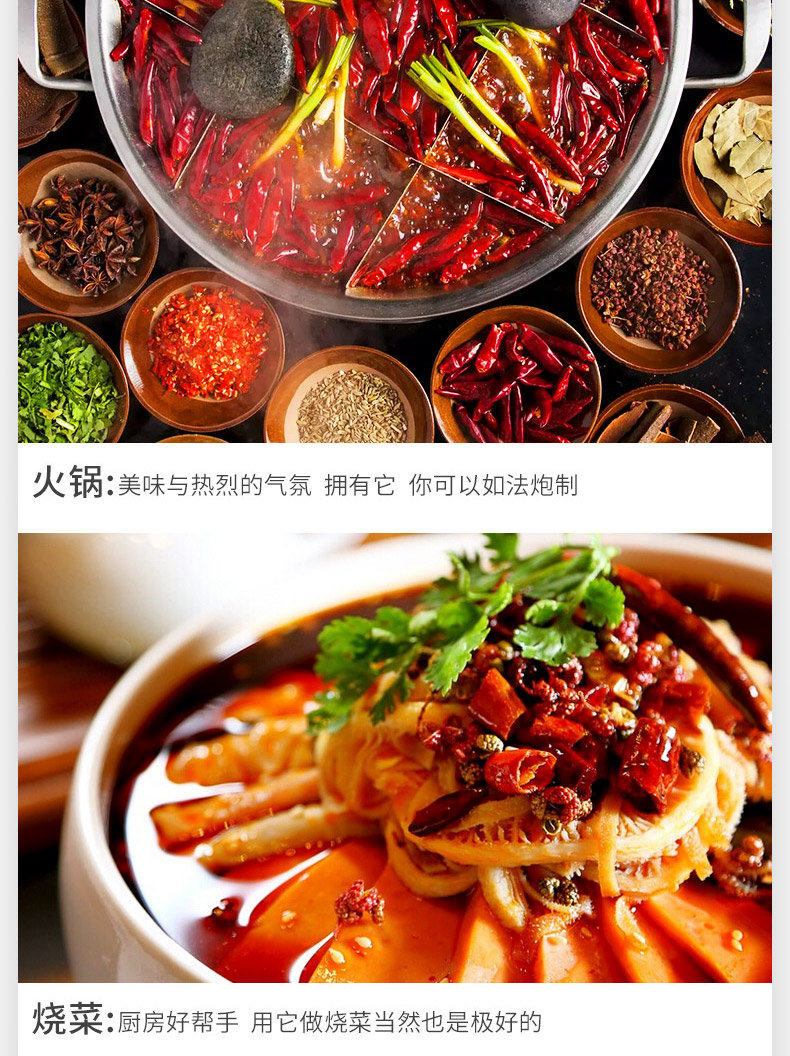 麻辣鲜香,汤红油亮,醇香四溢,麻辣烫串串香,香味十足,好吃不上火,火锅底料全能类型!