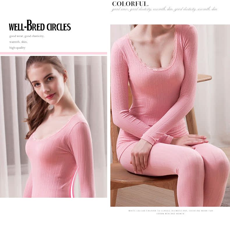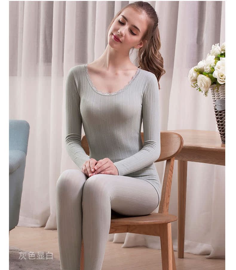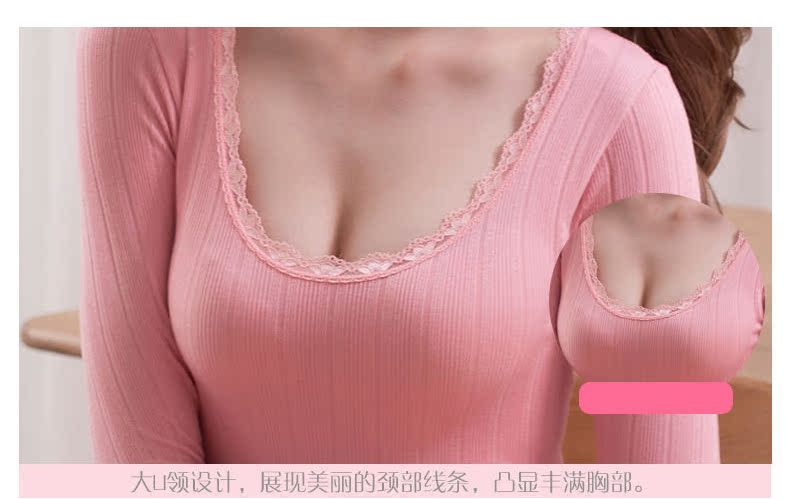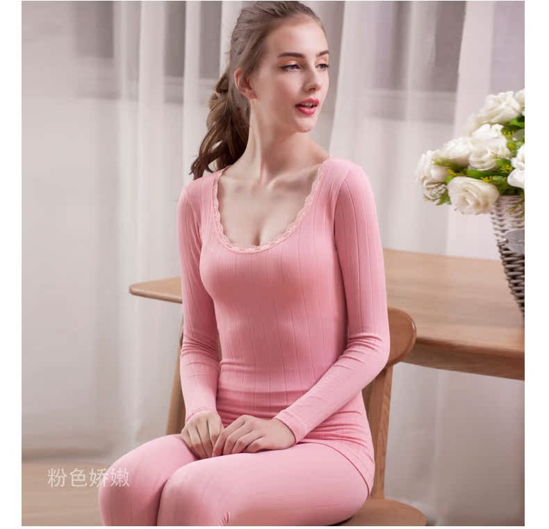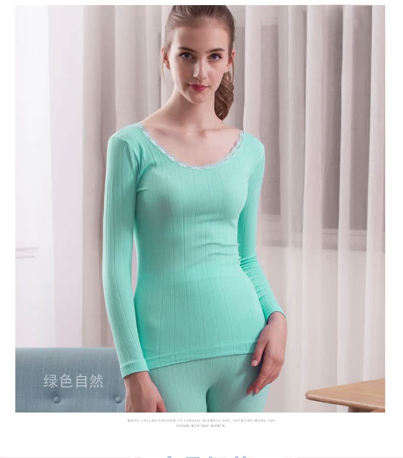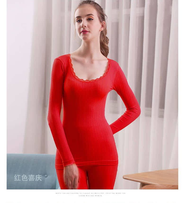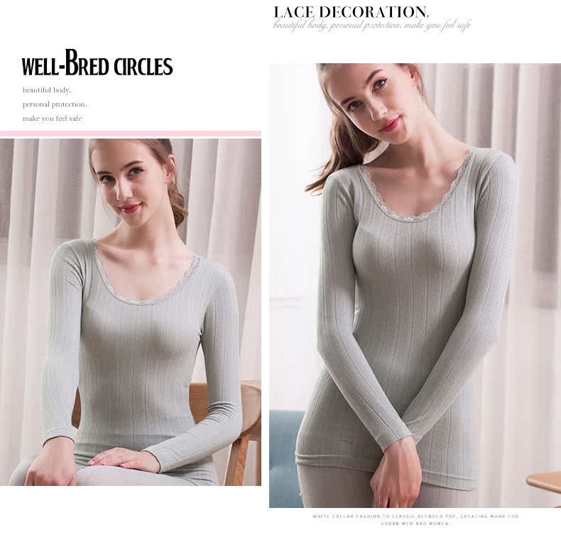 内衣女士圆领蕾丝边秋冬薄条纹纯色打底针织秋衣秋裤美体打底内衣
