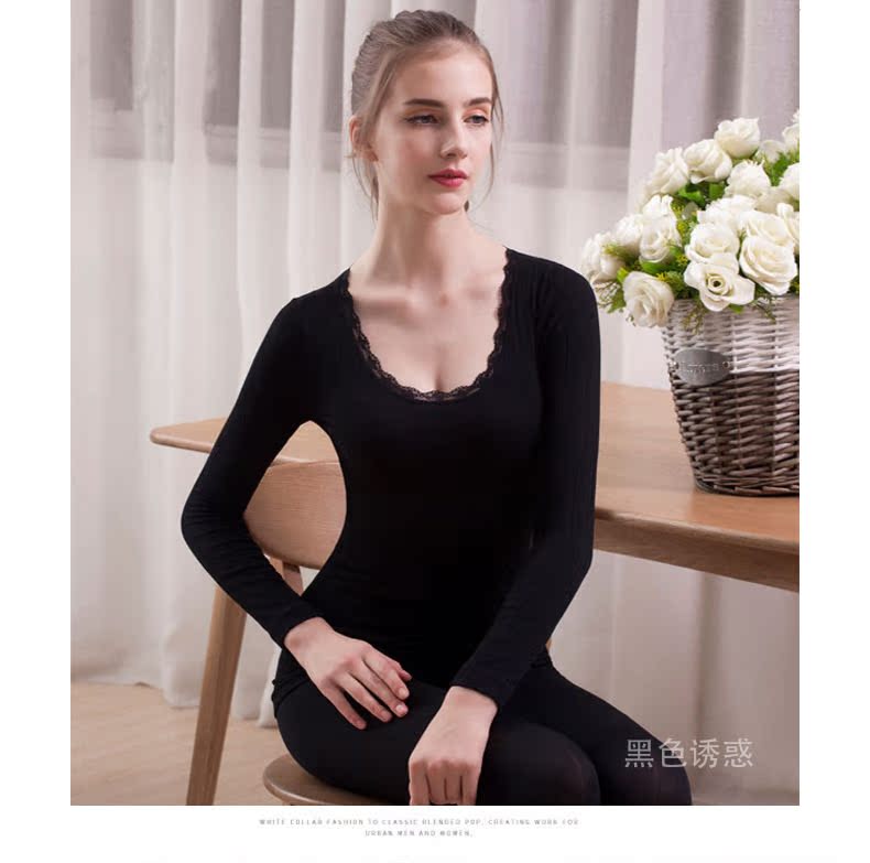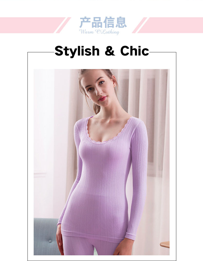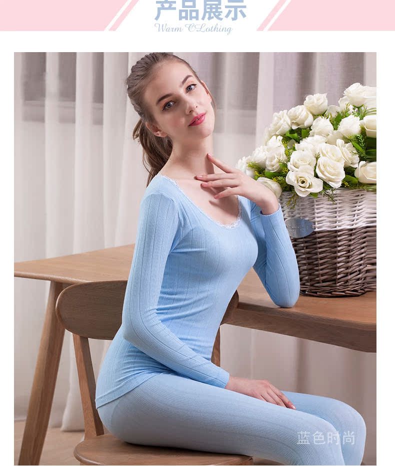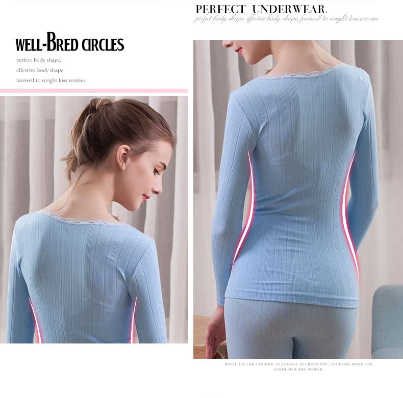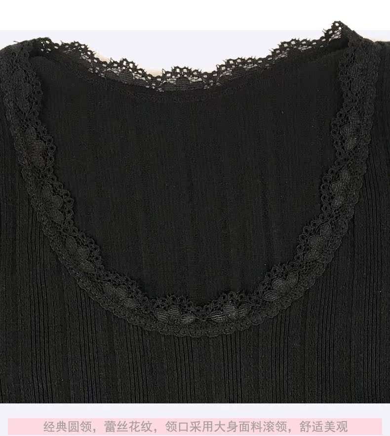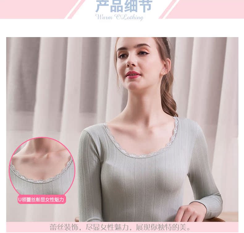 内衣女士圆领蕾丝边秋冬薄条纹纯色打底针织秋衣秋裤美体打底内衣