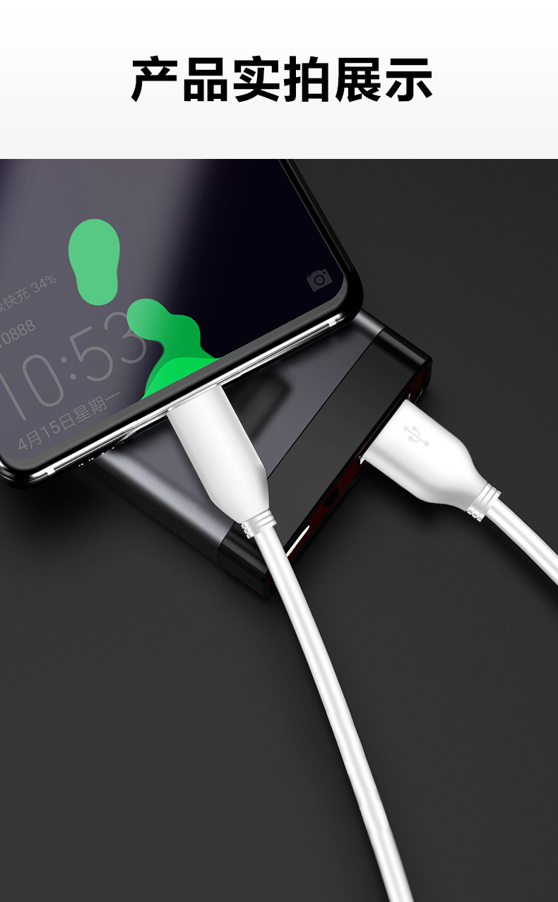 TYPE-C入全新单片机芯片,加粗铜芯线,提速50%,实现快充真提速;充电传输二合一,TPE加固防断接头;兼容广泛,适用各大手机。