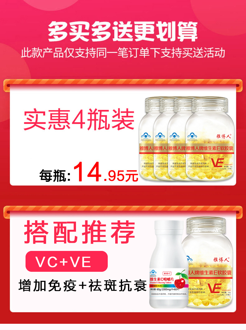 【买2送2】天然维生素E软胶囊,高科技提纯,纯度高,易吸收,有效补充维生素E,强大的抗氧化作用,内服外涂,抗衰老,美丽由内而外的散发出来哟!