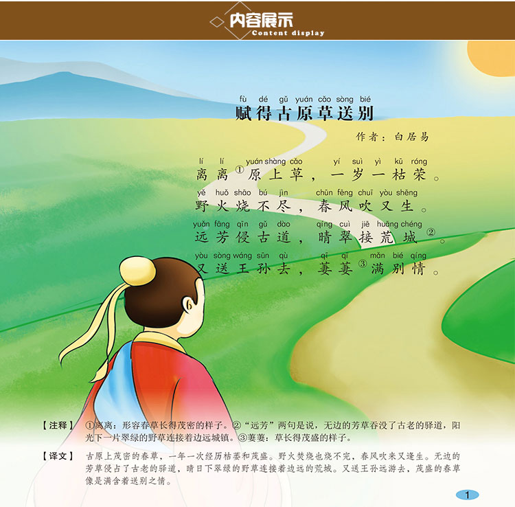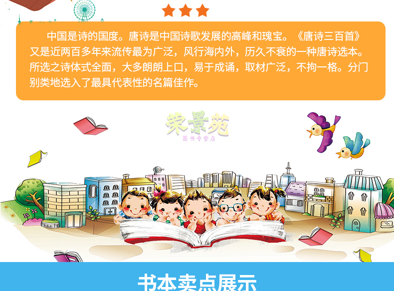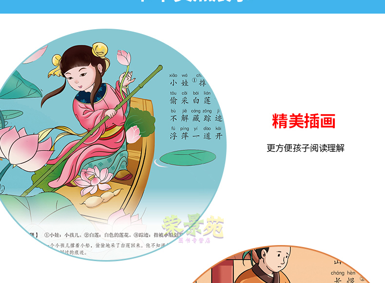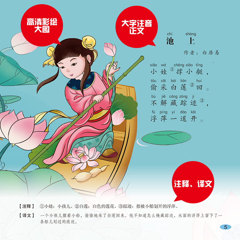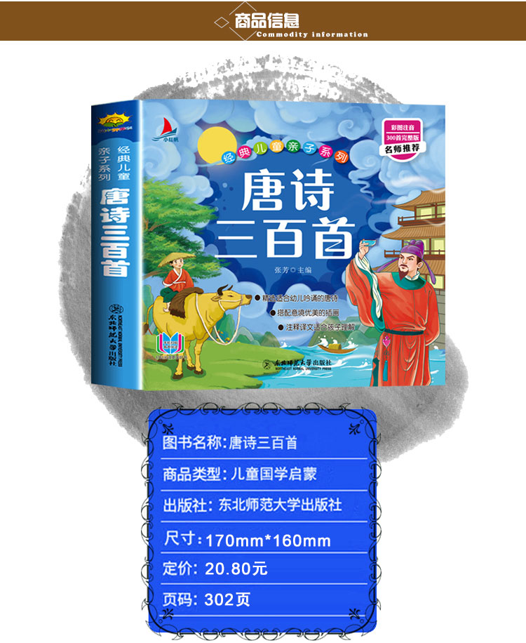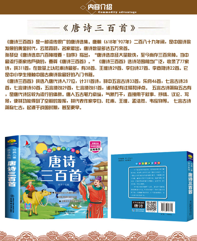 这是适合孩子学习的、容易理解和吟诵、流传广泛的版本。加上通俗易懂的精要讲解,更能培养孩子对诗歌的兴趣。同时配以精美的图画,让孩子可以体会古诗情景交融的美。