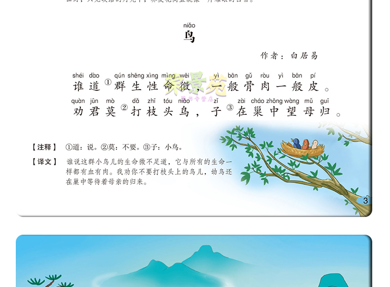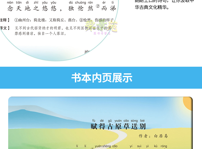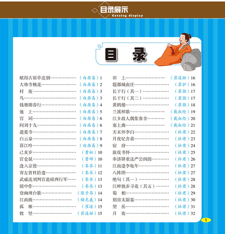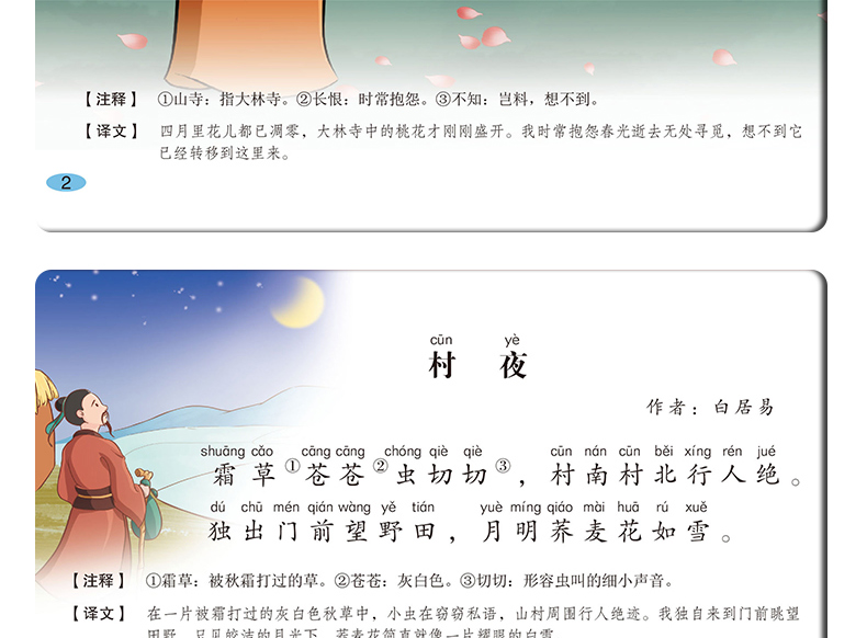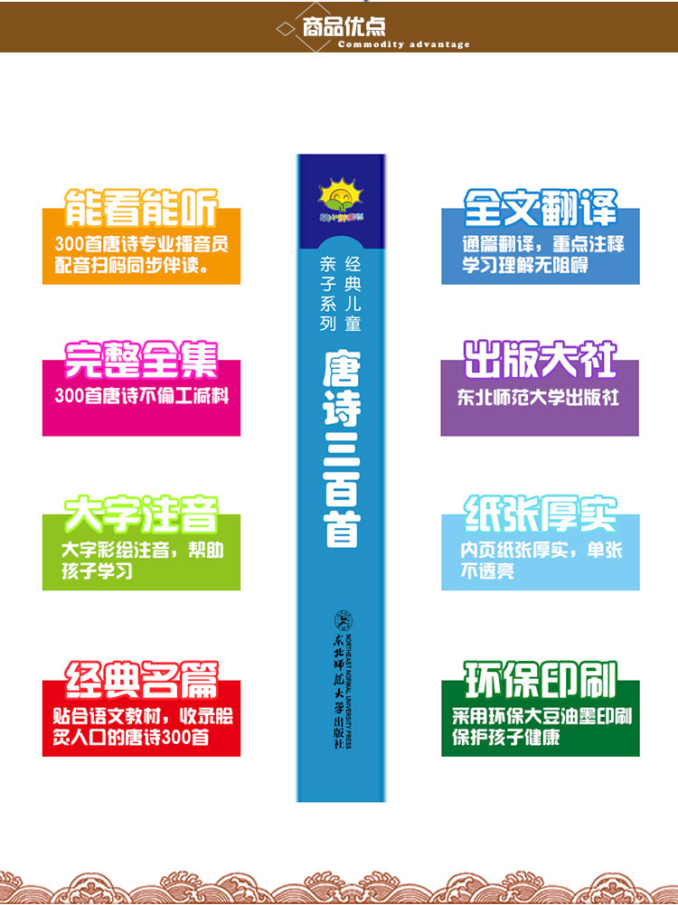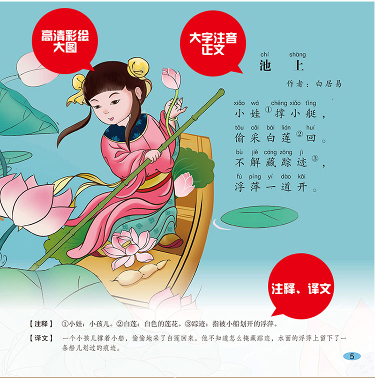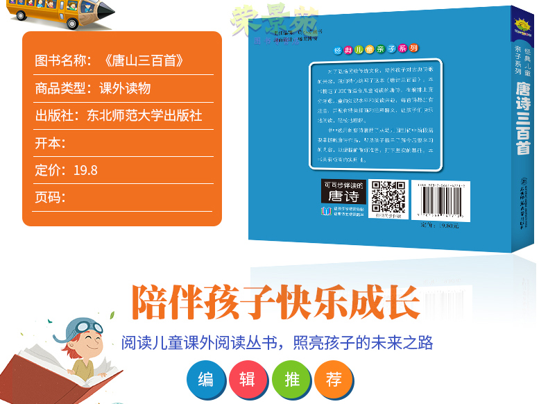这是适合孩子学习的、容易理解和吟诵、流传广泛的版本。加上通俗易懂的精要讲解,更能培养孩子对诗歌的兴趣。同时配以精美的图画,让孩子可以体会古诗情景交融的美。