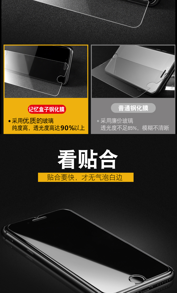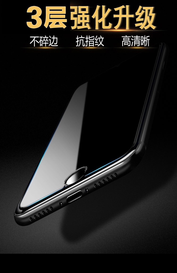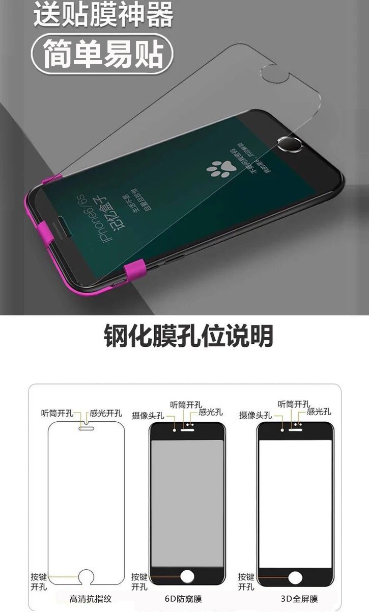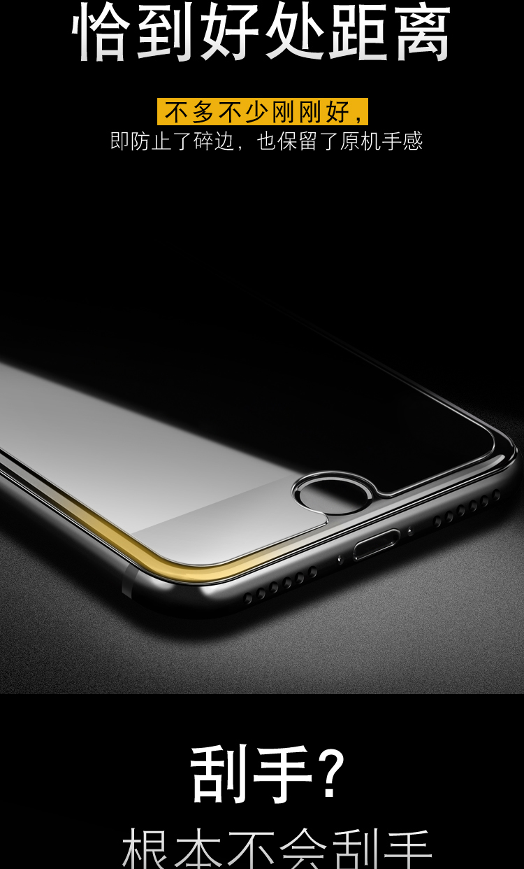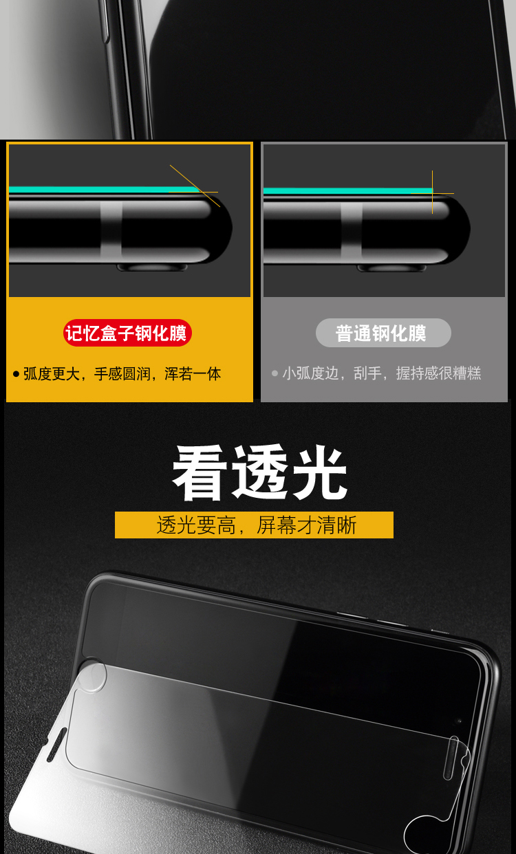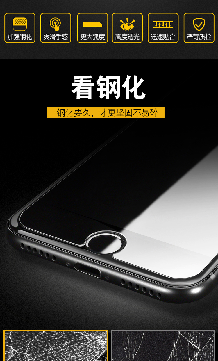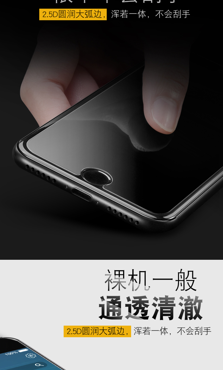 4.7寸苹果6/7/8通用,5.5寸苹果6/7/8plus通用,纳米强化防爆钢化膜,3D圆润弧边,高清透光手感顺滑,强抗指纹,不翘边无白边,完美贴合无缝隙!
