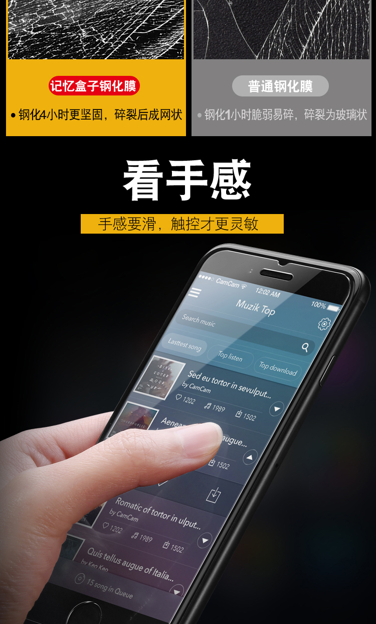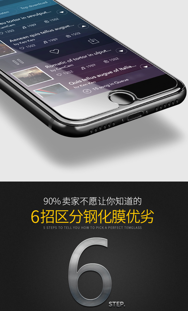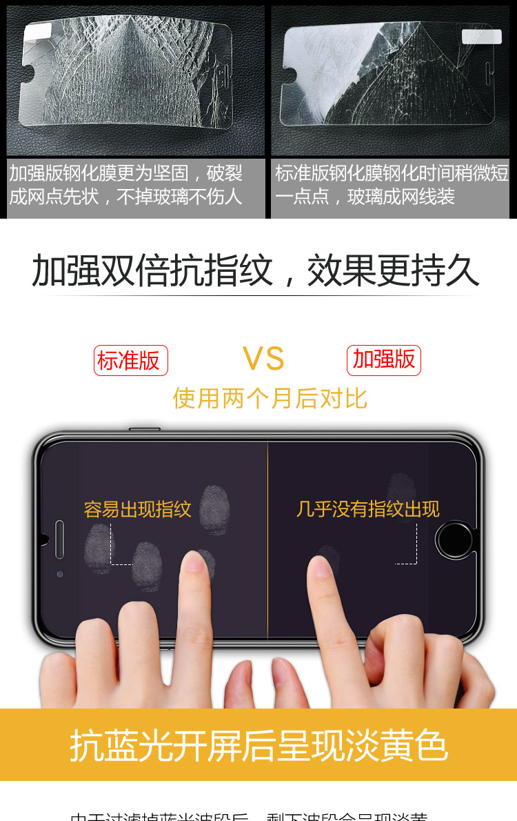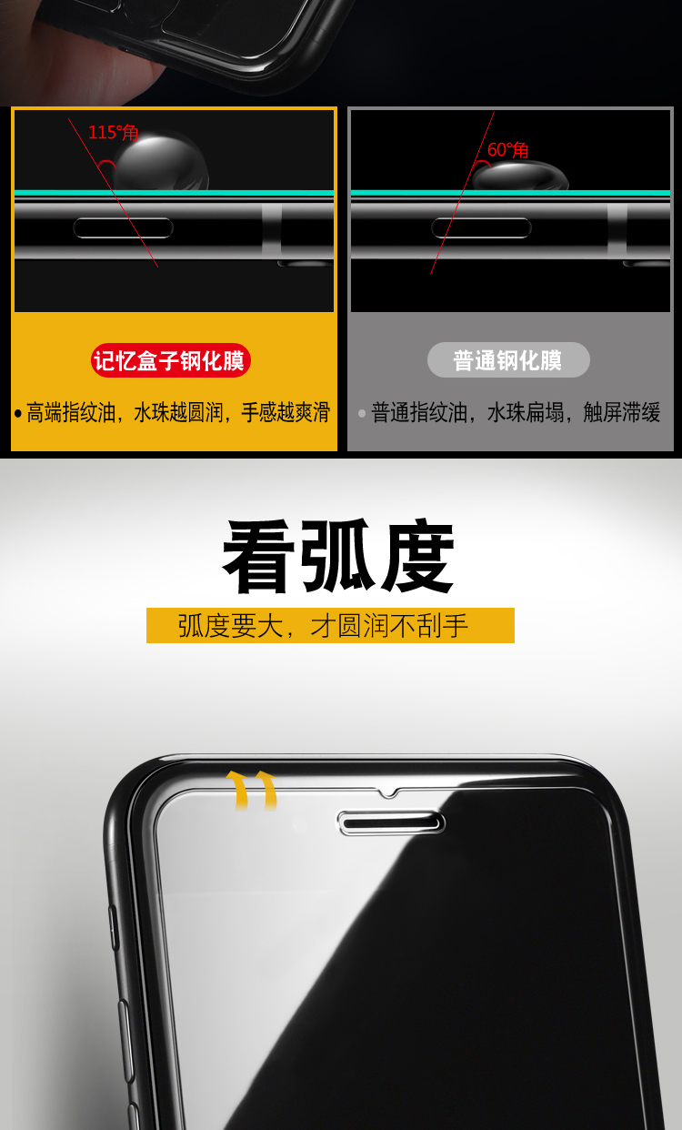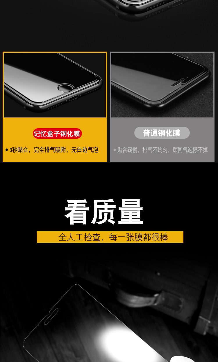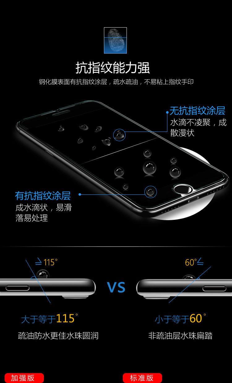4.7寸苹果6/7/8通用,5.5寸苹果6/7/8plus通用,纳米强化防爆钢化膜,3D圆润弧边,高清透光手感顺滑,强抗指纹,不翘边无白边,完美贴合无缝隙!