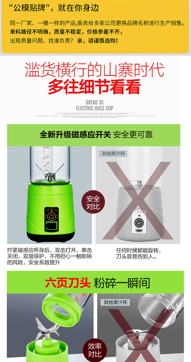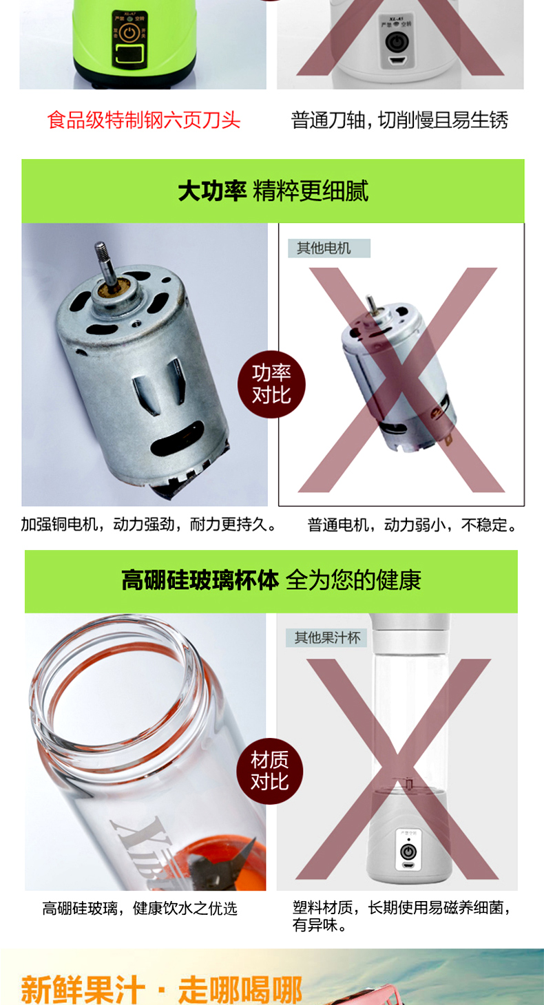 支持验货、7.4V大功率,便携冲电款,玻璃杯体,携带方便,可以不需要加水直接榨汁,随时随地想榨就榨,可以做榨果汁、制作奶昔,做宝宝辅食,多款颜色可选,五年包换,终身质保、送运费险