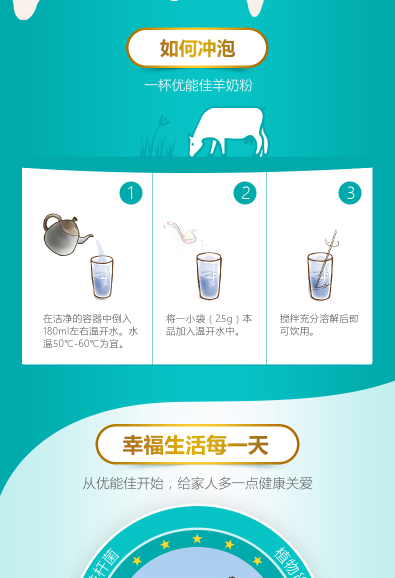 优能佳羊奶粉,新鲜2小时,羊乳新高度,从挤奶到进入加工仅需2小时,保留原奶中更多的免疫活性物质。新鲜营养易吸收,多维高钙好身体,只做鲜活好羊奶。