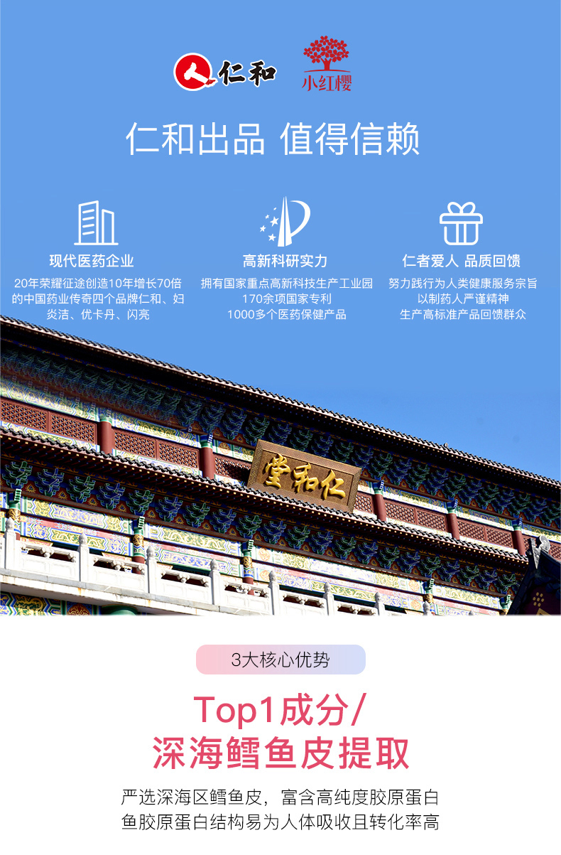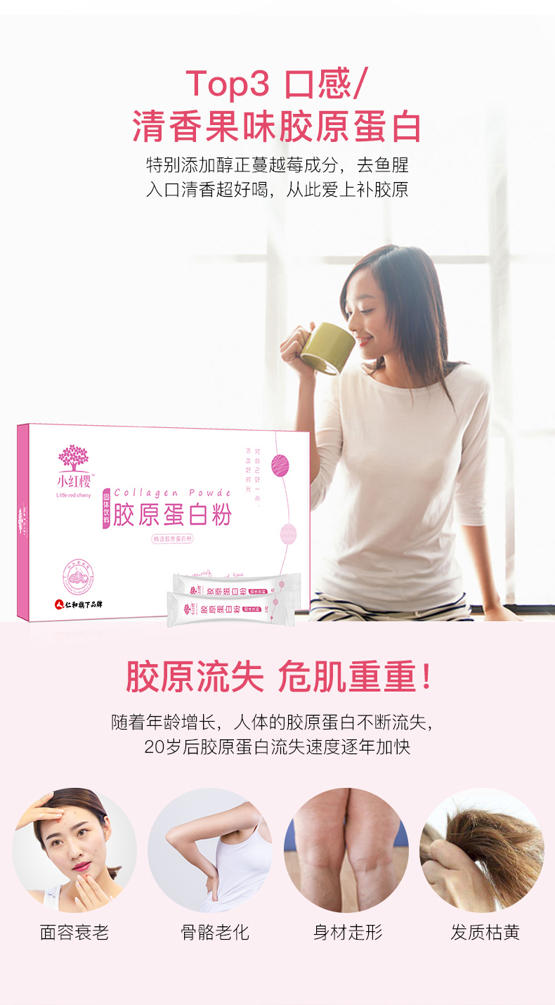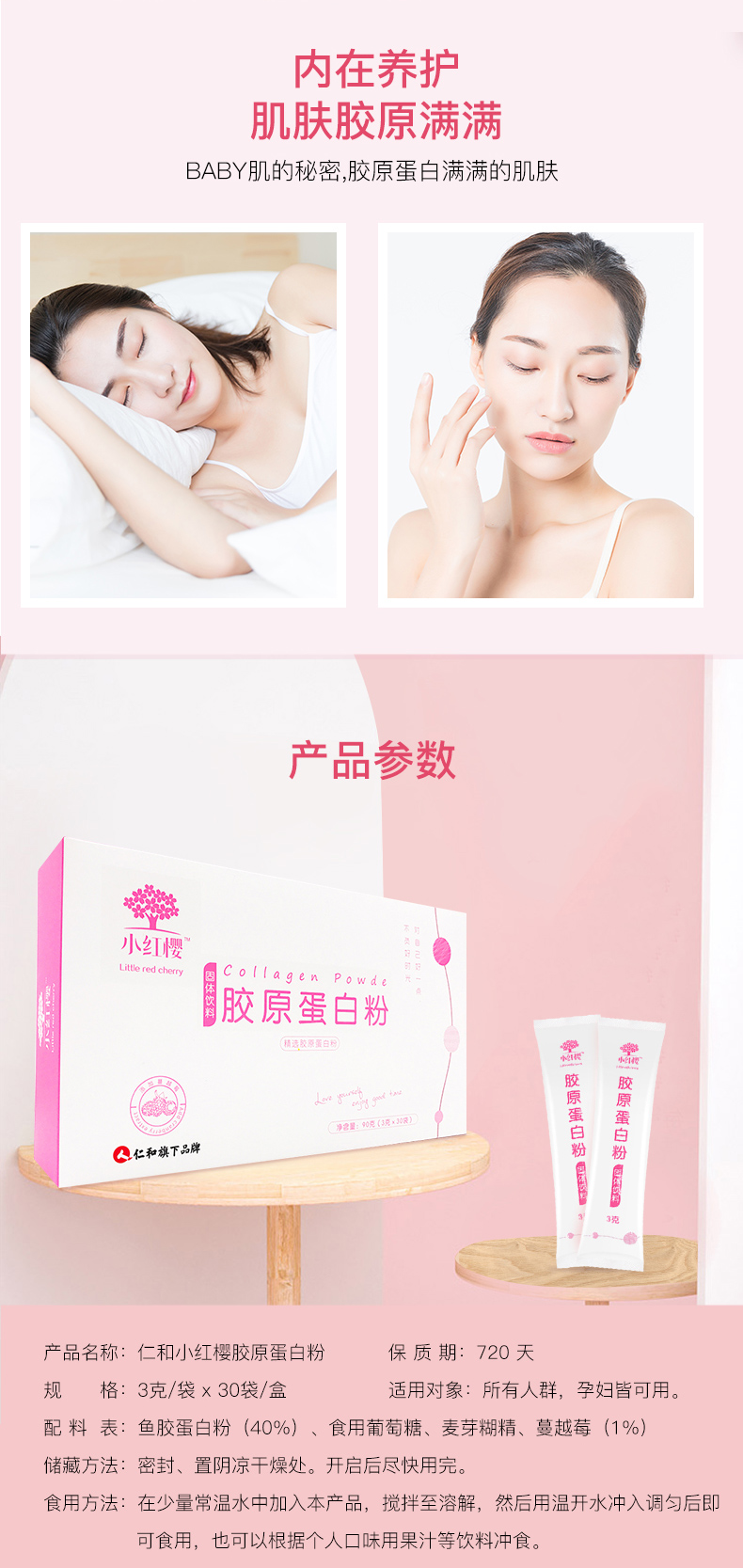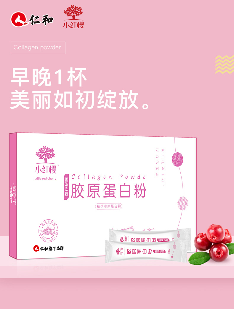 敷100张面膜不如喝一袋胶原蛋白粉!仁和小红樱鱼胶原蛋白粉,精选深海鱼胶,入水即溶,超小分子,吸收率高达99.6%,锁住肌肤水分,抑制黑色素,减少色斑和皱纹的生成!令肌肤水嫩Q弹,重新回到8岁~
