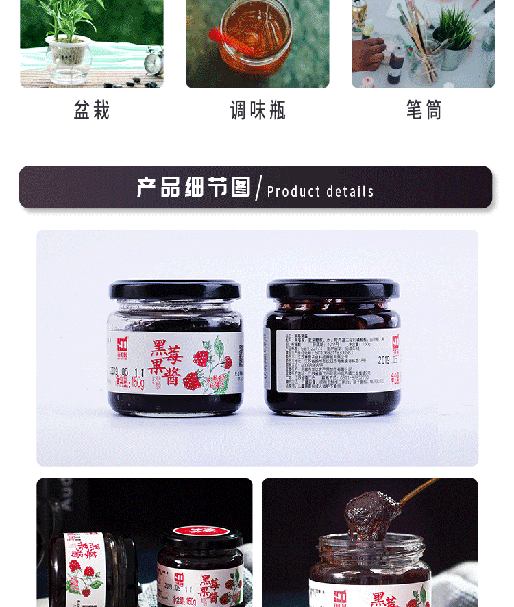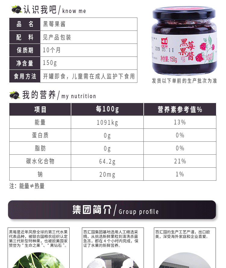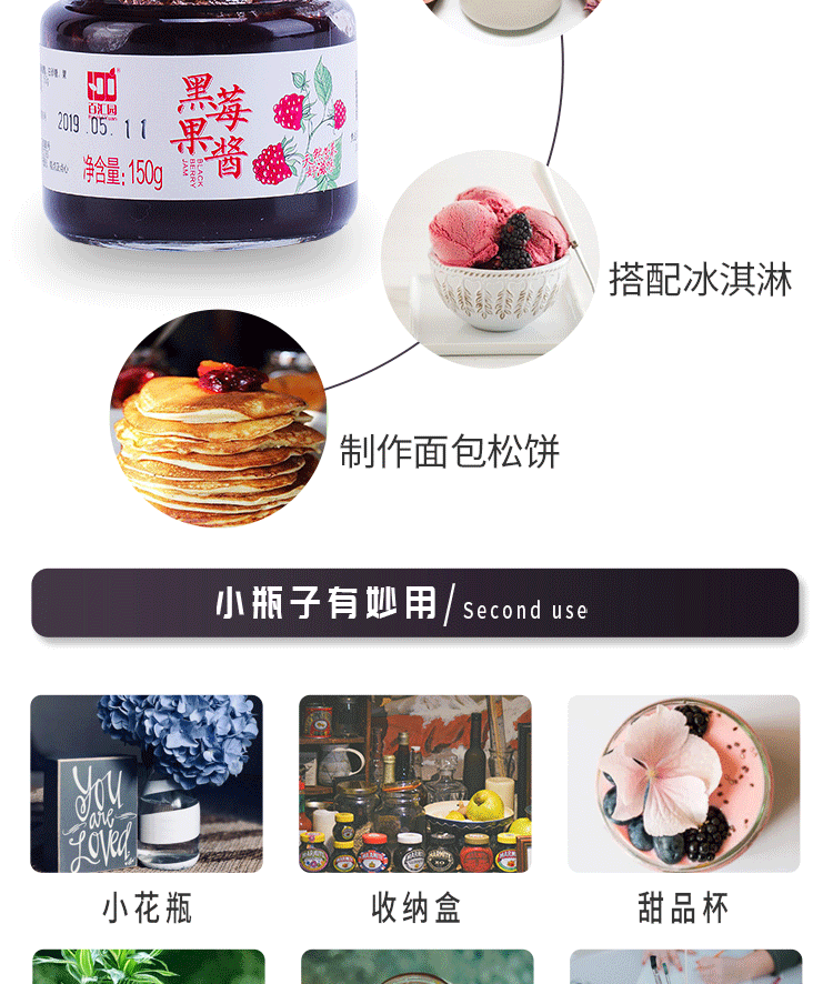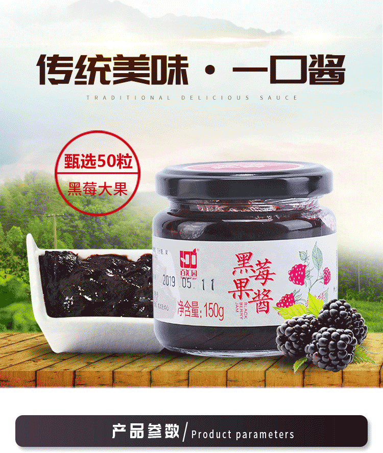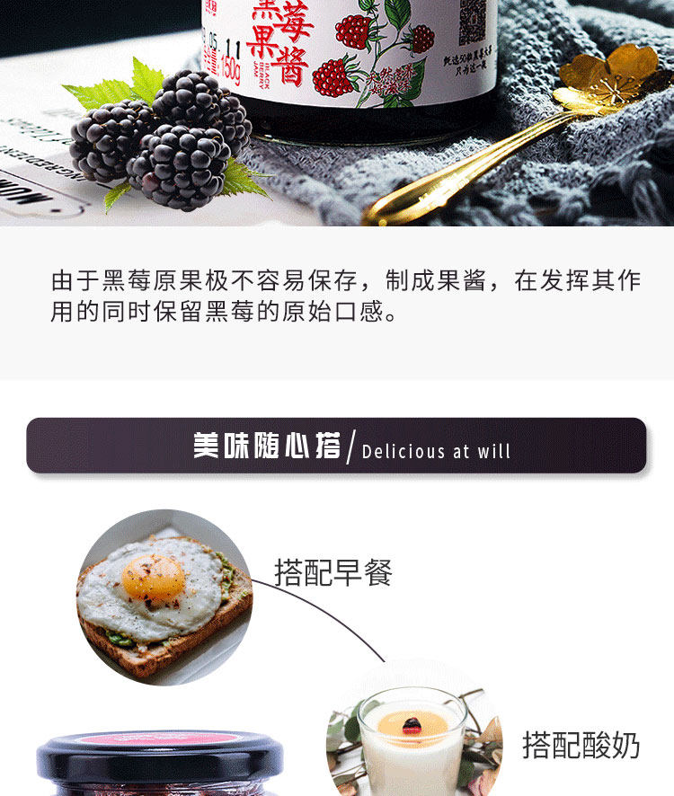 【买两份送勺子】新鲜黑莓制作,果肉含量超多,满满的的果肉果粒,酸甜口味。在家可拌酸奶、抹面包、做冲饮、烘焙等,做冰沙、冰淇淋、奶昔等也是超赞。