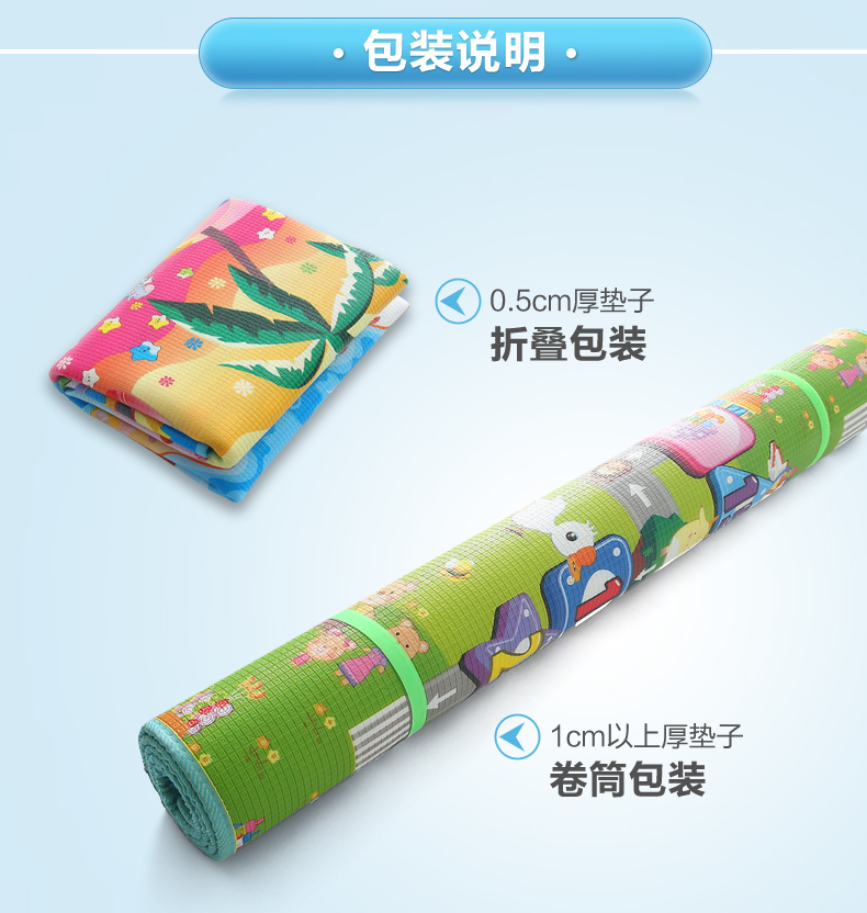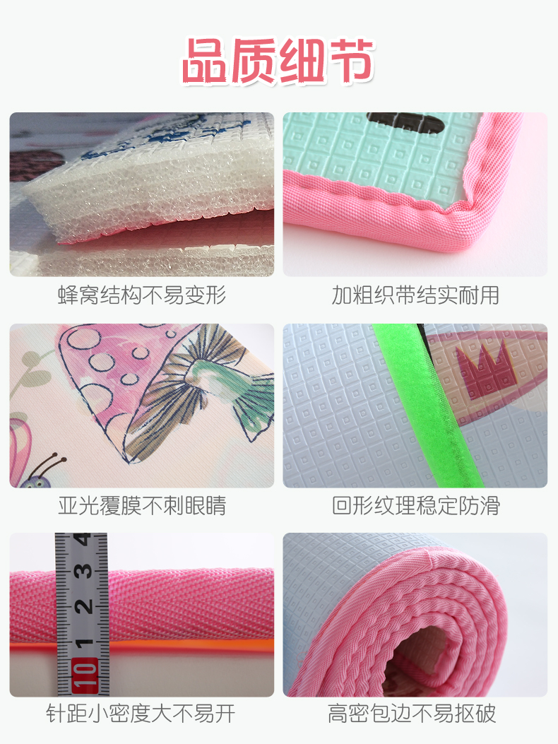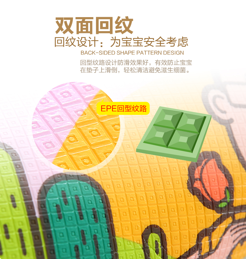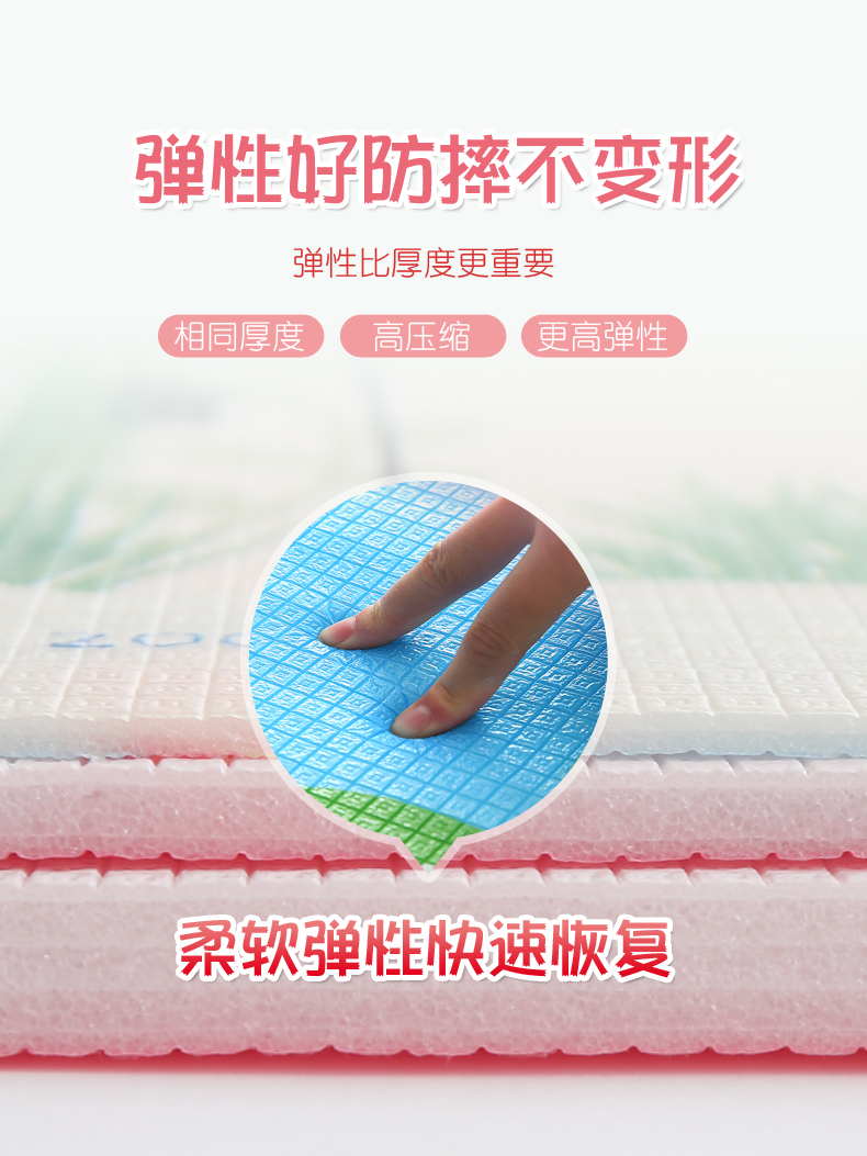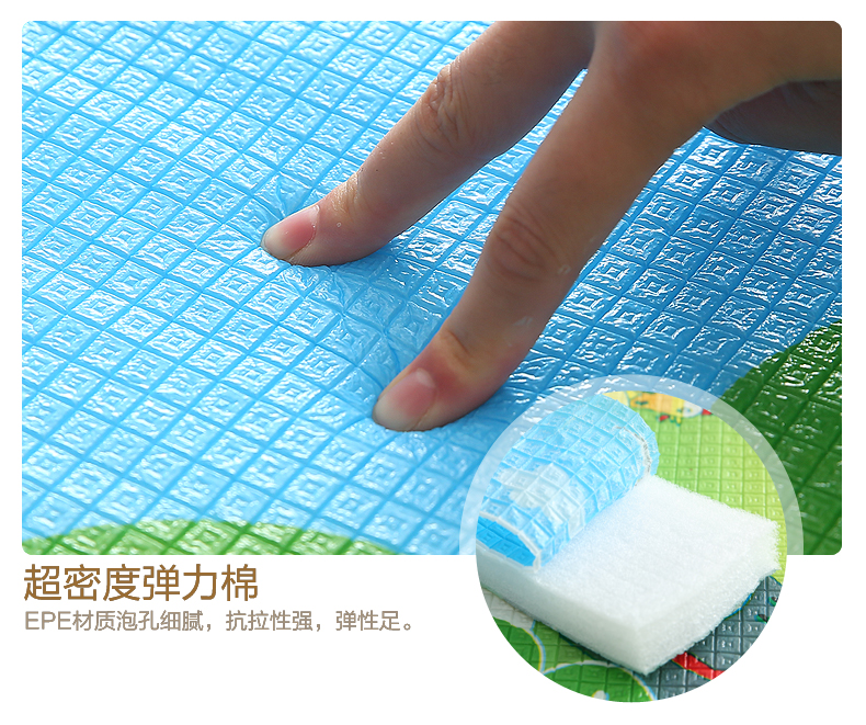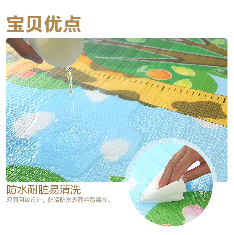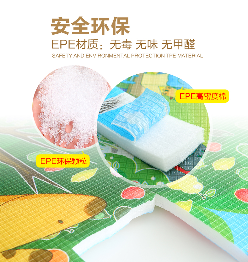 EPE高密度材质,安全无味,环保耐用,拒水防污易打理,双面真空金字塔纹理,脚踩不打滑,独有纳米气垫簇,有效防冷隔热,四季皆宜,双面图案+早教方格,让孩子在玩的同时成长【赠运费险】