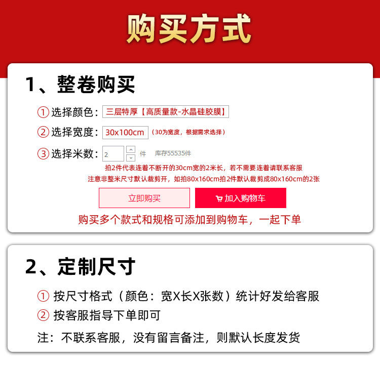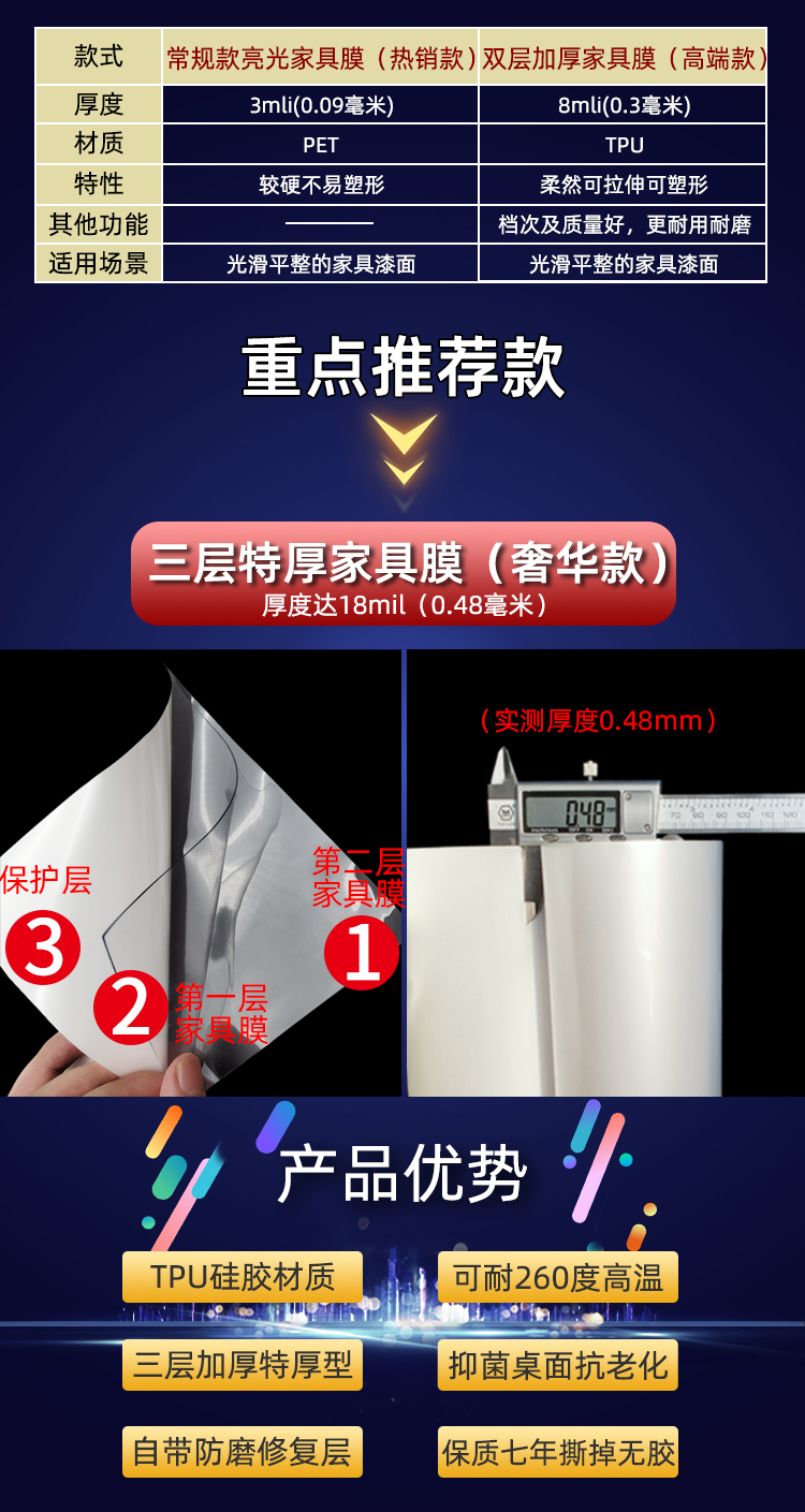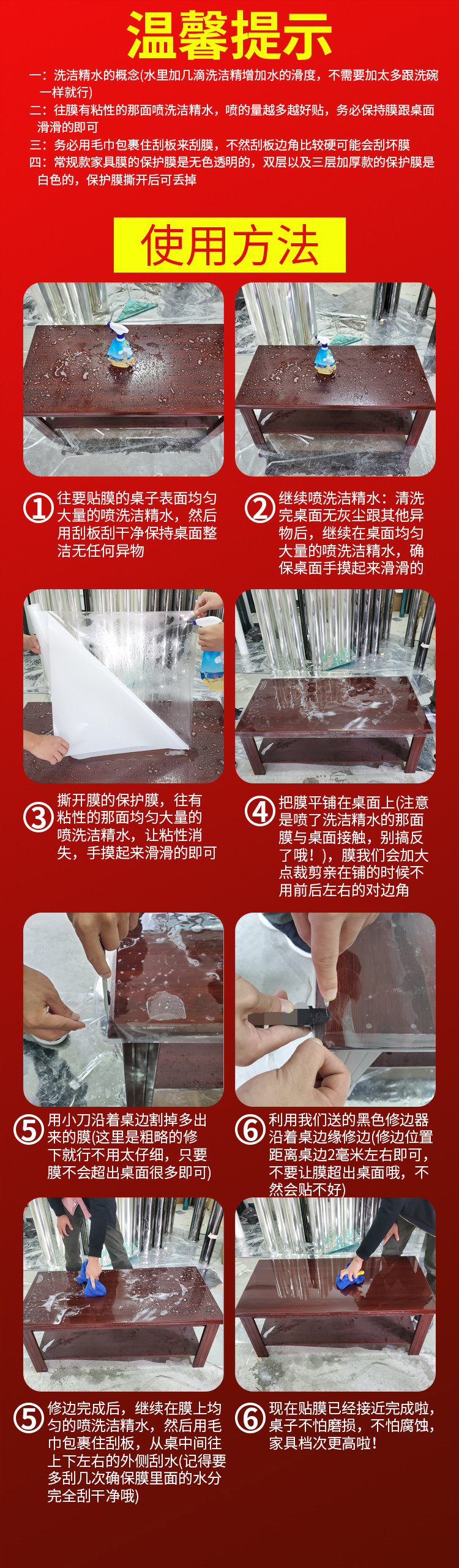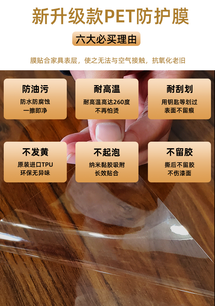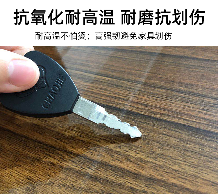 加厚耐高温防刮伤硅胶家具膜,超高透明度,防油烟,防烫,防刮,撕掉不留残胶,用几年后家具还是新的,现在下单送送贴膜工具,支持七天无理由退换,赠运费险!