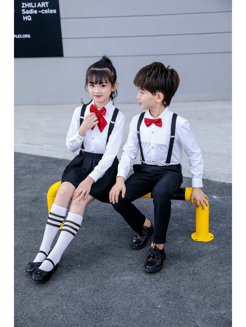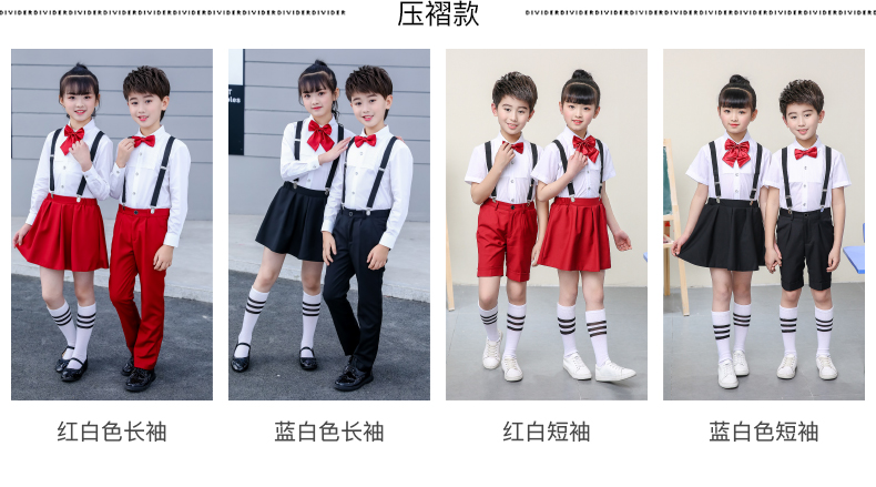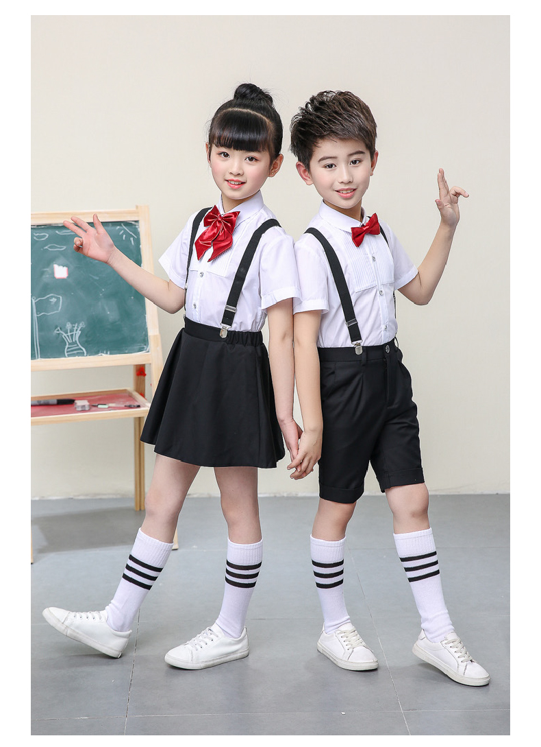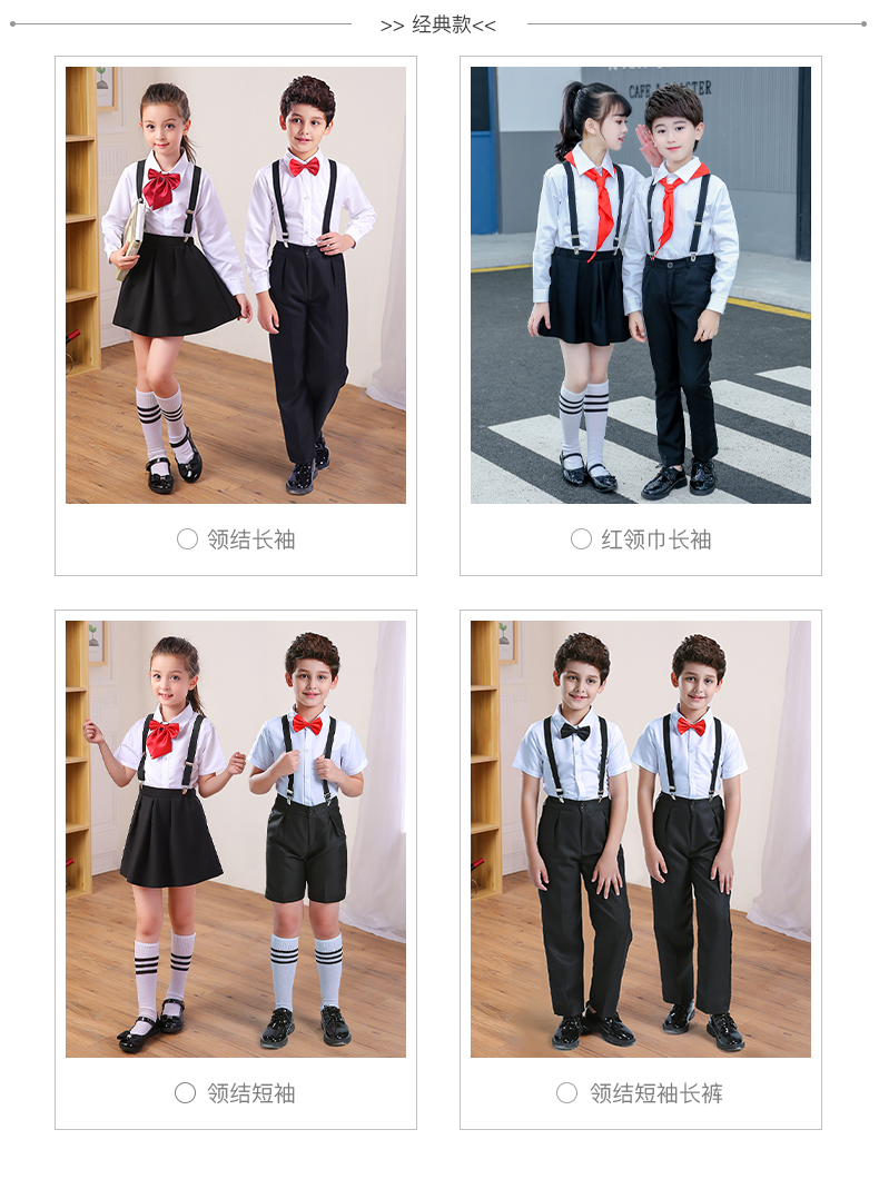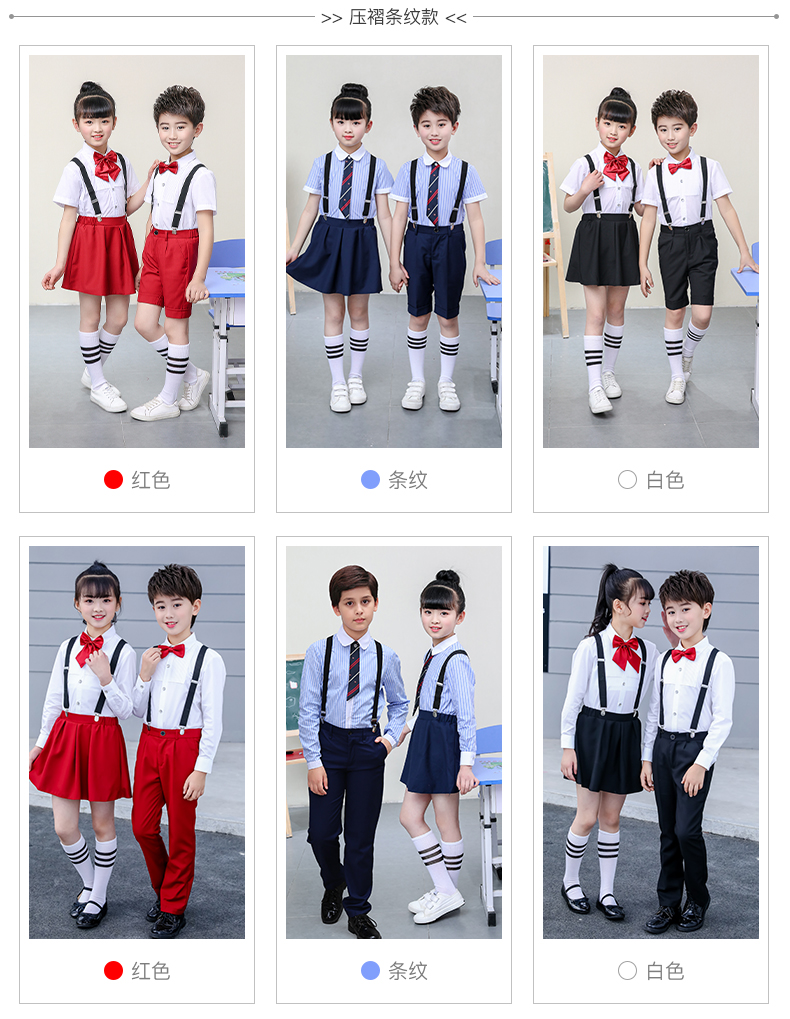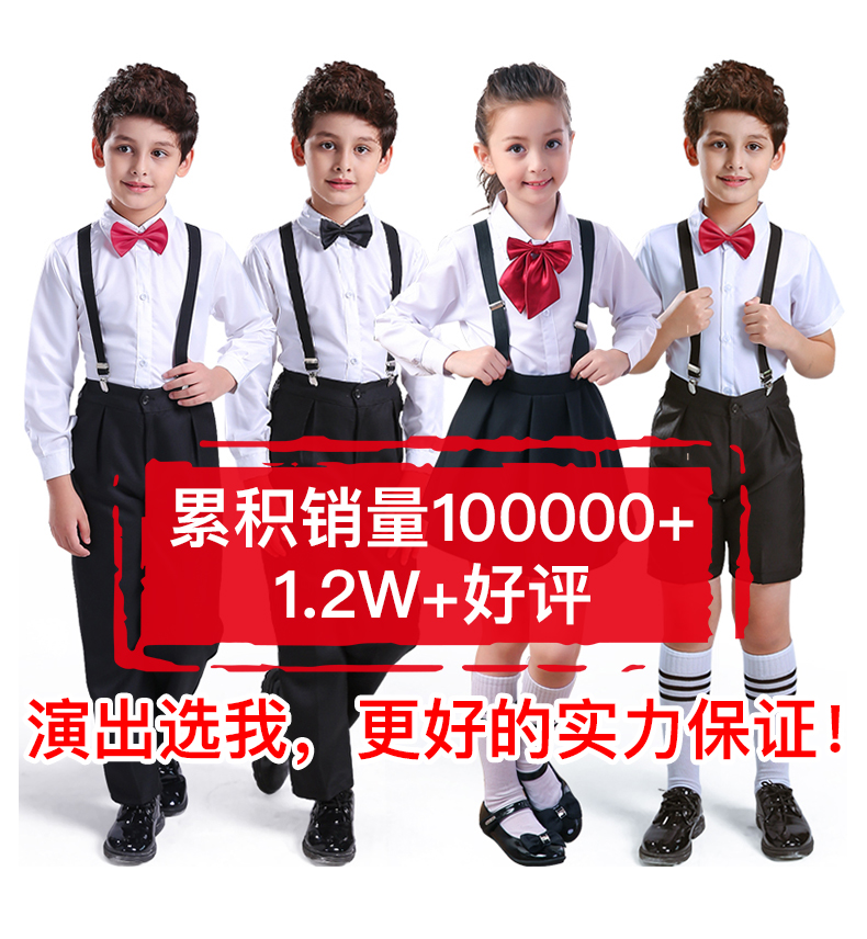 累积销量10W+好评1.2W+演出实力有保证!精选优质面料,设计新颖,款式经典,搭配时尚领结,凸显高贵大方,而且穿着舒适,不管是当做演出服还是校服都可以,大中小款,长短裤都有。