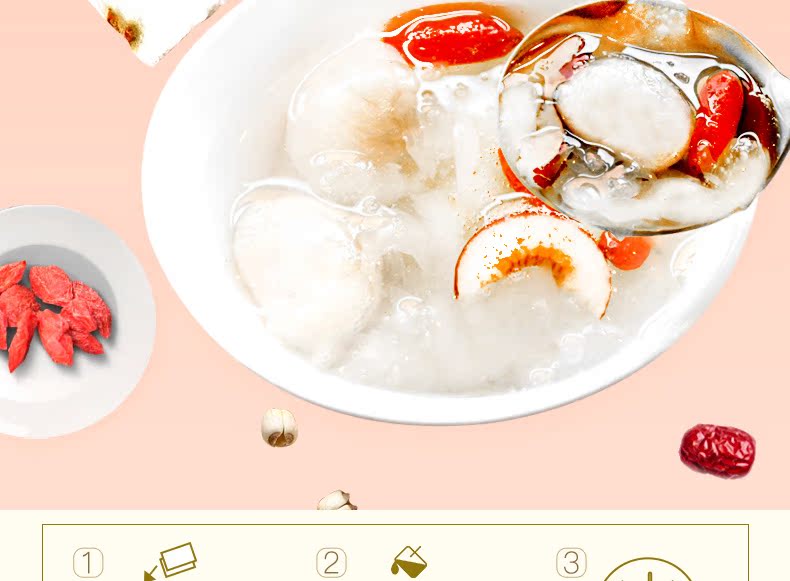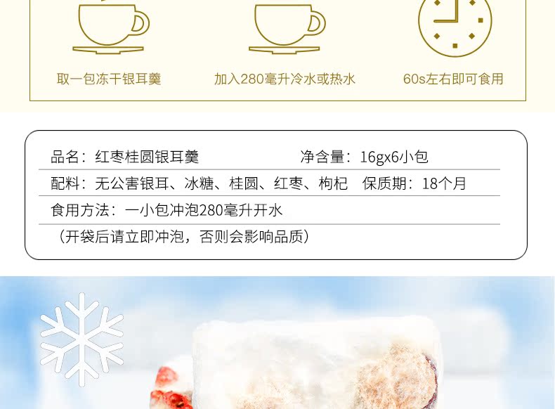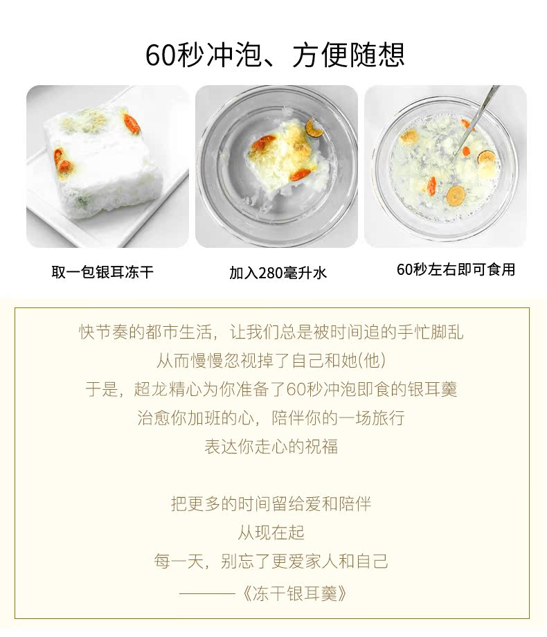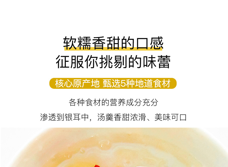6袋独立包装,精美包装,60秒冲泡即食,新鲜银耳的口感,冻干锁鲜,复水还原,食用方便,原汁原味,甑选各种食材,慢火细炖,让营养充分渗透到银耳羹里,浓浓胶质。