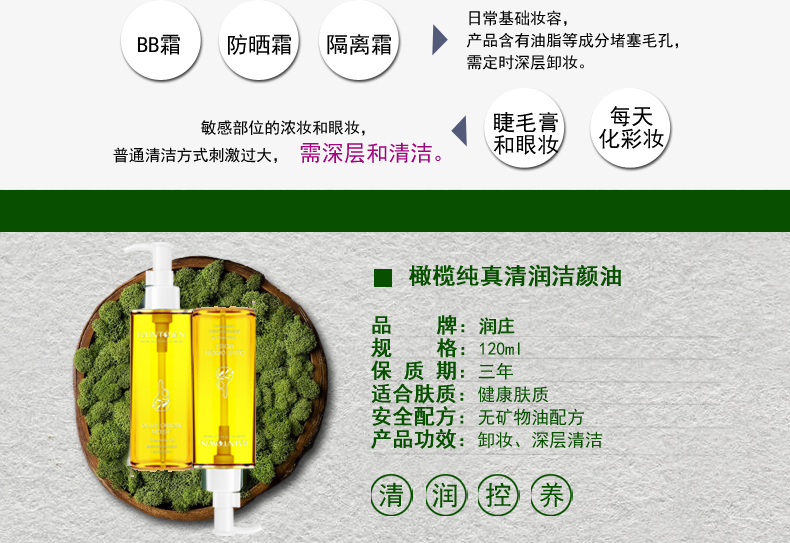 【正品保证】润庄橄榄卸妆油温和,深层清洁毛孔黑头,120ml洁颜油脸部眼唇卸妆水,无矿物油,无香精,无防腐剂,快速卸妆!