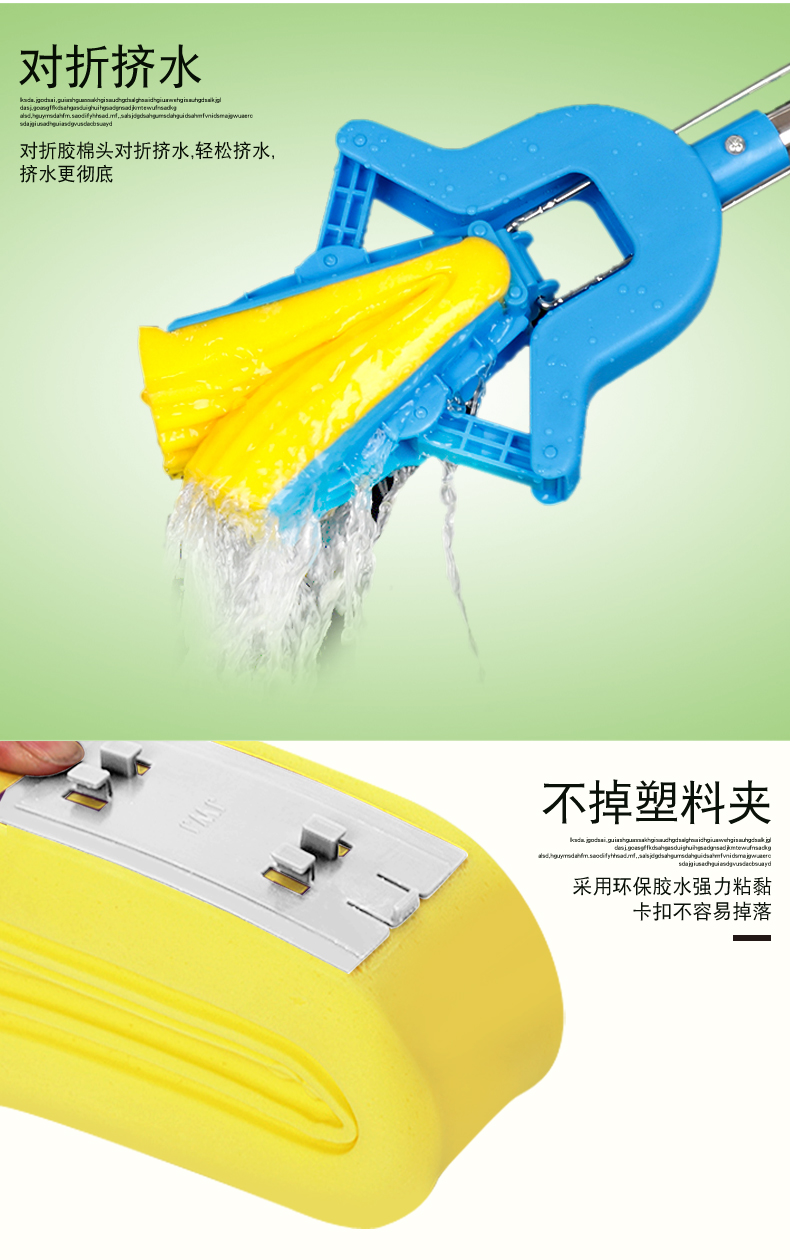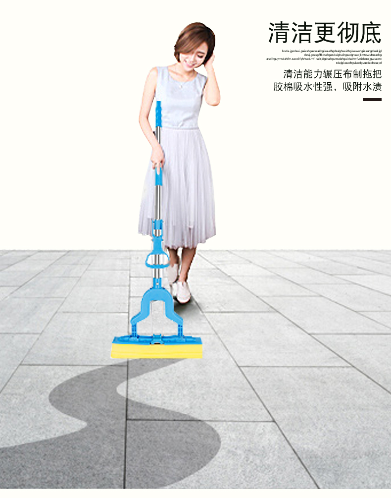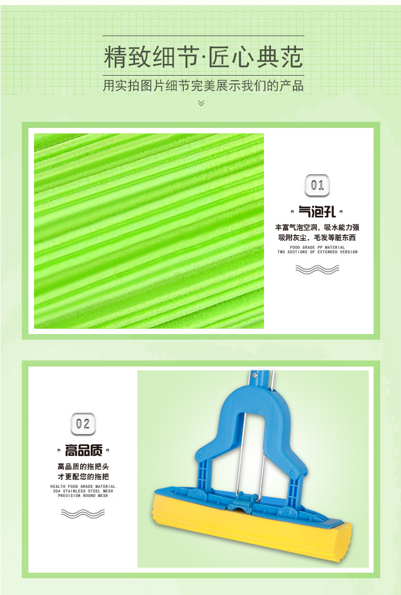 全新升级,符合人体身高,清洁不劳累,海绵头是普通吸水效果的3至5倍,快速擦干陶瓷地板木地板的水渍,有效防止陶瓷地板打滑及木地板腐烂