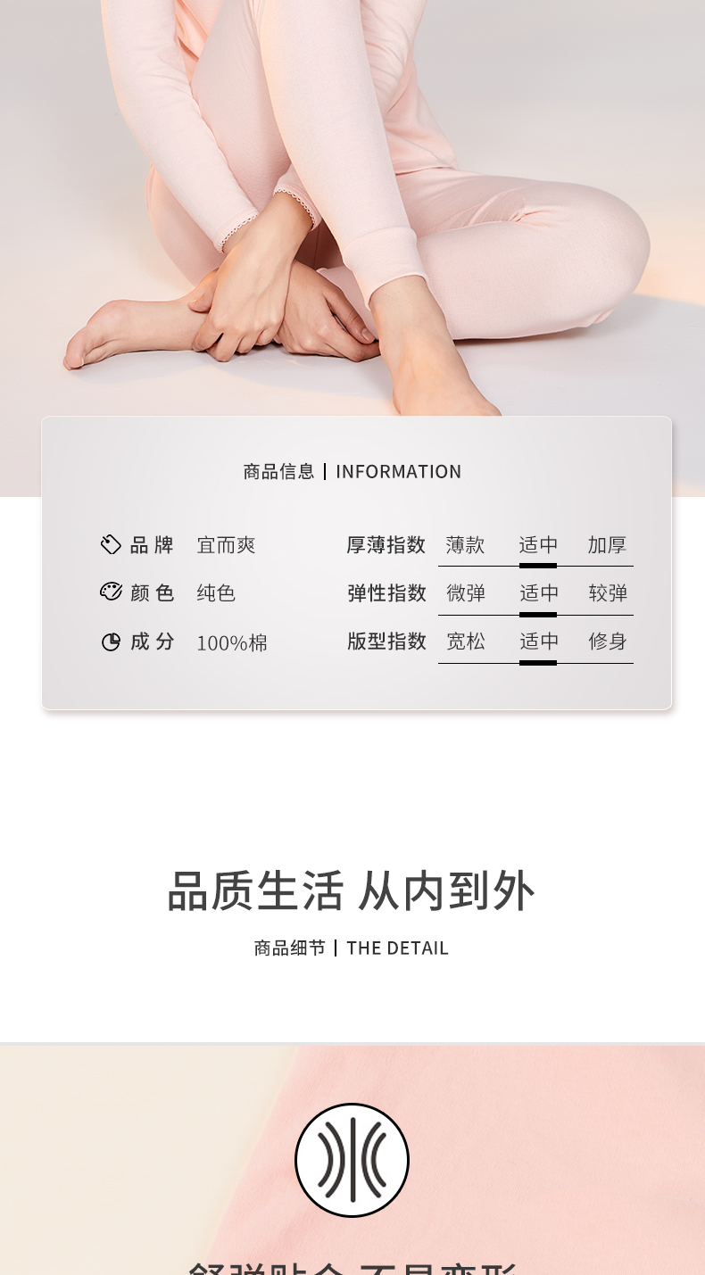 宜而爽女士纯棉秋衣秋裤套装全棉圆领保暖内衣弹力修身棉毛衫裤