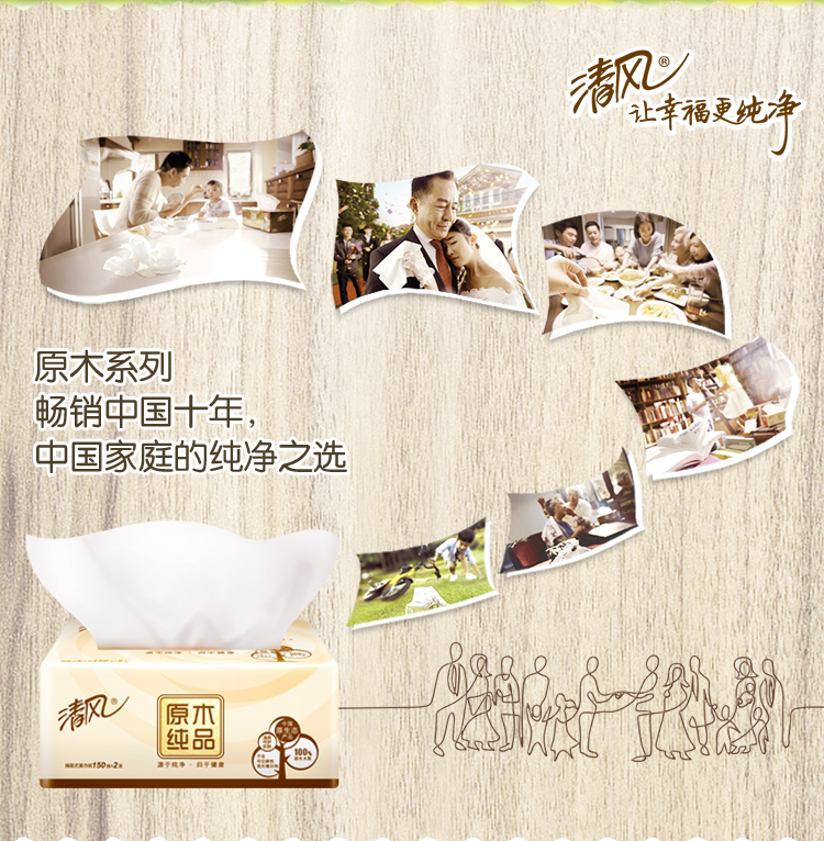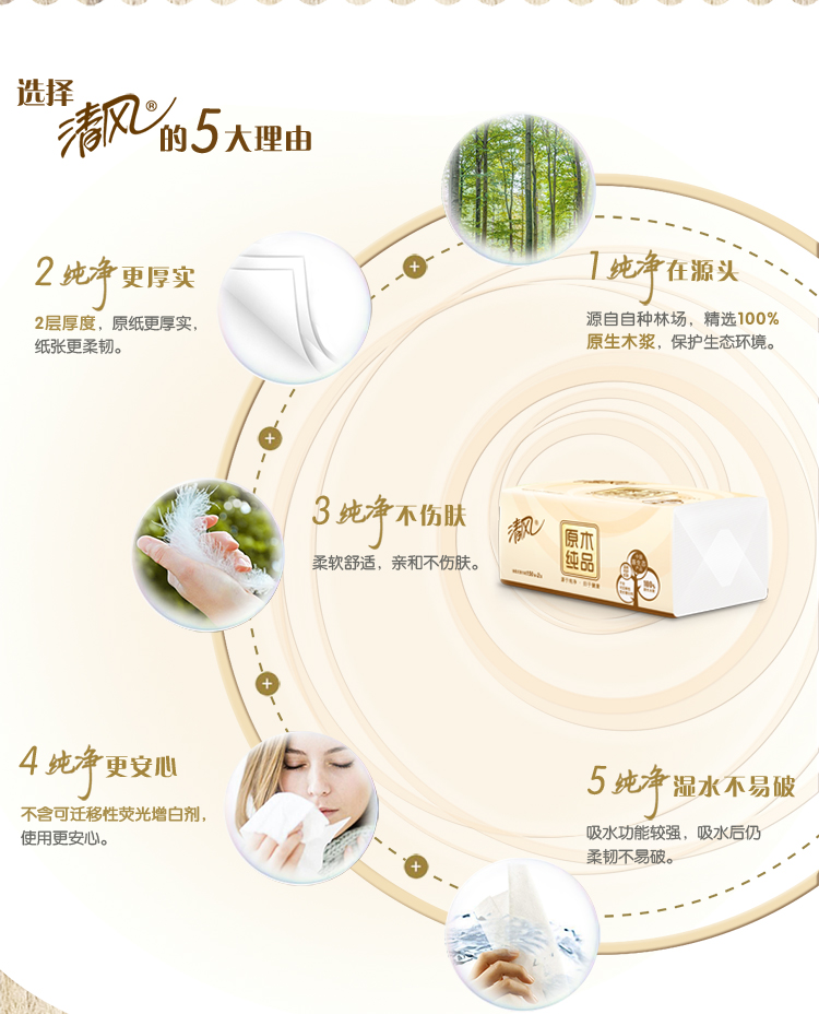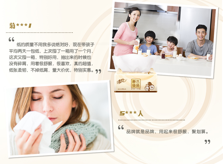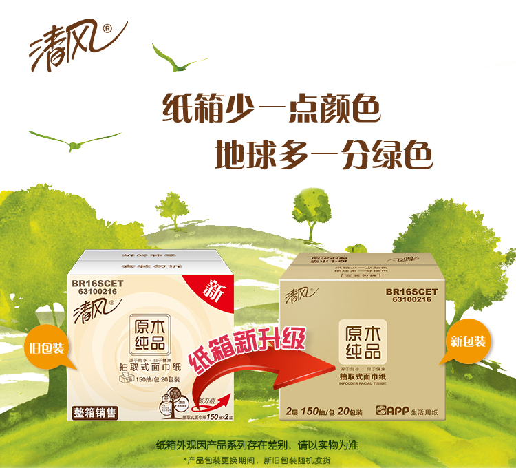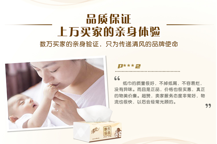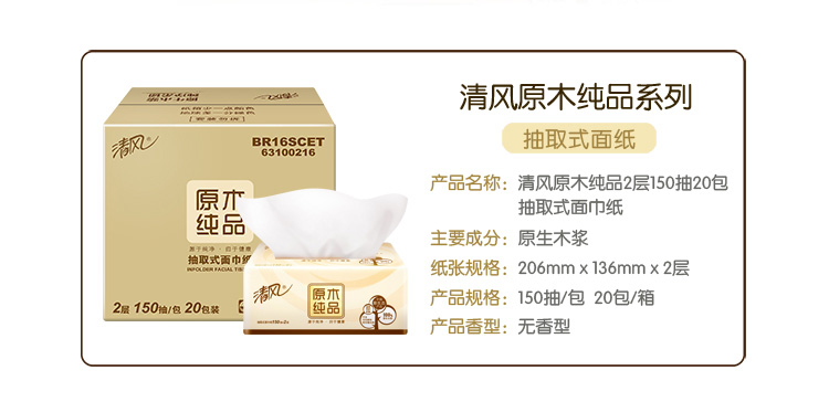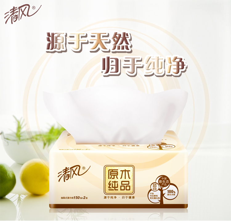 清风品牌高端纸品系列,原木金装3层纸抽,每包130抽,绿色原料,自然柔白,不含荧光剂!源于天然归于纯净的品质,确保纸品质量的同时也带来柔软的亲肤体验!