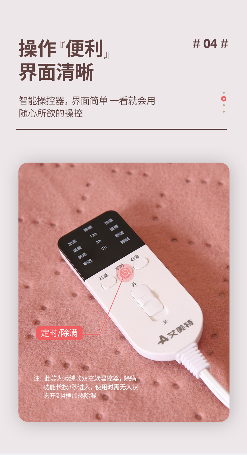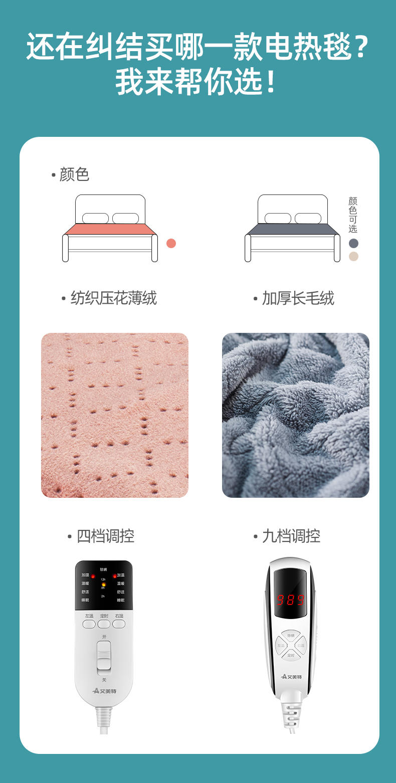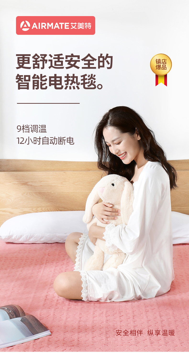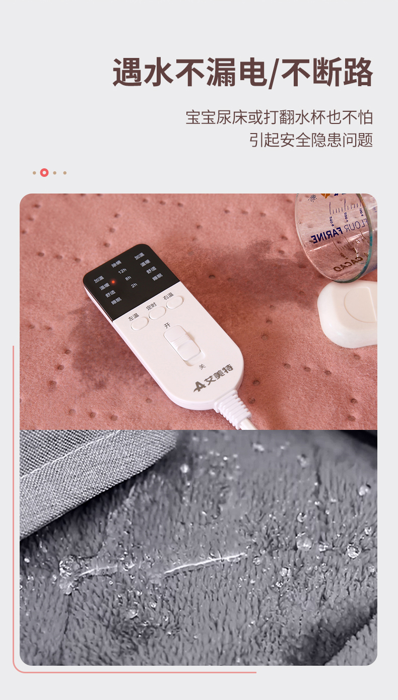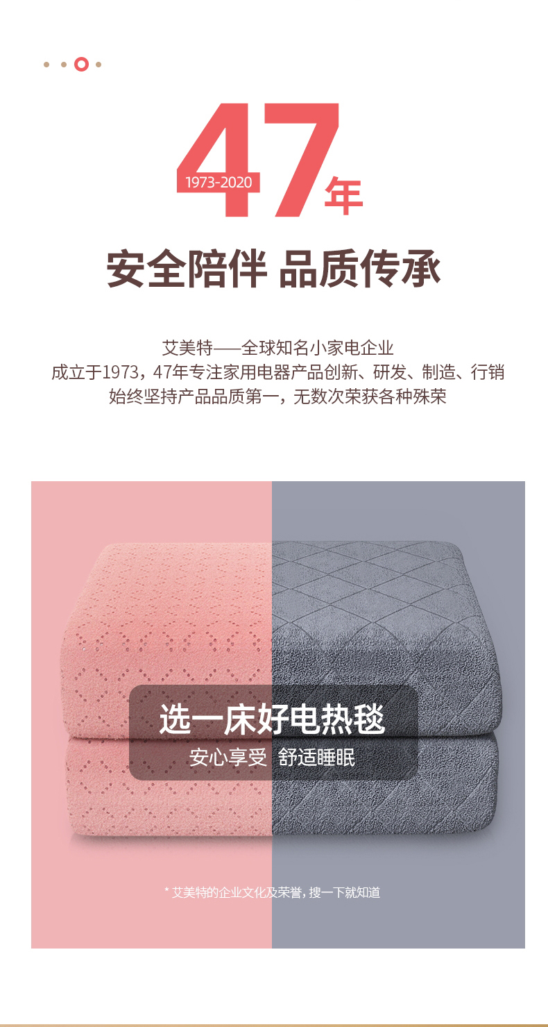【艾美特】温和不上火的电热毯,安全防水,均匀发热,舒适安全,面料柔软细腻,保暖性强,人性化设计,不口干不上火,调温除湿,让这个冬天不再寒冷!这价格,抢到就是赚到!