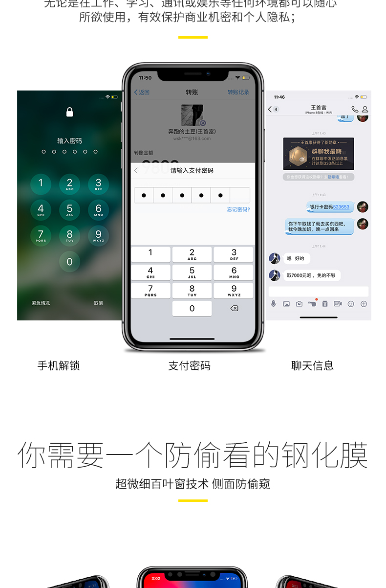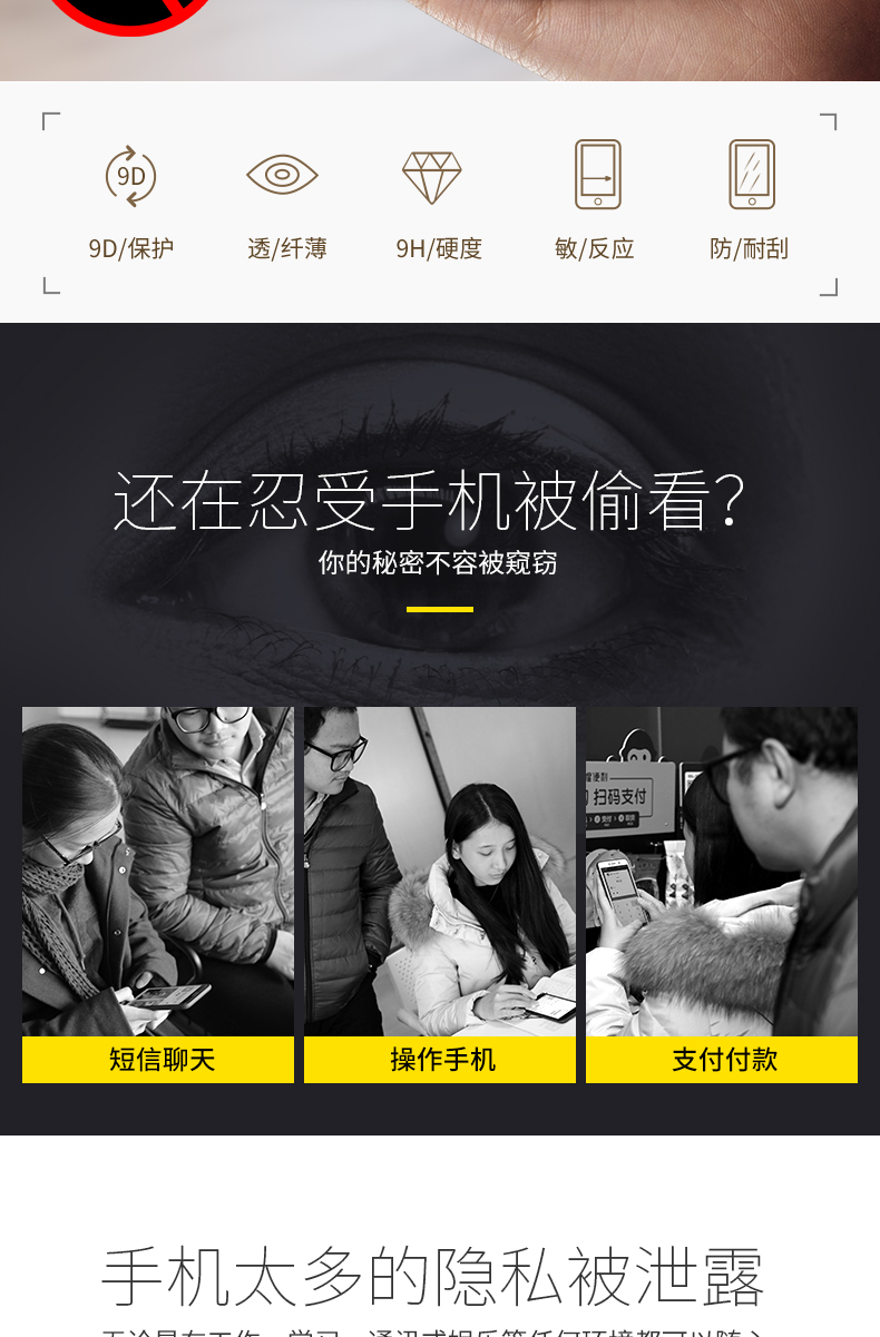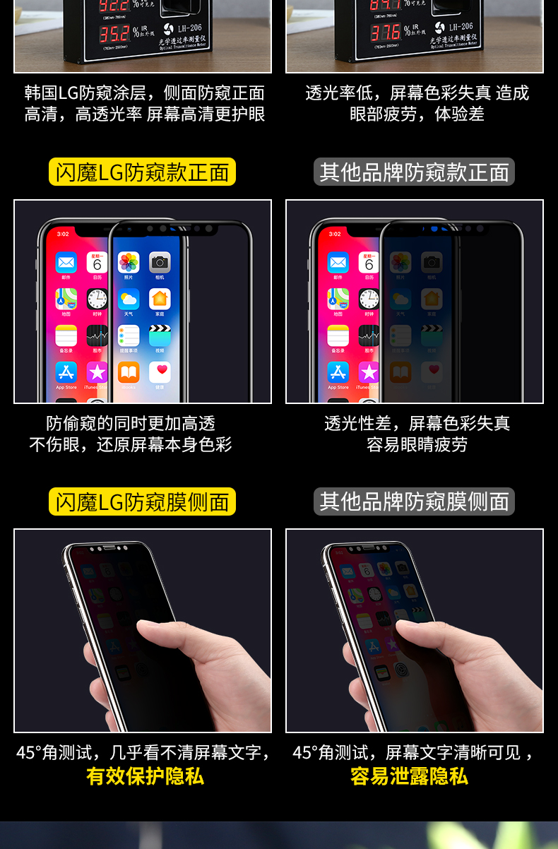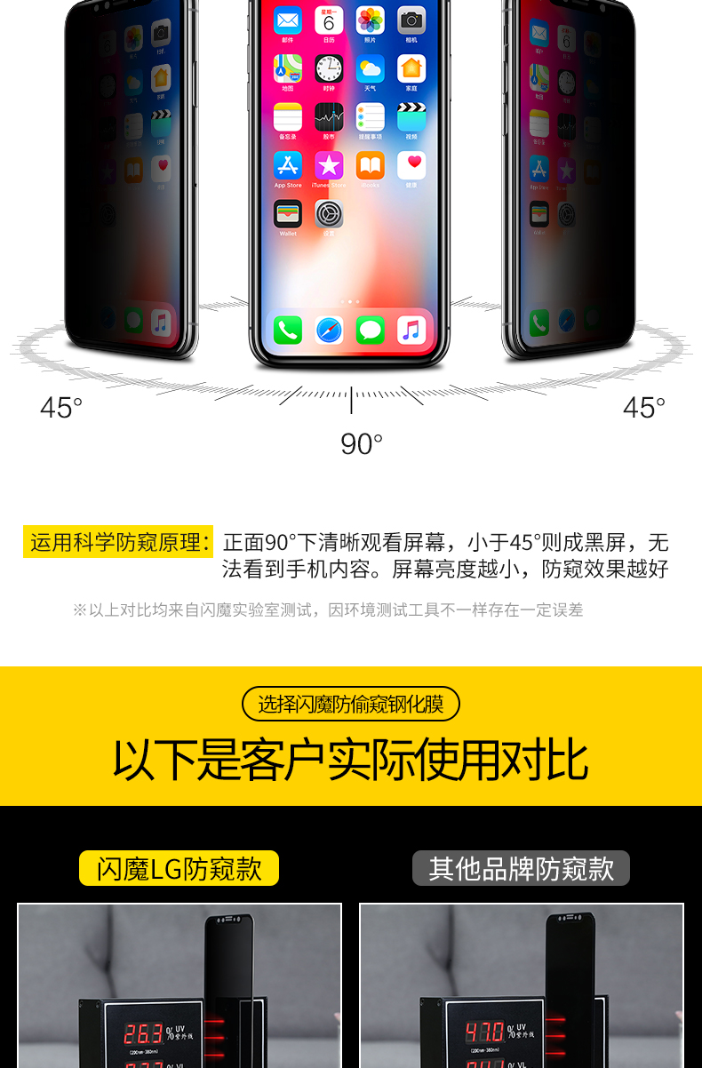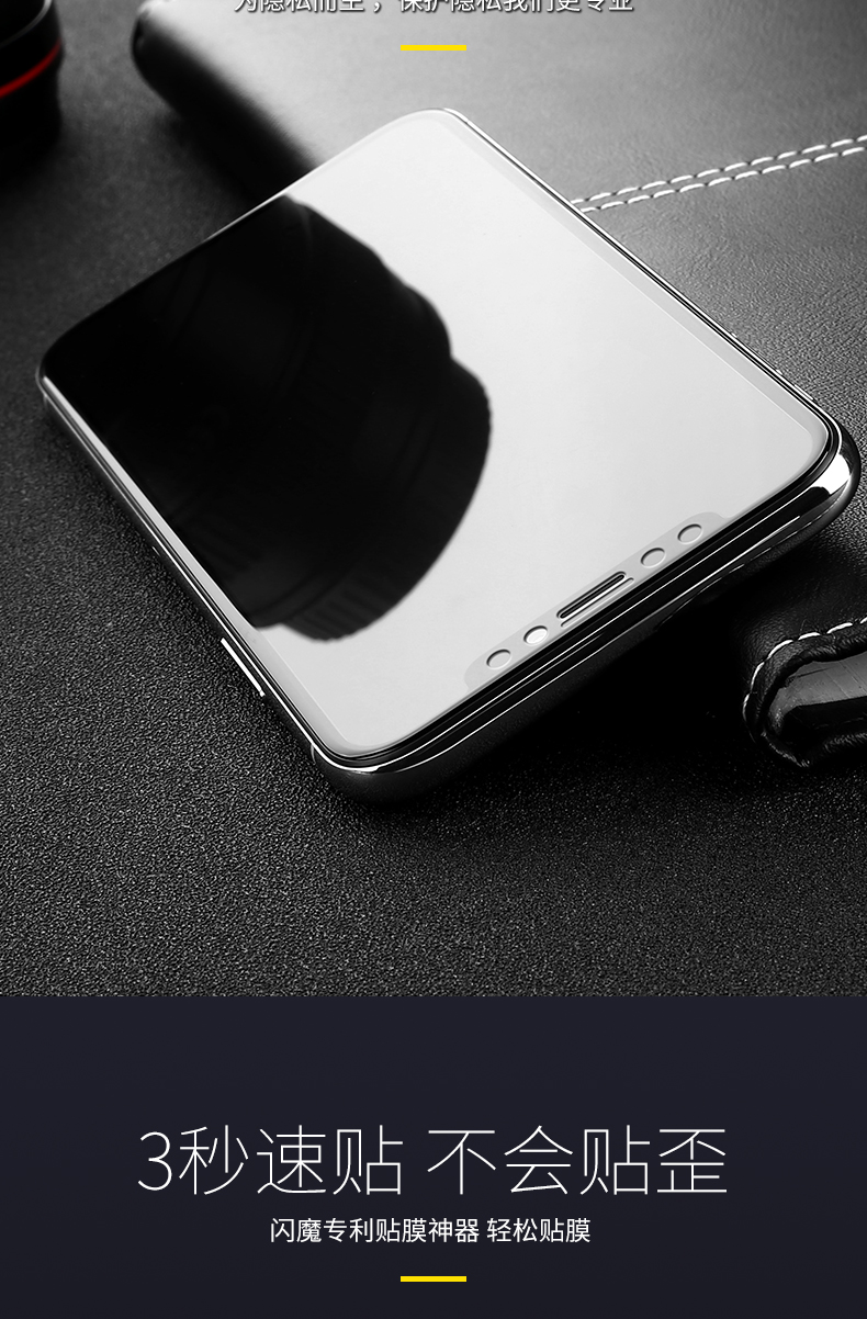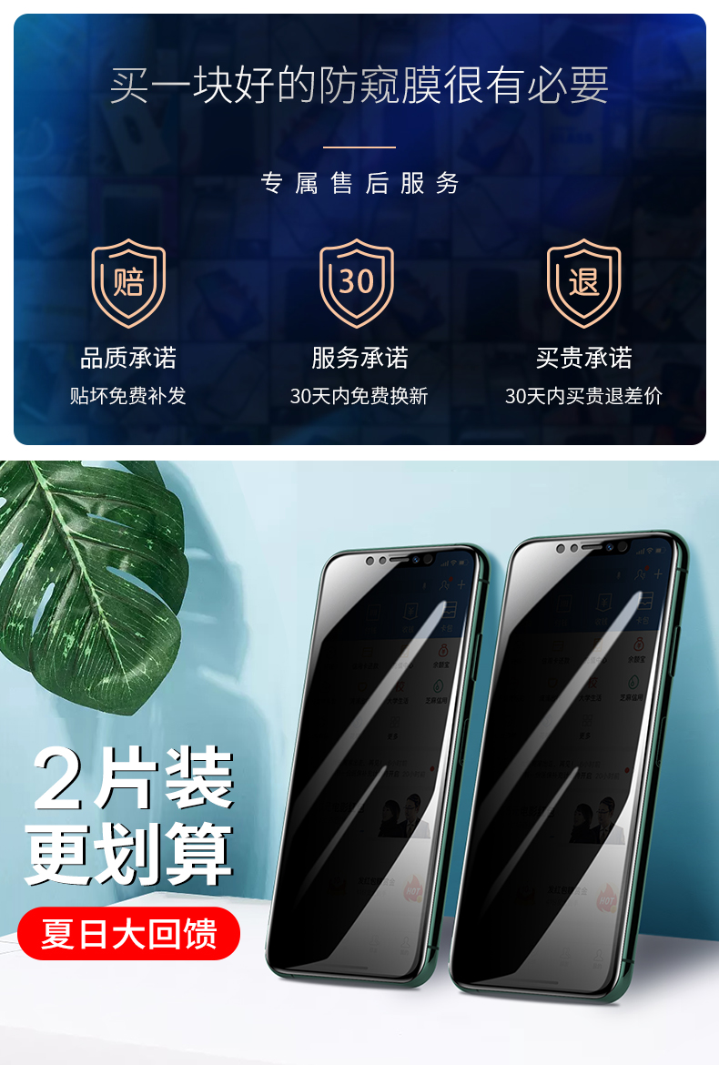 4.8高评分,特惠2片装,韩国LG真防窥,30天贴坏包赔,全屏覆盖,强抗指纹,疏水疏油,一抹干净,手感好不易碎边,耐磨耐刮,透光性高,保证不贴歪,天猫正品,放心购买,贴好膜,用闪魔,赠运险费!