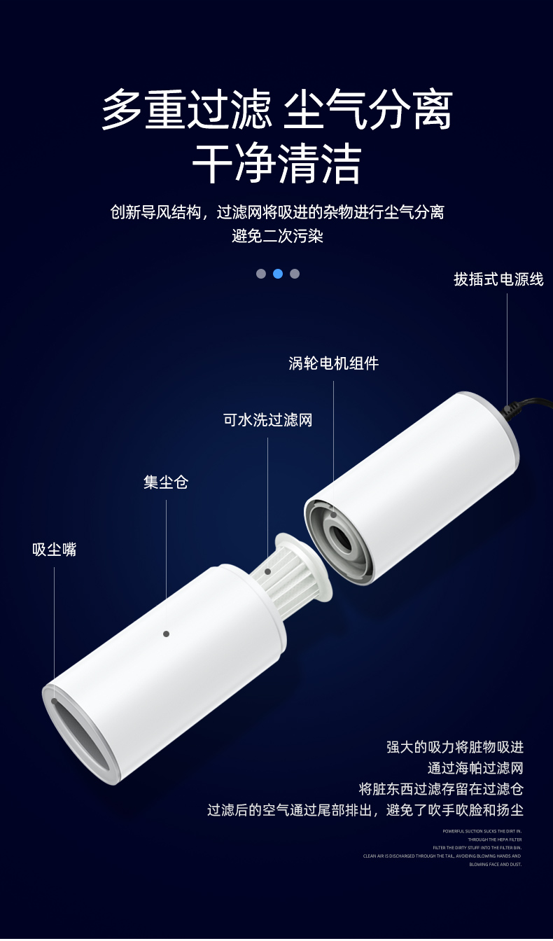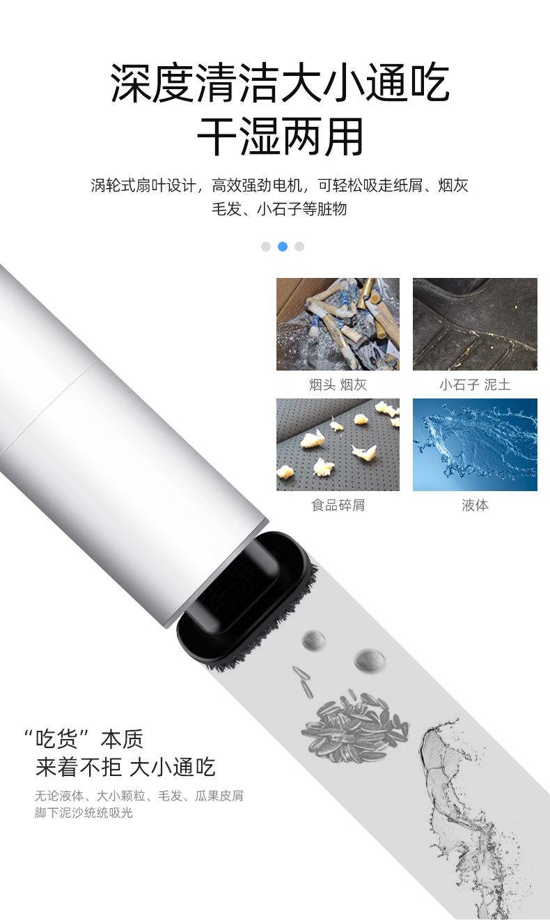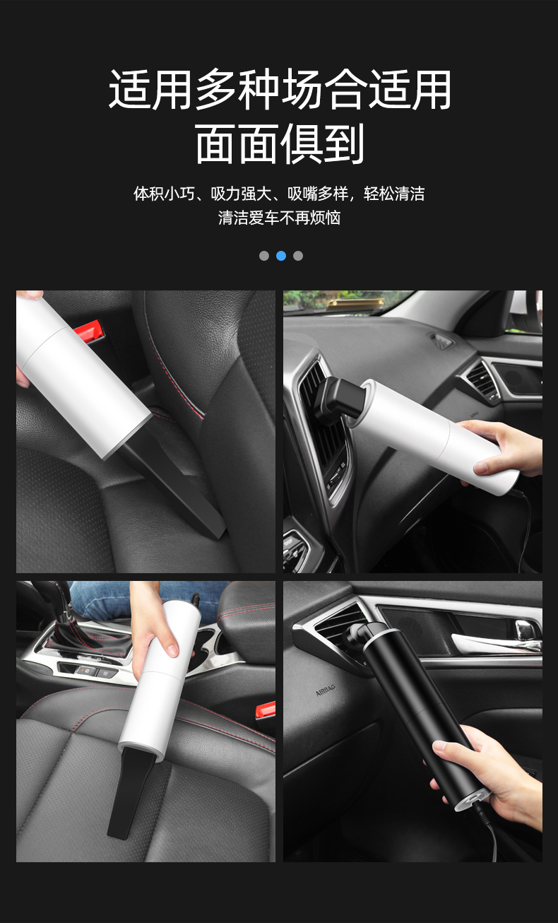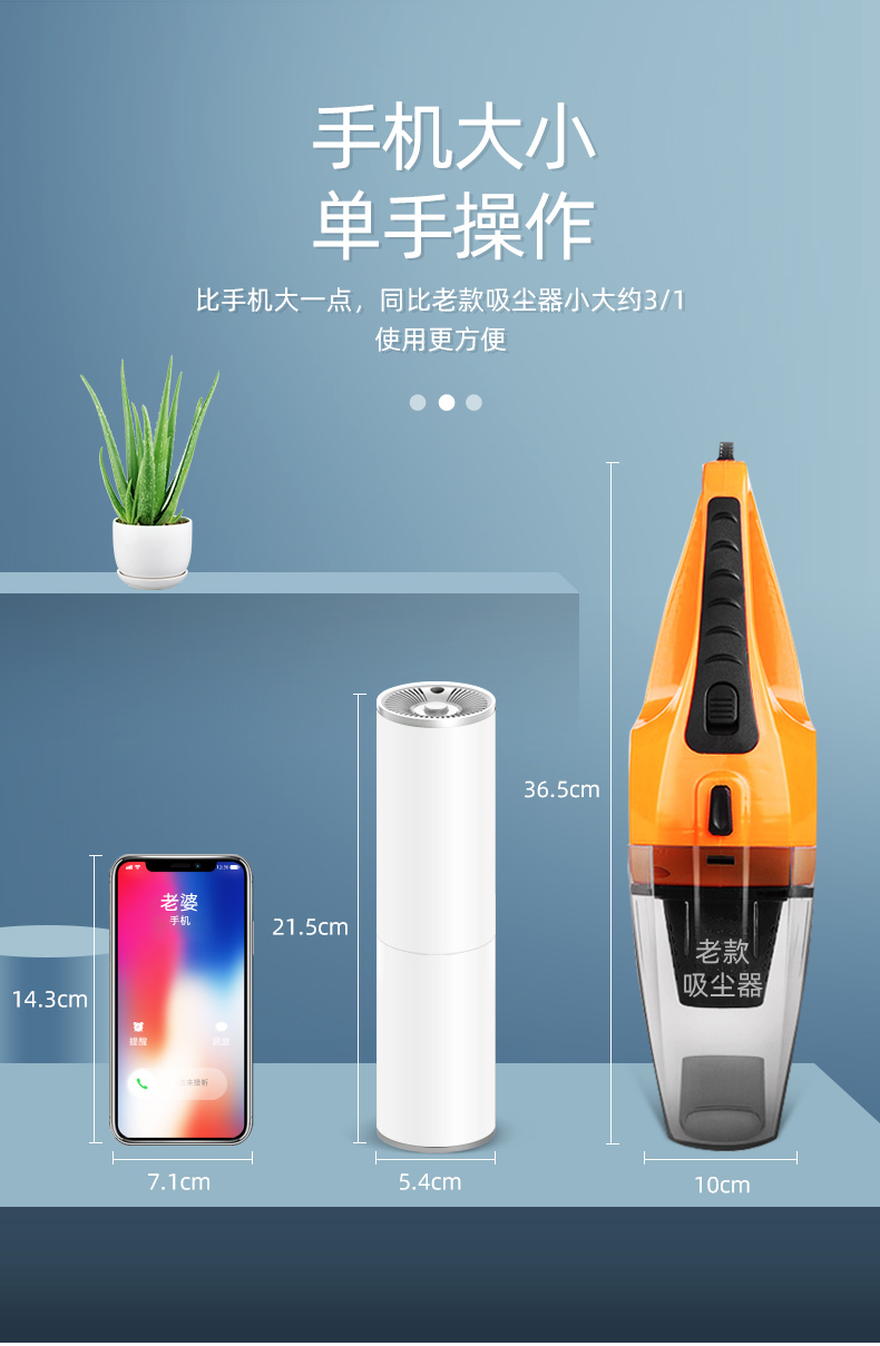【推荐理由】:强劲大功率大吸力,家车两用,迷你机身,安静工作,两侧排气,高效清洁,一键倒尘更便捷。声音低沉不刺耳