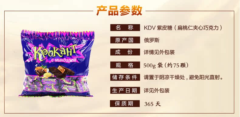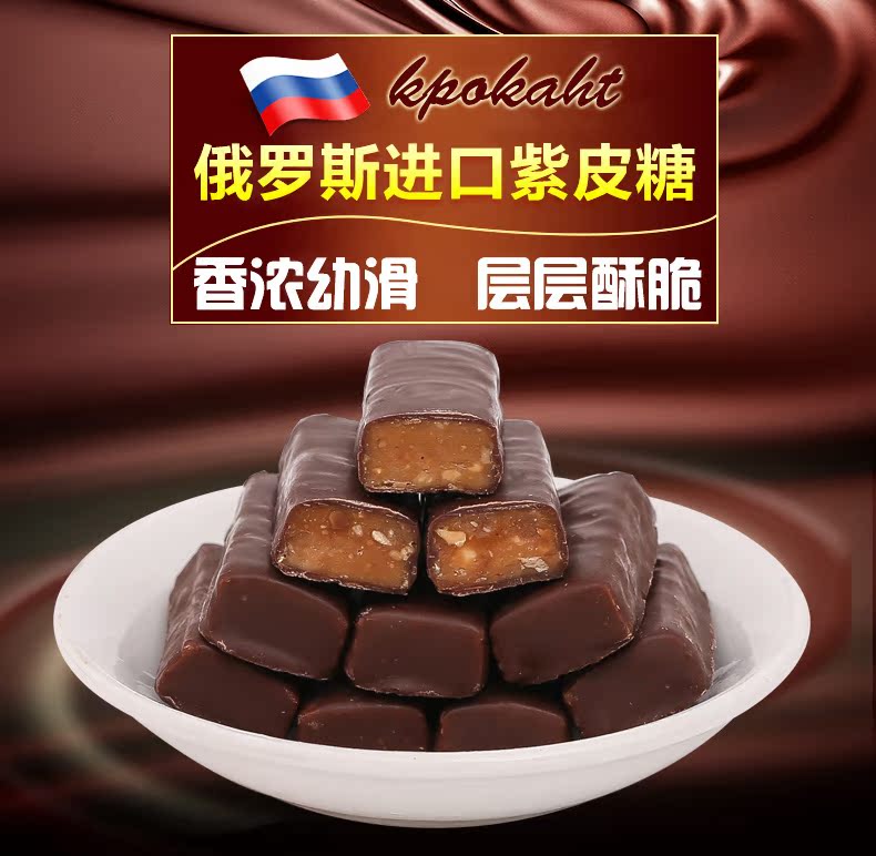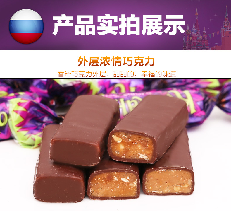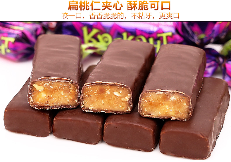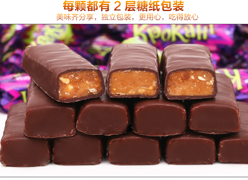 俄罗斯原装进口,浓浓巧克力+碎扁桃仁夹心,香浓幼滑,层层酥脆,香甜美味,每一颗都让你享受俄罗斯风情!