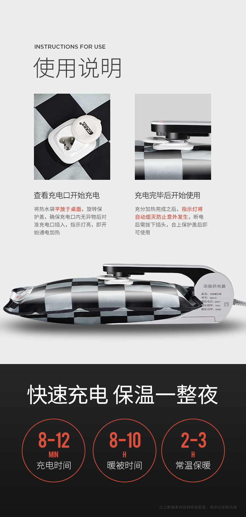 温暖不止一点点,快速加热,充电十分钟,温暖一整晚,长效保温!底袋多层防爆,内已注水,水电分离,智能控温,达到温度后自动切断电源!使用更安心!【赠运费险】