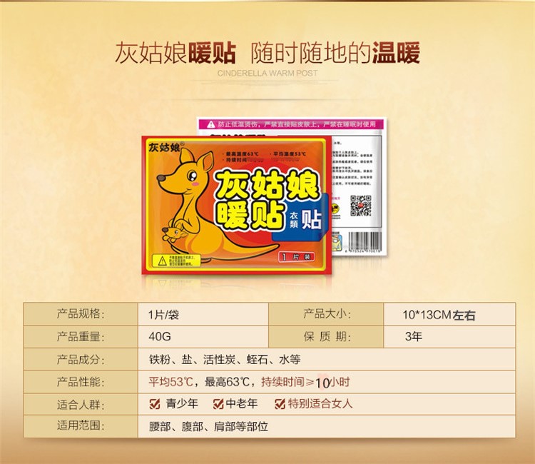灰姑娘旗舰店,50贴19.9¥,淘大牌,恒温持久,品质保证,灰姑娘大号暖身贴,暖宫驱寒保暖,持续发热10小时,持久保暖,抵御严寒,暖暖的很舒服。