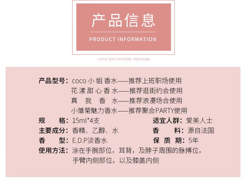 幽香醉人的牡丹,爱情执着的铃兰花,朴实典雅的茉莉,向着朝阳的小邹菊,总有一款适合美丽的你。喷1次飘香一整天,上班职场、逛街约会、激情、聚会等场合一套搞定!