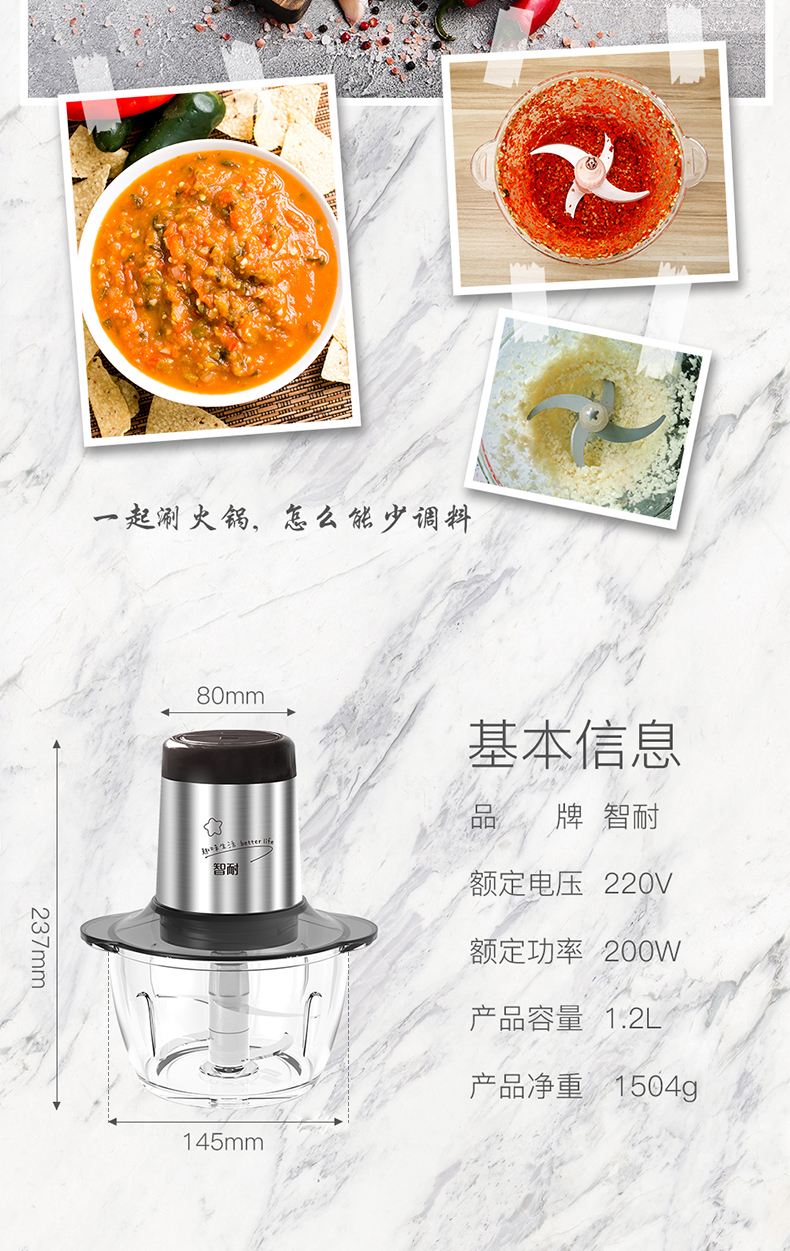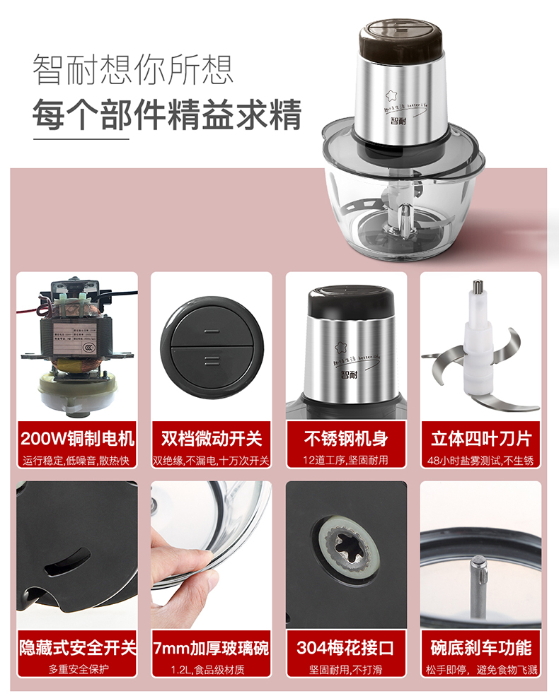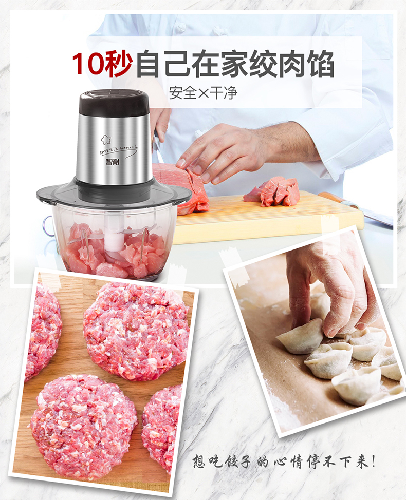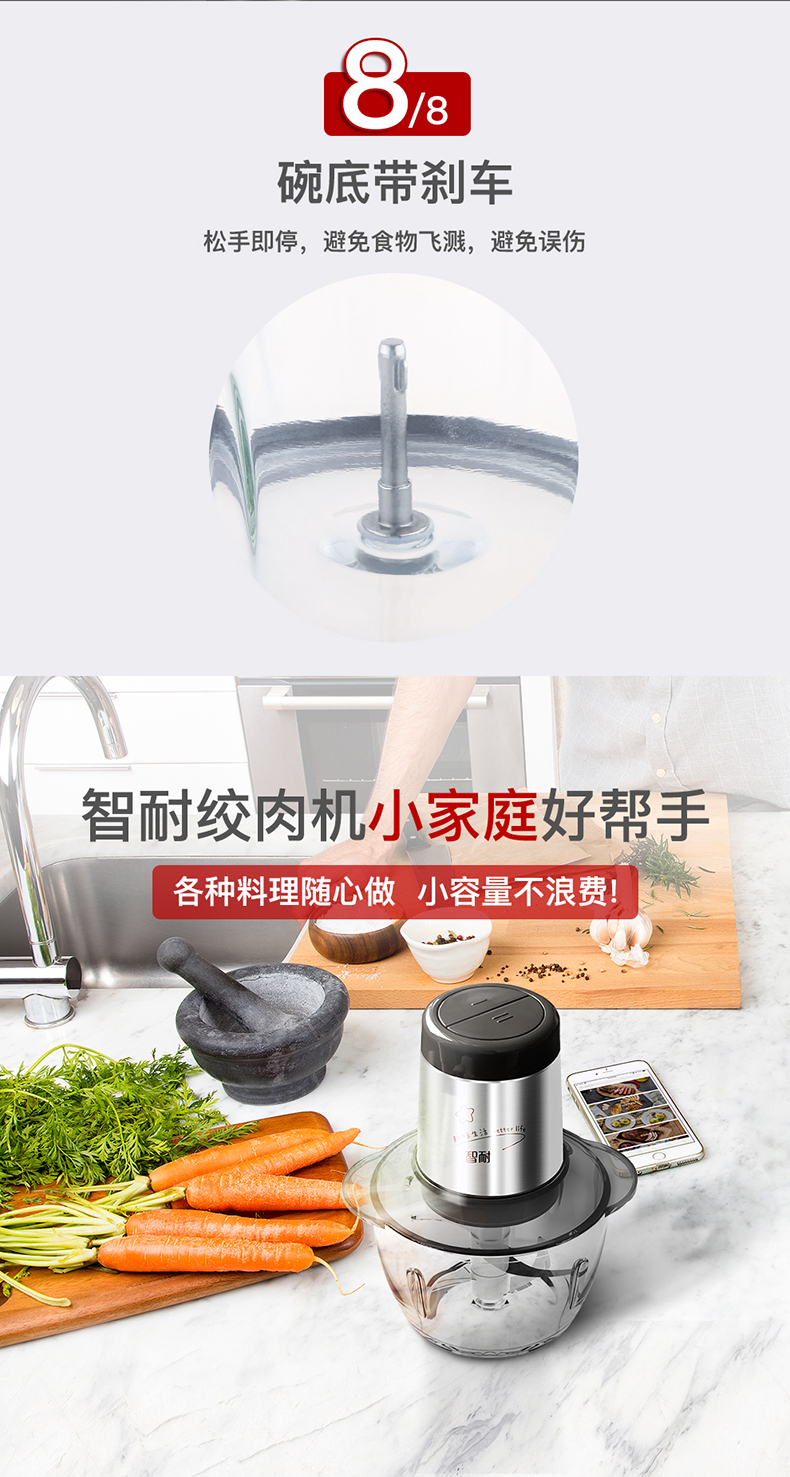【智耐绞肉机,7天无理由退货,赠运险费】一机多能、轻松料理。动力强、易操作、更安全。快慢两即净。轻松驾驭多种食材、随心畅享美味、6秒速绞,告别腰酸手累,无需费时费力。